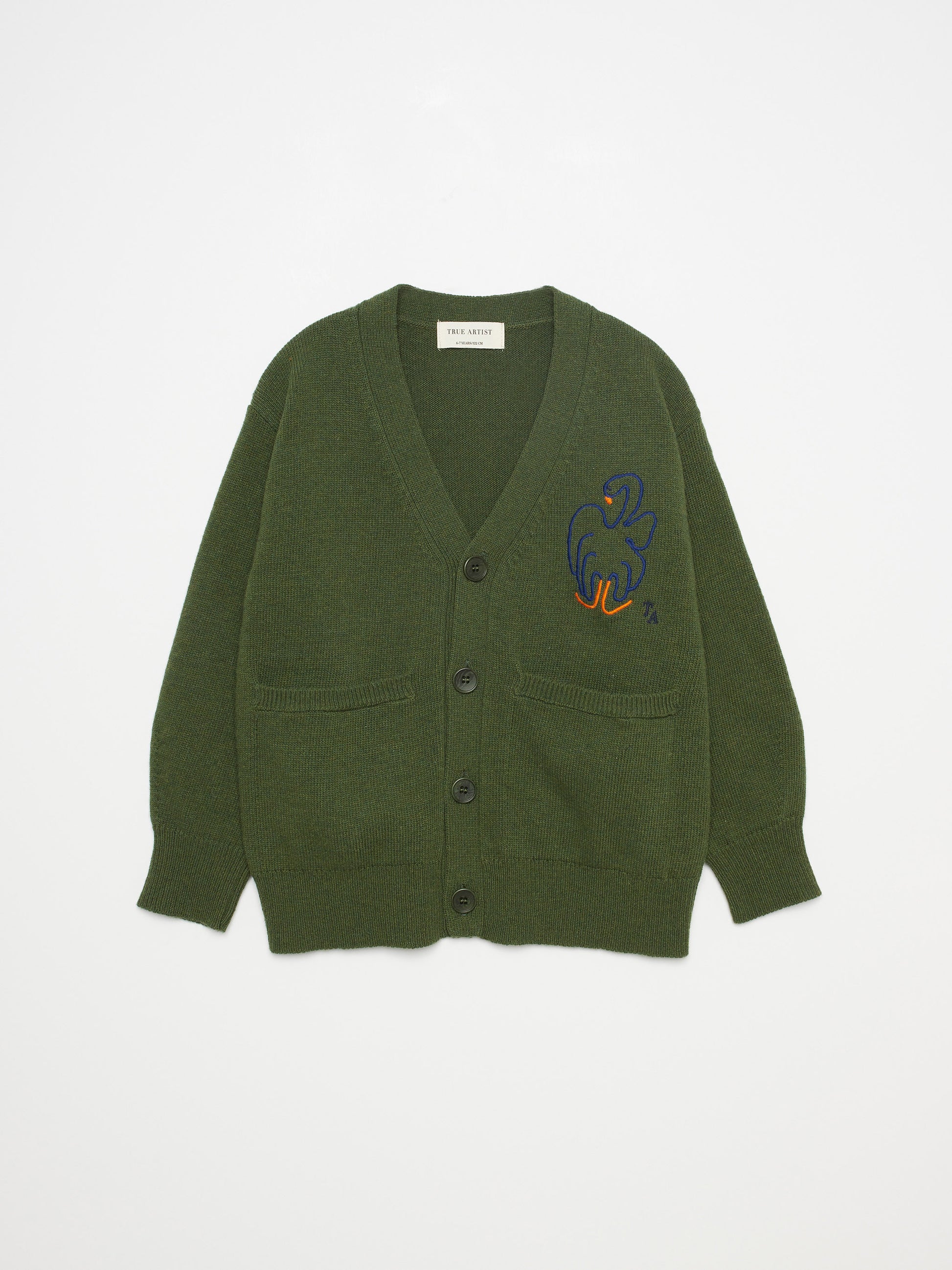 Cardigan nº02 in Pine Green is made of 30% wool, 35% polyamide, 30% viscose and 5% cashmere. It is designed with a v-collar, front button fastening, two pockets on the front and it has Bird Dance embroidery on the chest. It has a relaxed fit. Made in Spain.