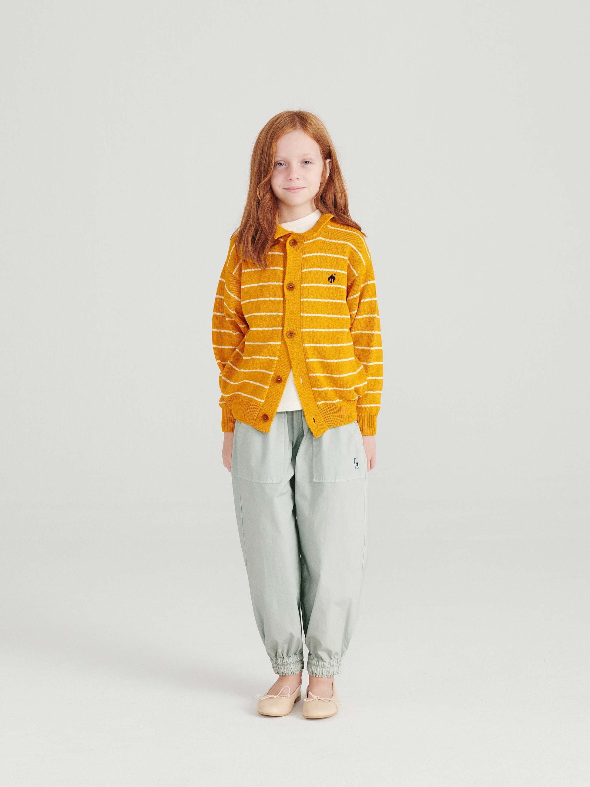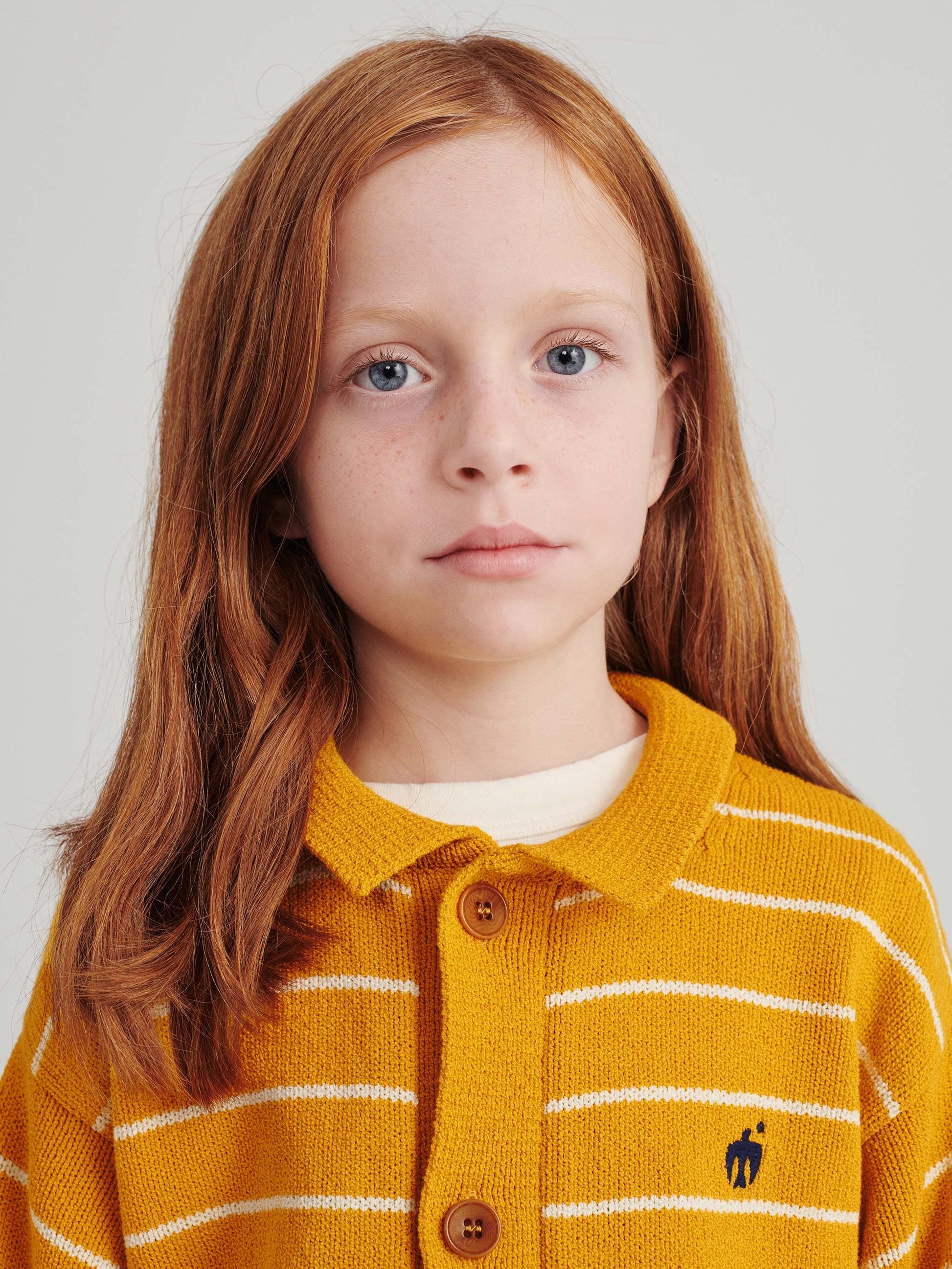 Cardigan nº03 in Curry is striped and made of 75% cotton and 25% polyamide. It is designed with a flat collar, front button fastening, cuffs and bottom are ribbed and it has our bird logo embroidered in yellow on the chest. It has a relaxed fit. Made in Spain.