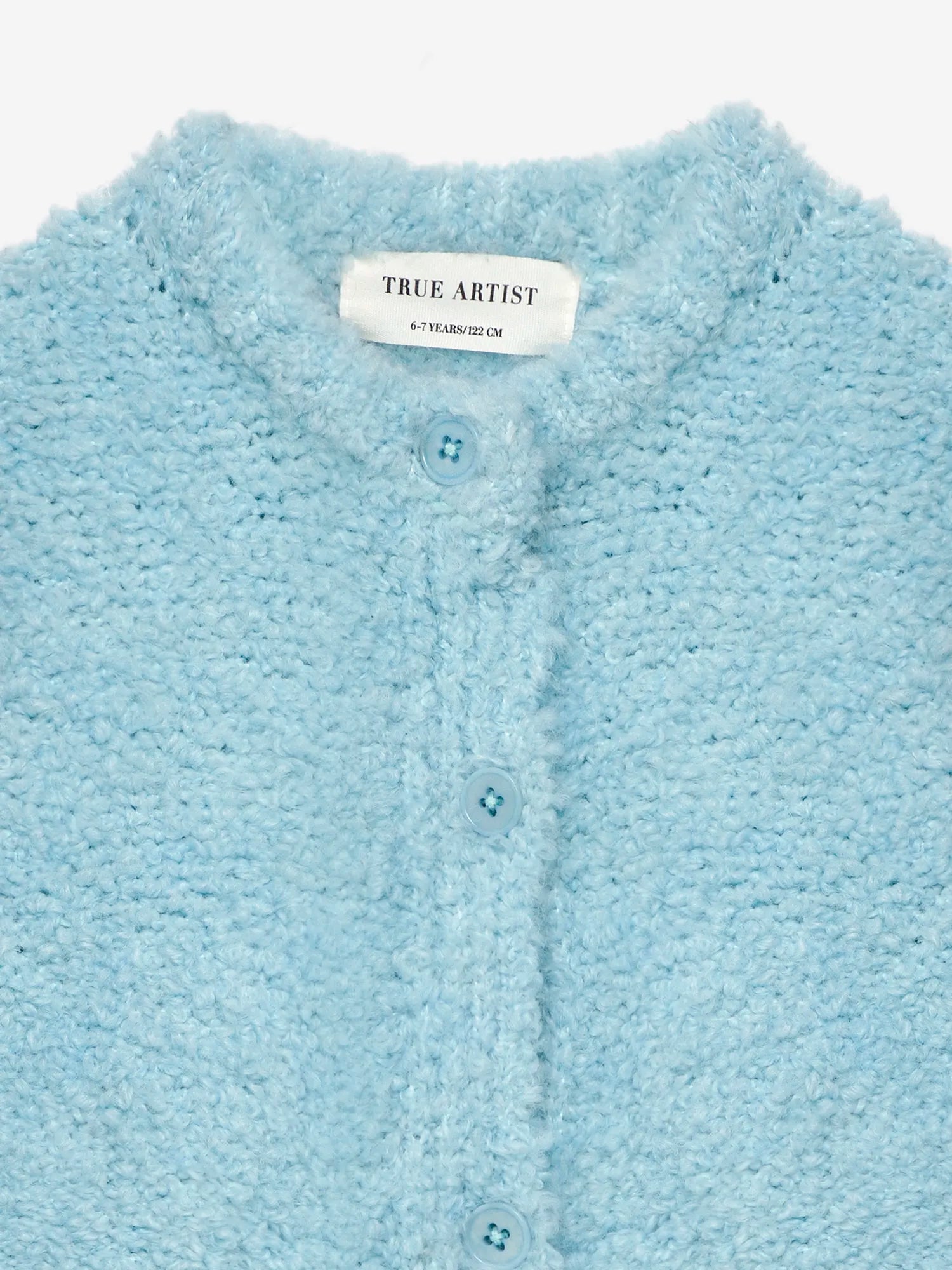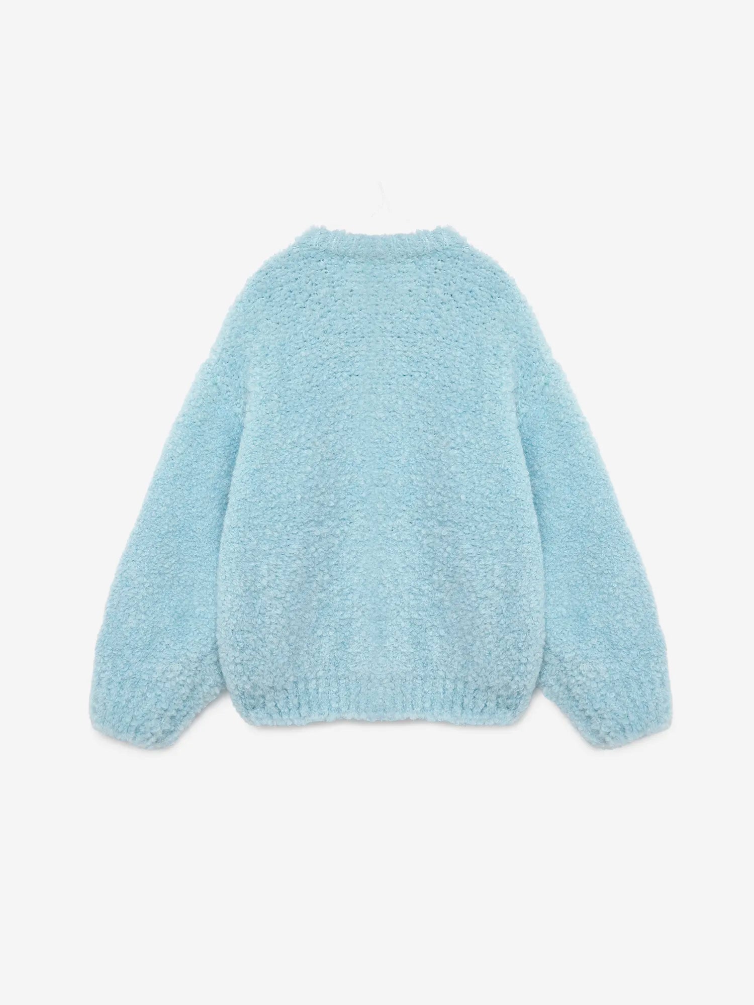 Cardigan nº05 in Lavender is made of 9% Wool, 9% Viscose, 65% Acrylic and 17% Polyamide blend. This soft cardigan is crafted from a bouclé knit in a lovely light blue hue, giving it a textured, fluffy appearance. It features a collarless, round neck design, button-front closure with matching buttons and a TA embroidery in deep violet on the sleeve. The cardigan includes two practical patch pockets on the front, and its relaxed fit makes it perfect for comfortable layering. Made in Spain.