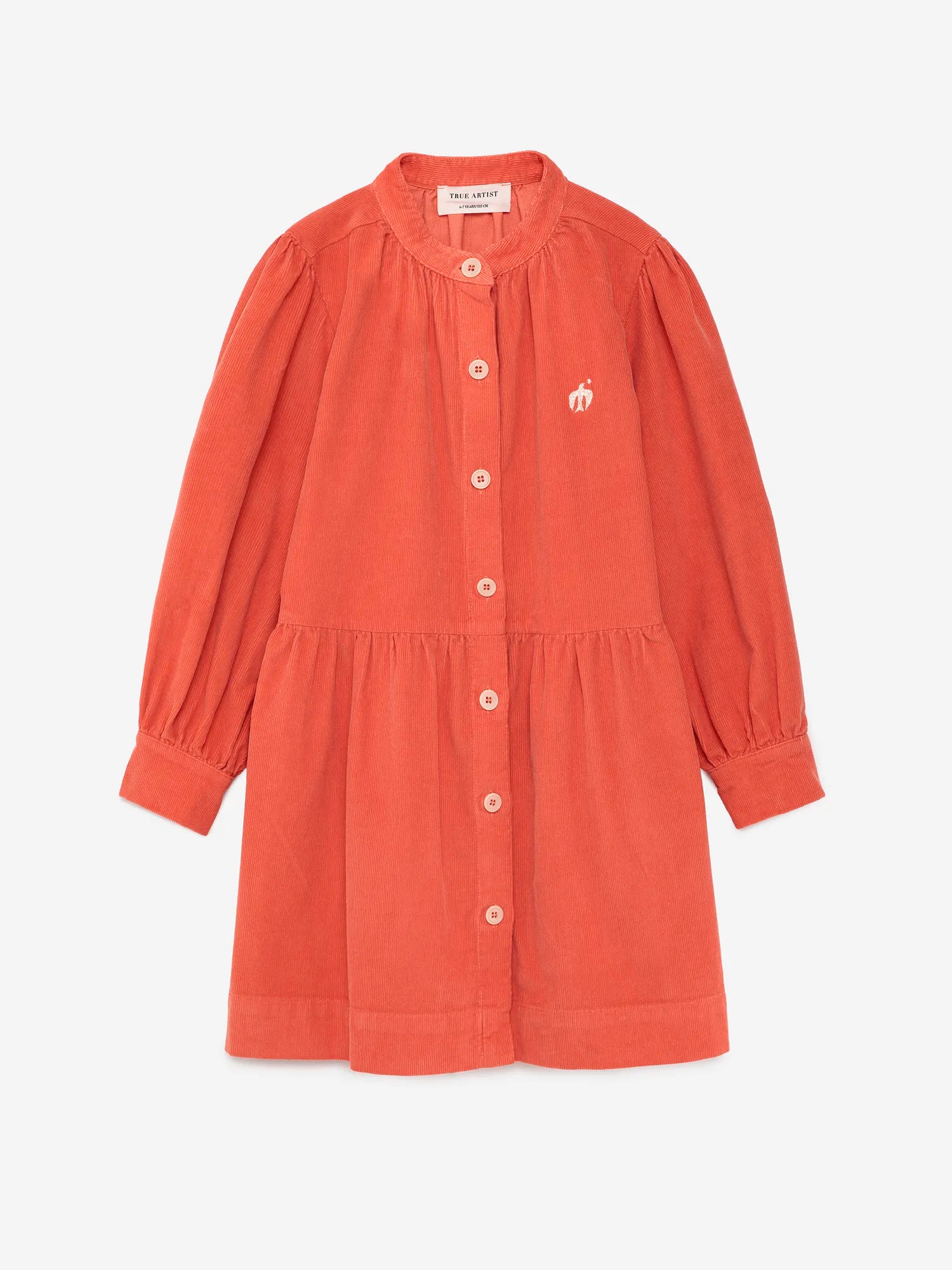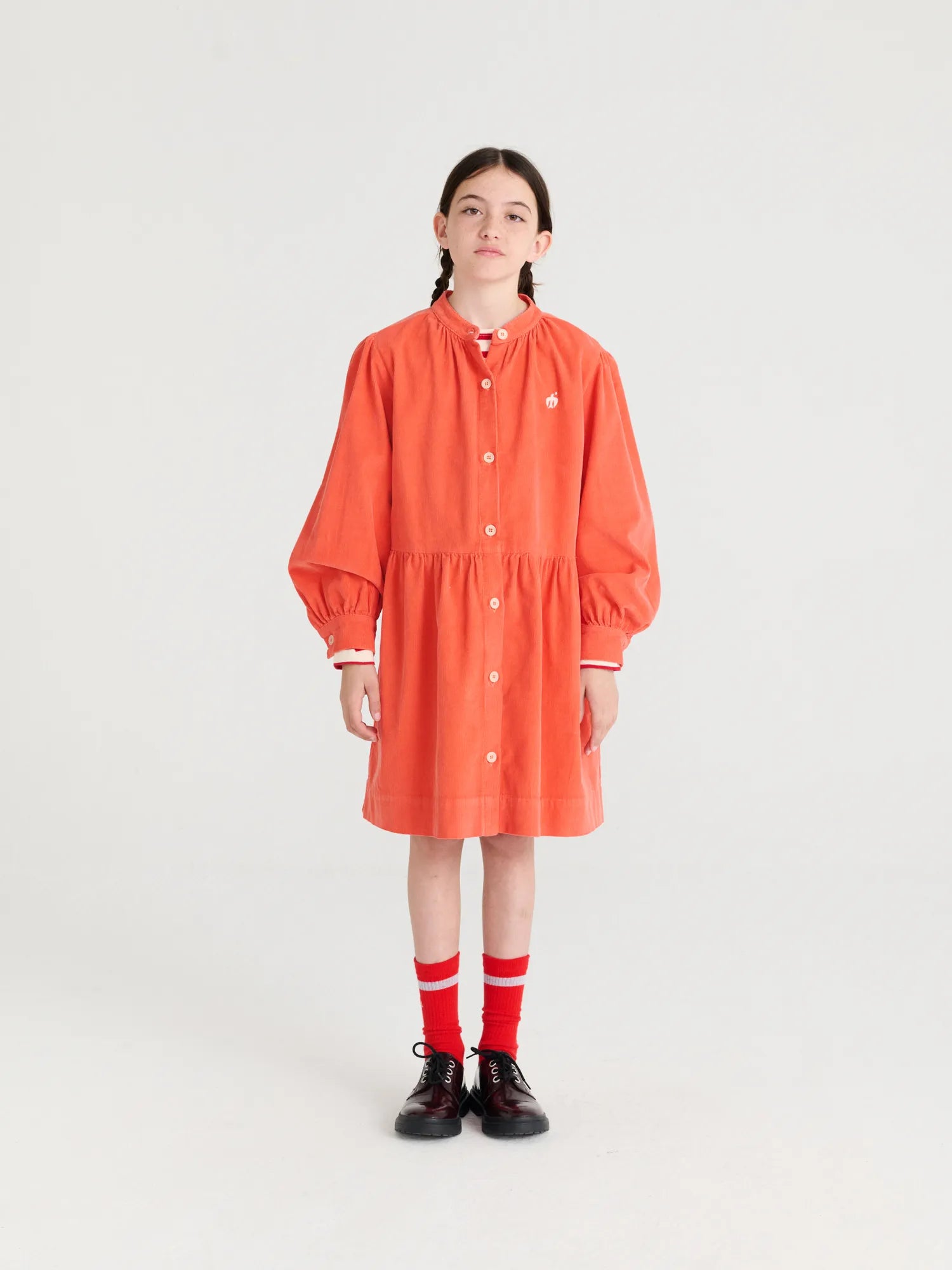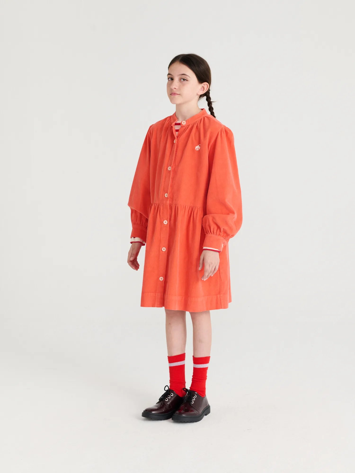 Dress nº15 in Autumn Fig is made of 100% cotton corduroy. This long sleeve dress is designed with buttoned front and cuffs and it features a small embroidery of our bird logo on the chest. It has a loose evasé fit and a midi length. Made in Spain.