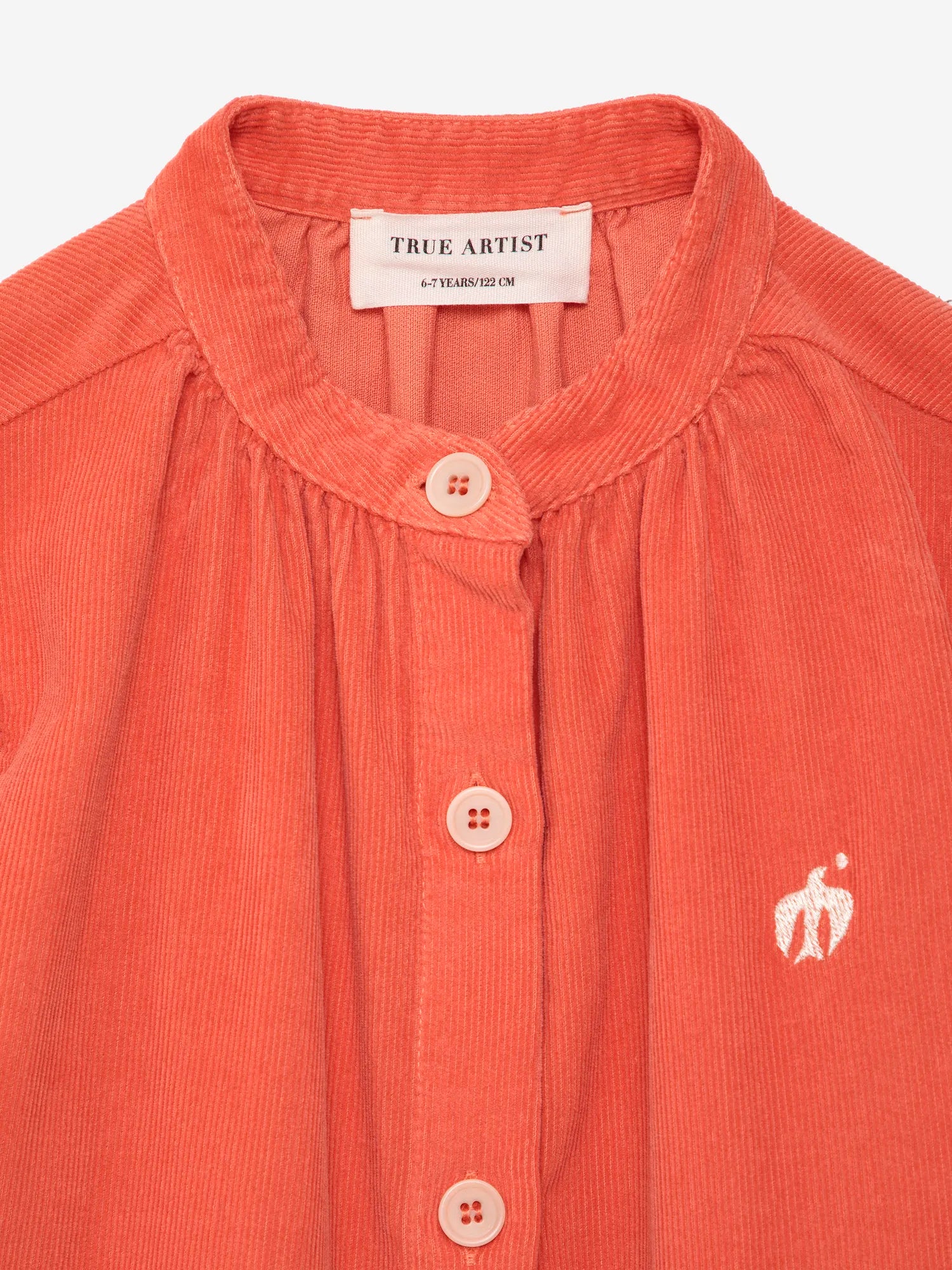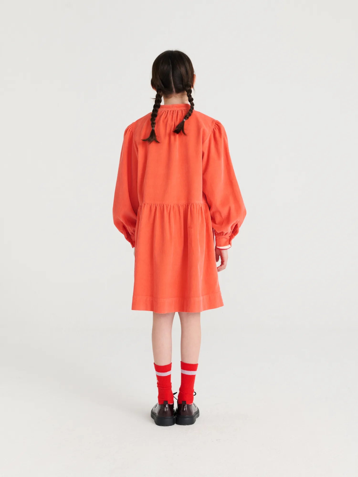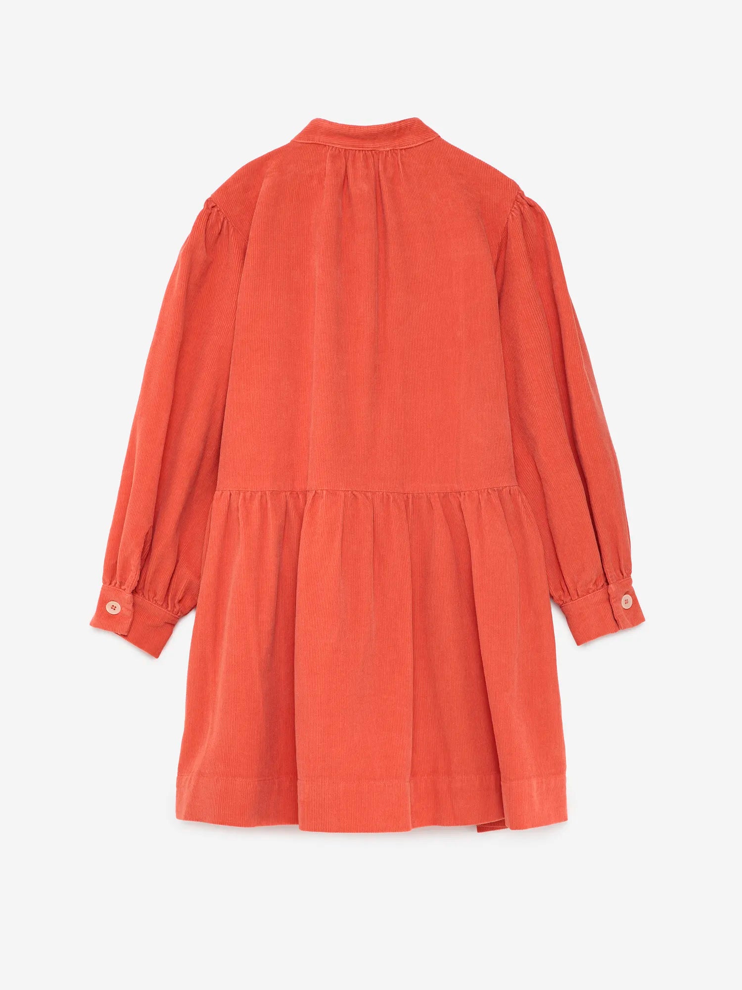 Dress nº15 in Autumn Fig is made of 100% cotton corduroy. This long sleeve dress is designed with buttoned front and cuffs and it features a small embroidery of our bird logo on the chest. It has a loose evasé fit and a midi length. Made in Spain.