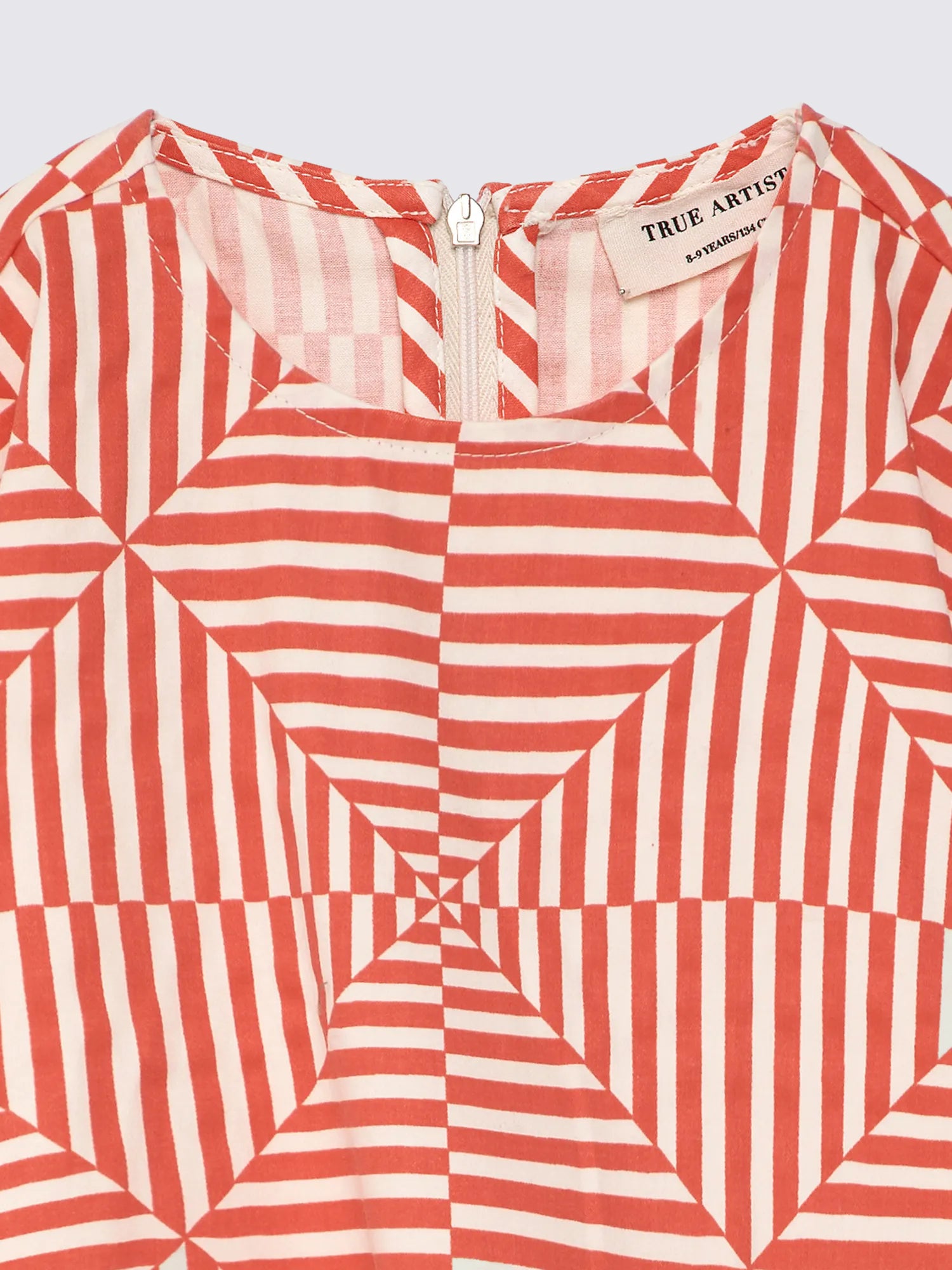 Kaleidoscope Dress is made of 100% cotton. This Étude dress features an artistic all over print with a geometric pattern that creates the effect of movement or depth. It is designed with short sleeve and an invisible zipper at the back. It has a loose fit. Made in Spain.