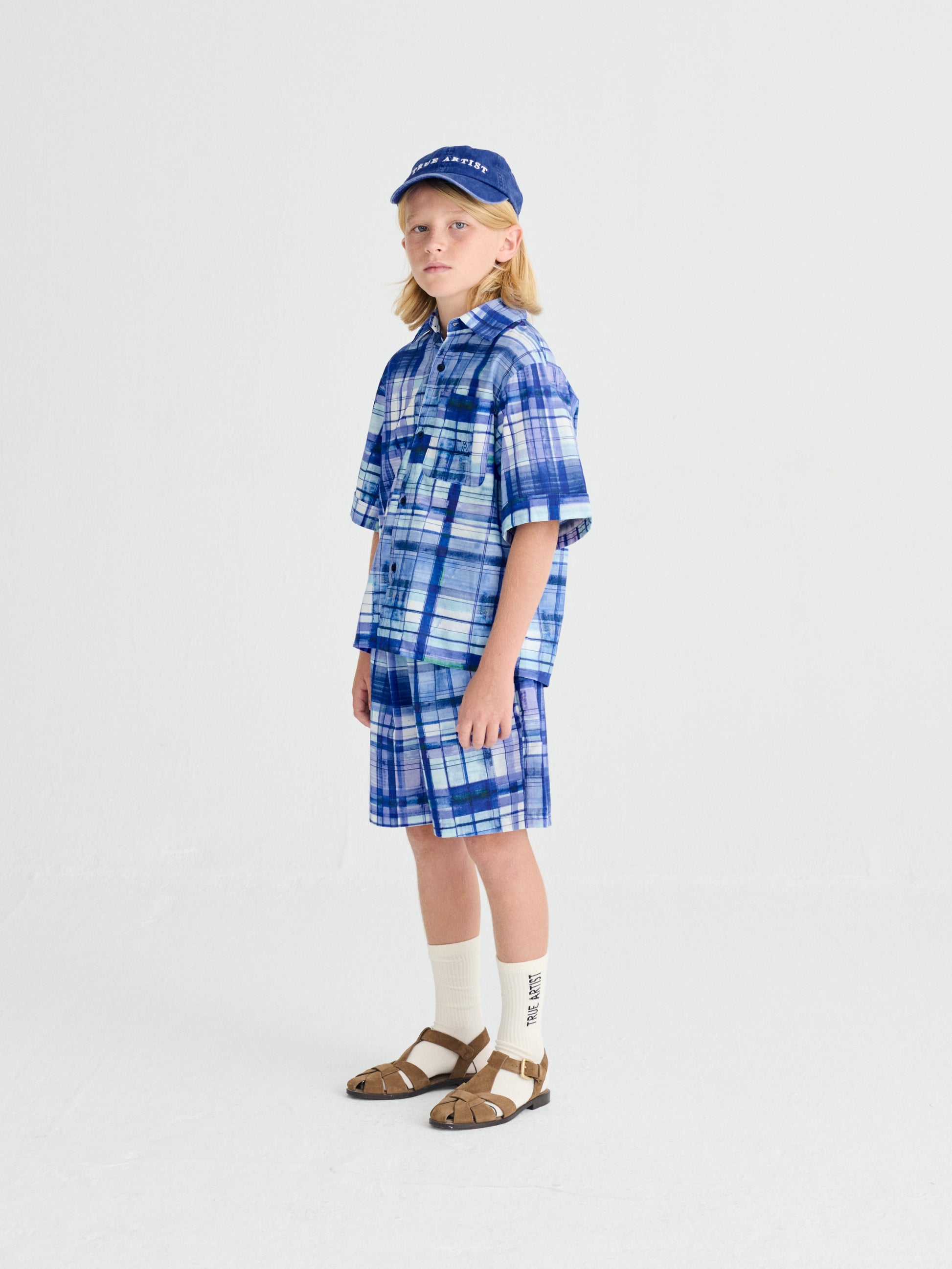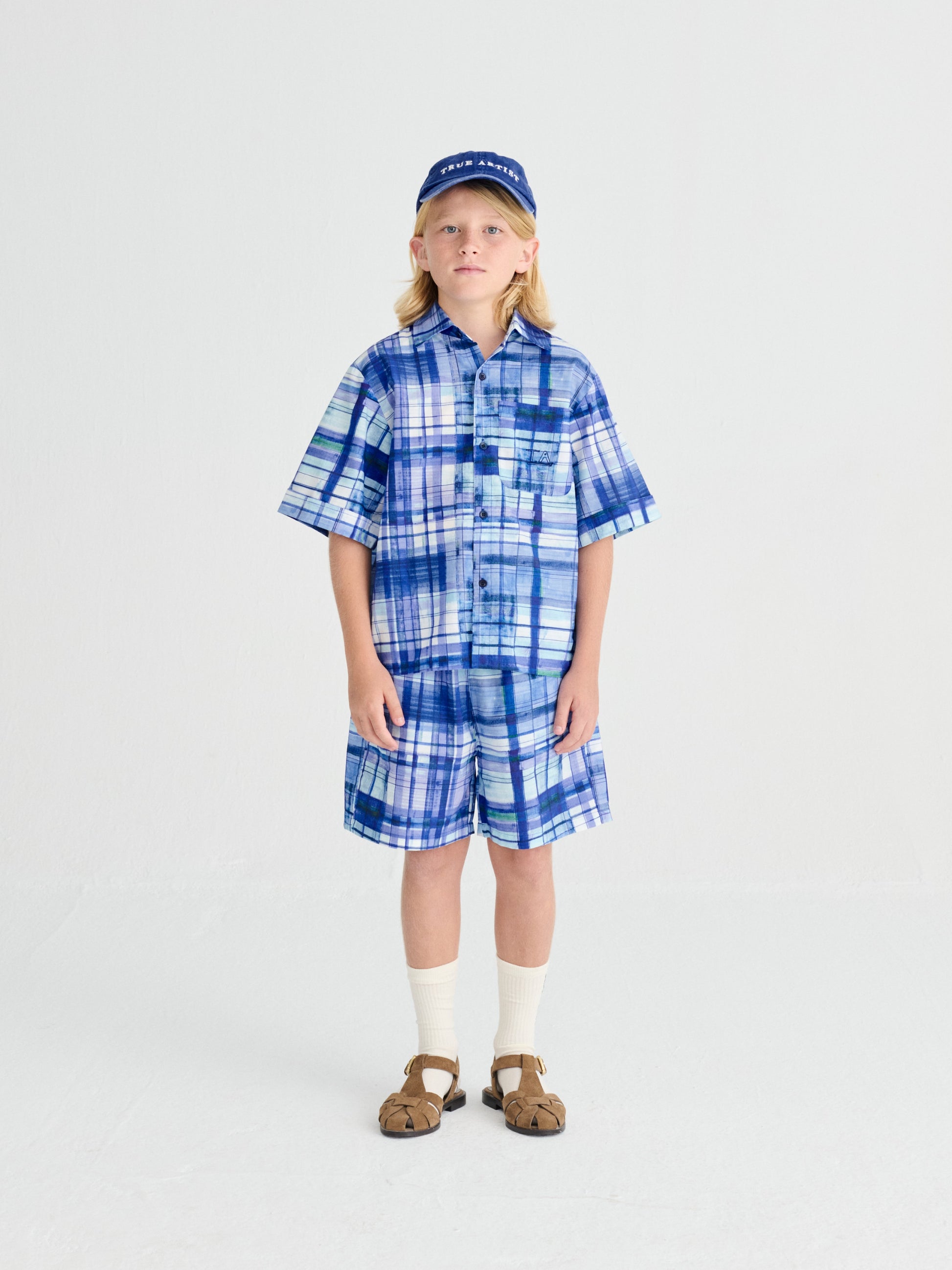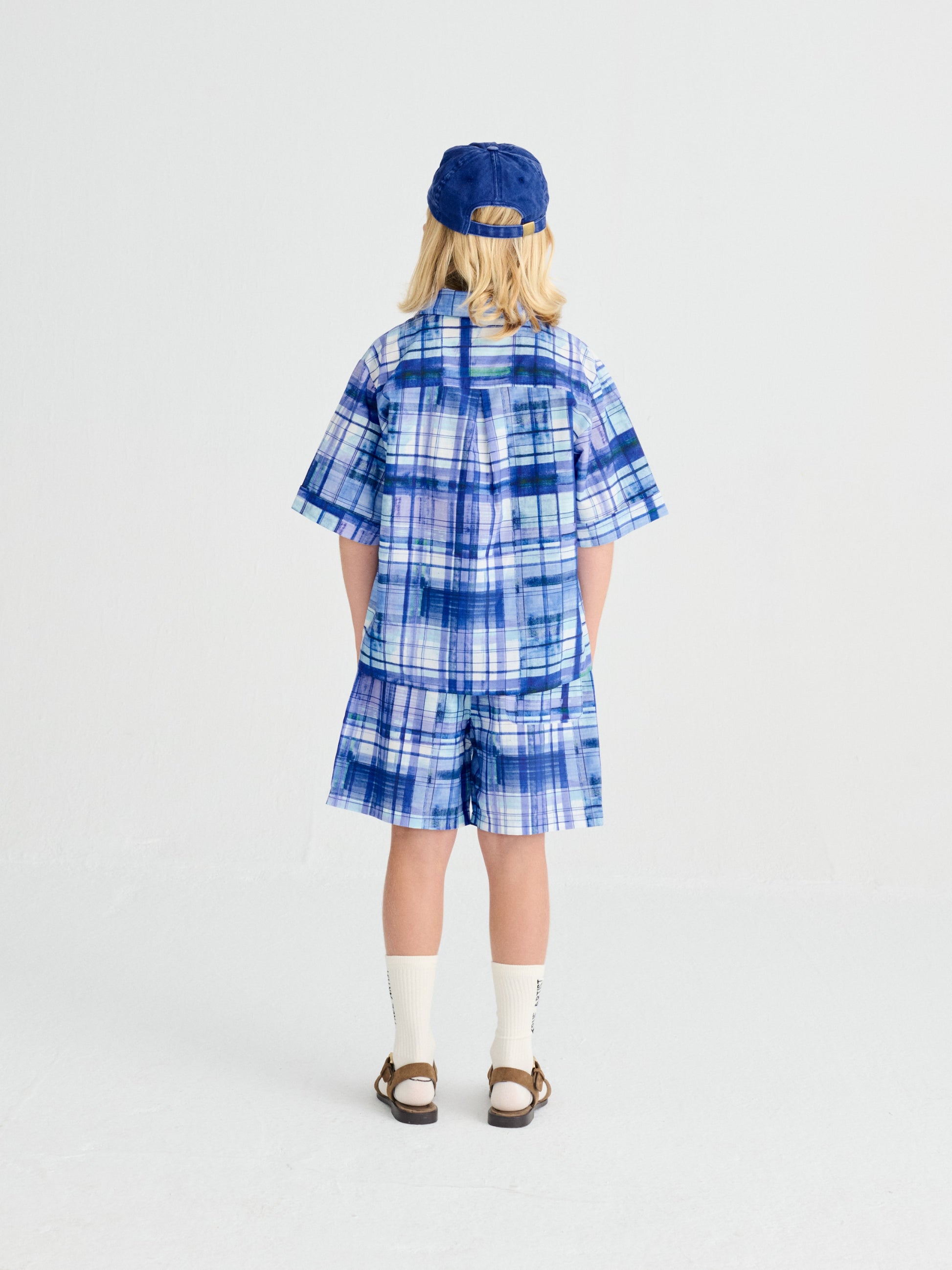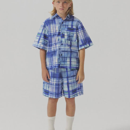 Nomadic Blue Shorts are made of 100% BCI cotton and they feature a colorful blue check printed design. These woven summer shorts are designed with elastic waistband, side pockets, relaxed crotch and a seasonal T.A. embroidery on the side. They have a relaxed fit. Made in Spain.