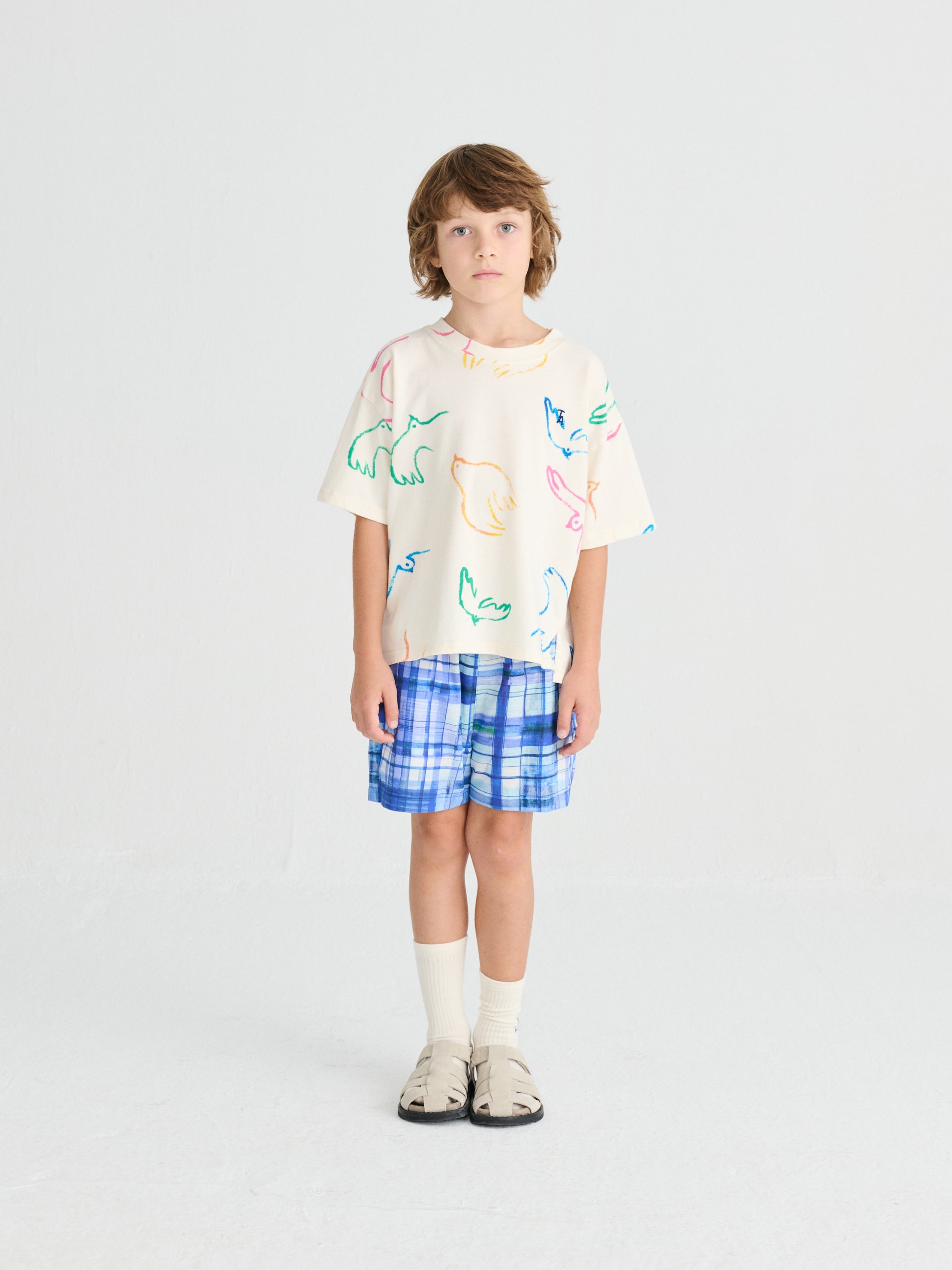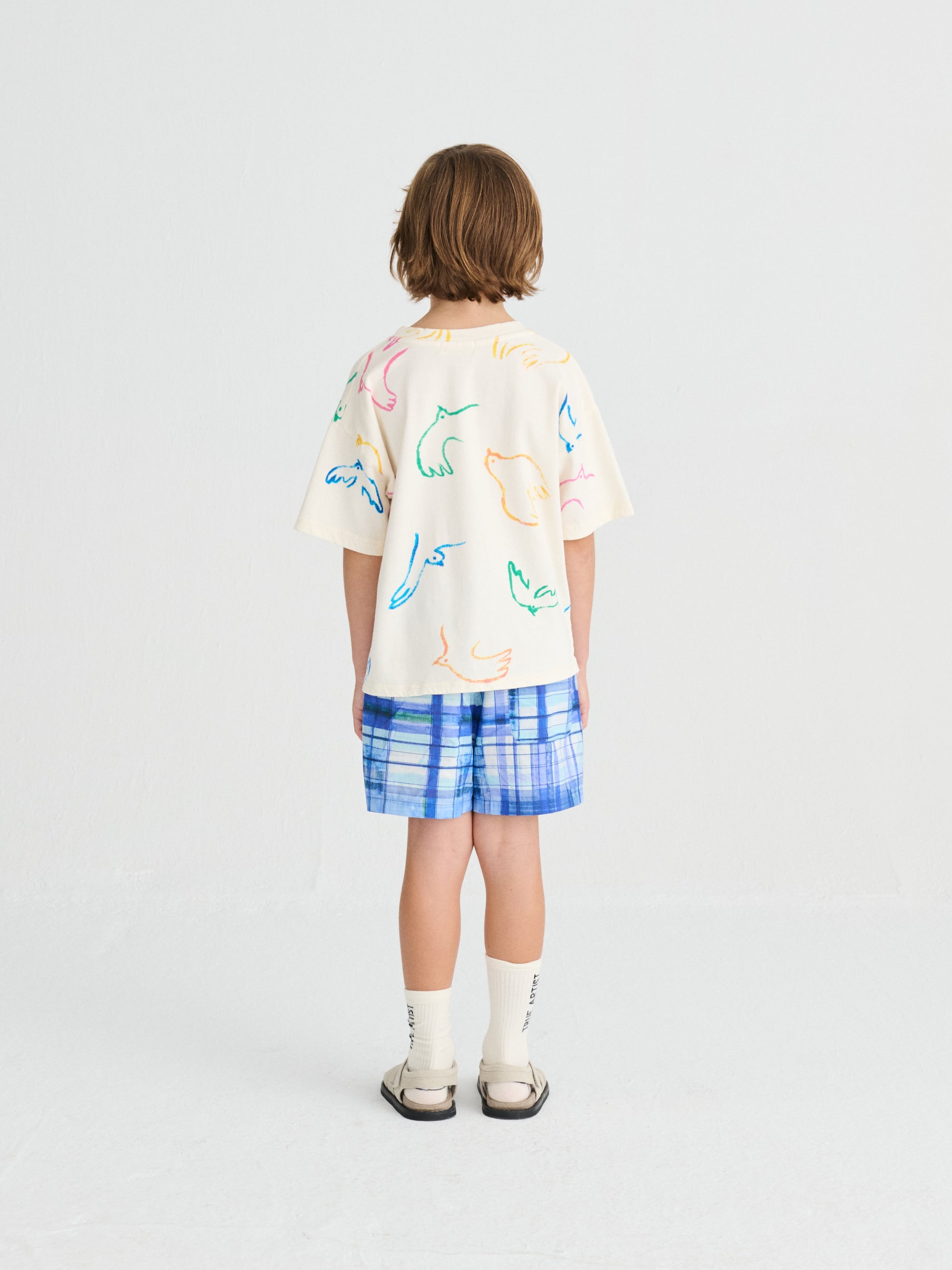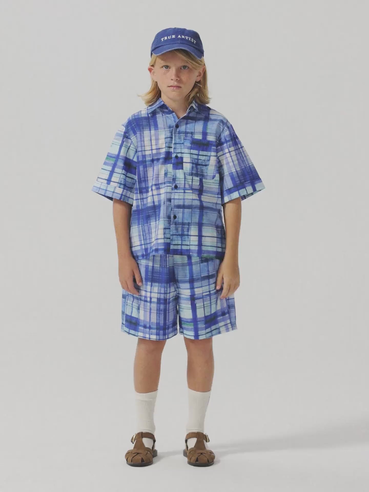 Nomadic Blue Shorts are made of 100% BCI cotton and they feature a colorful blue check printed design. These woven summer shorts are designed with elastic waistband, side pockets, relaxed crotch and a seasonal T.A. embroidery on the side. They have a relaxed fit. Made in Spain.
