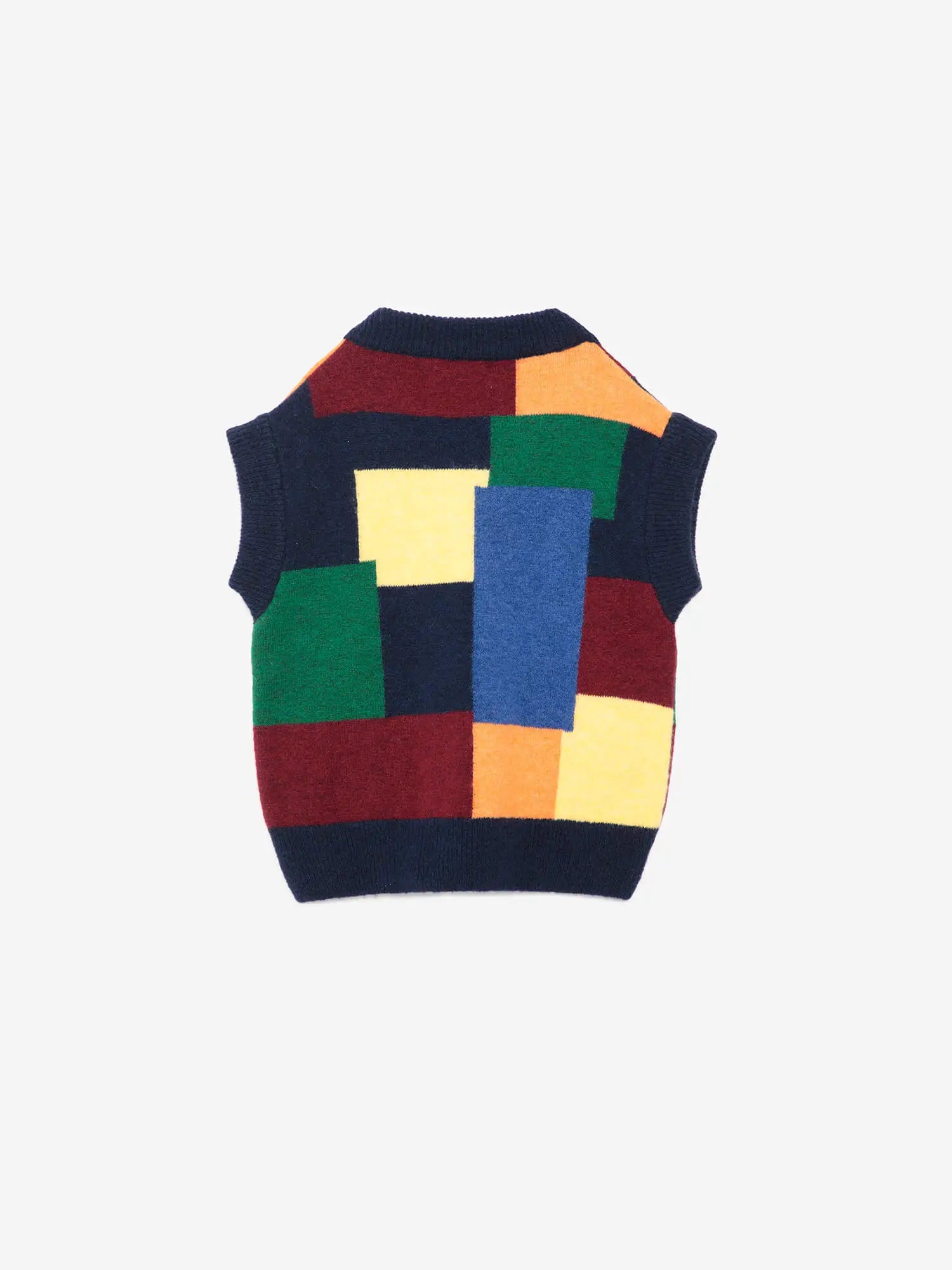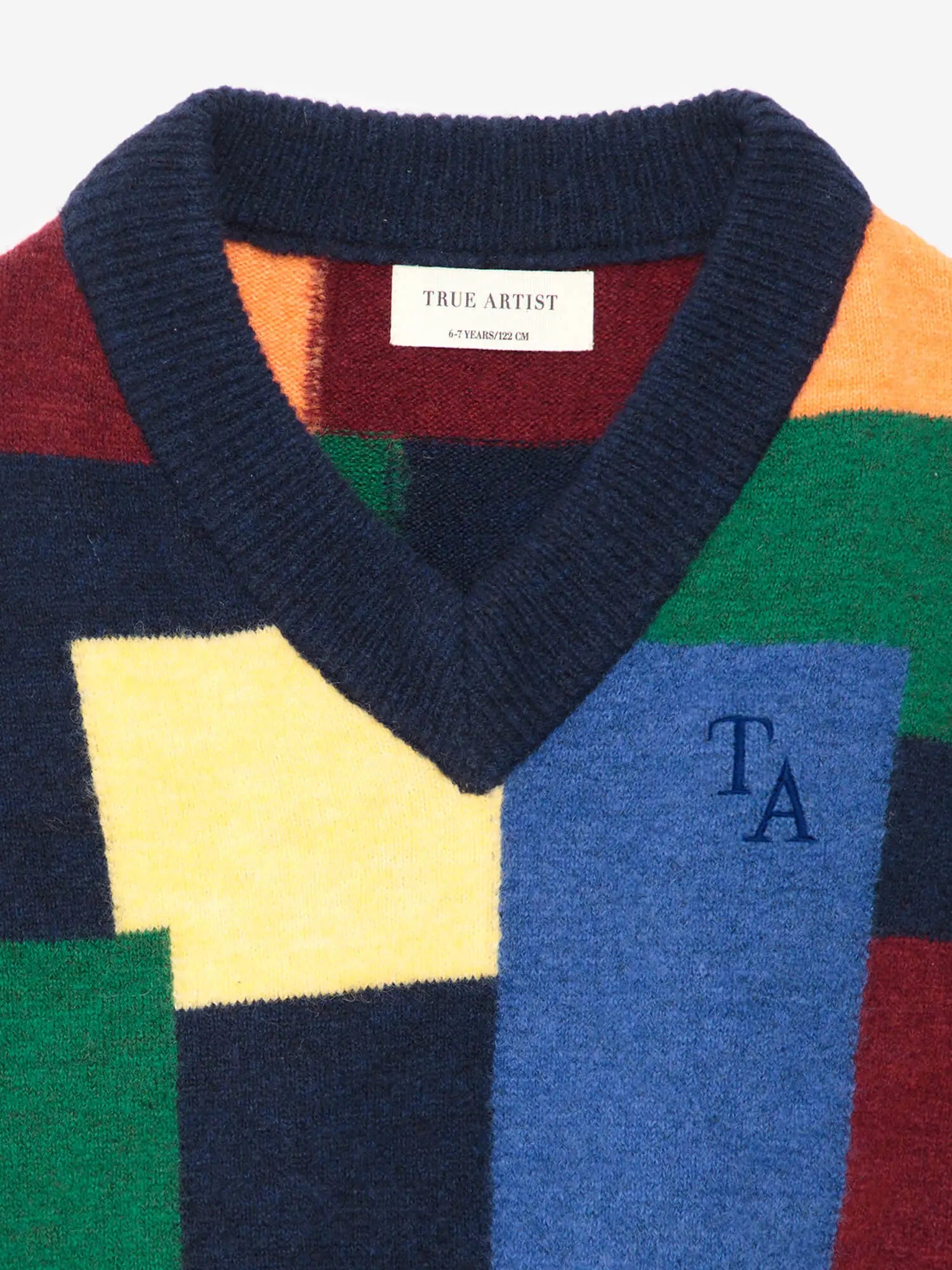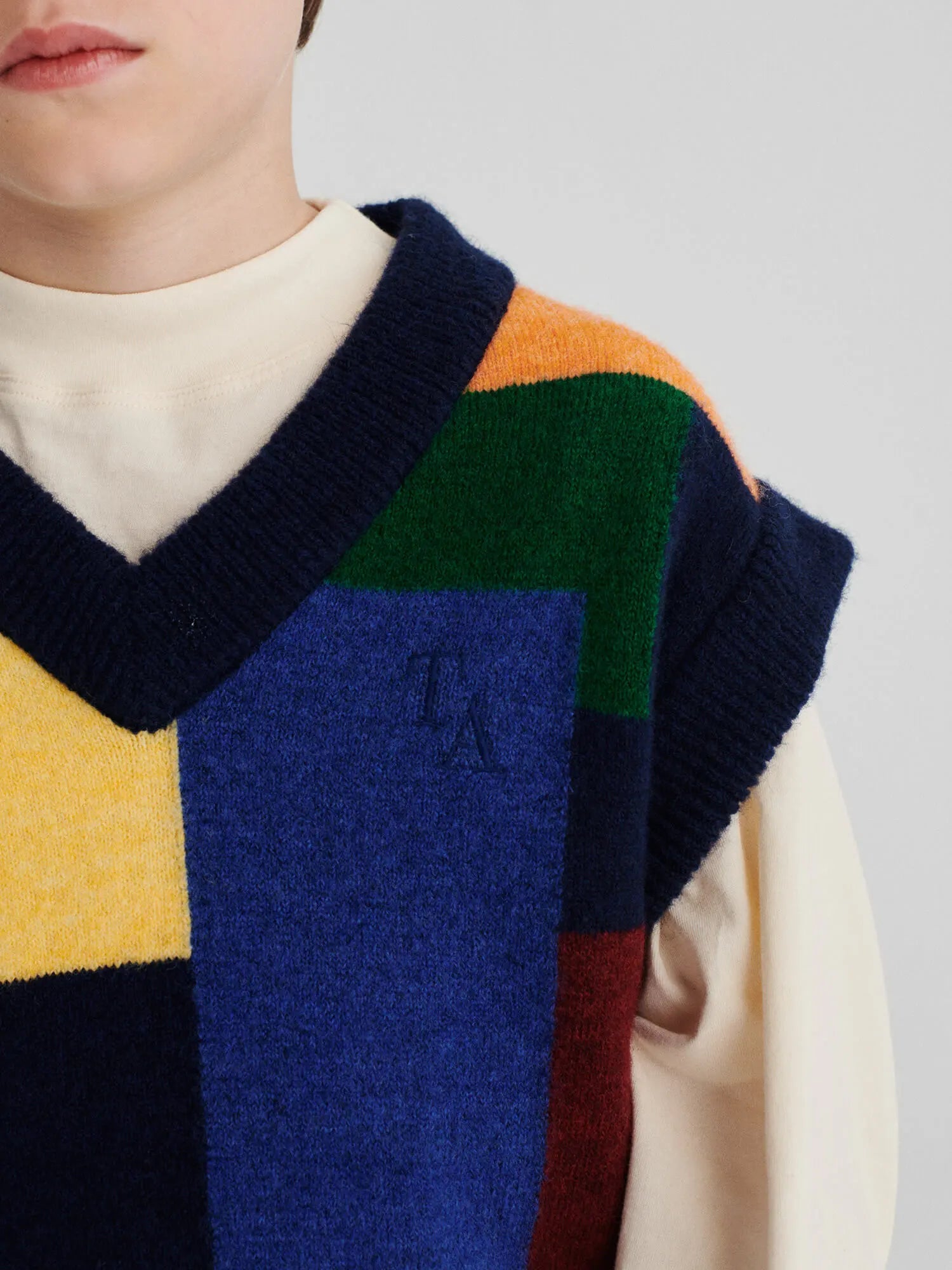 Orphic Vest is made of 48% acrylic 26% polyamide 18% merino wool 6% merino wool and 2% elastane. This knitted vest features our unique orphic color block design and it has a v-neck. It has our TA logo embroidered on the chest. It has a relaxed fit. Made in Spain.
