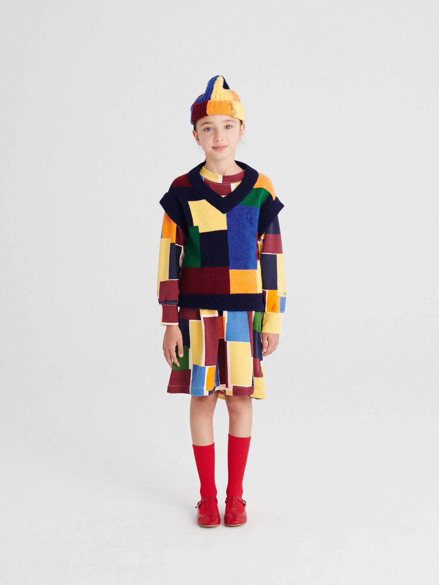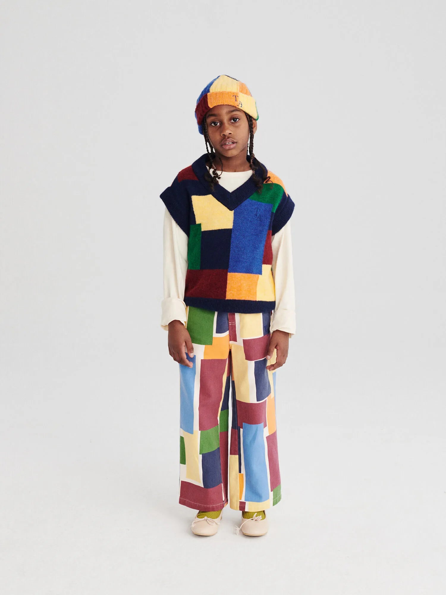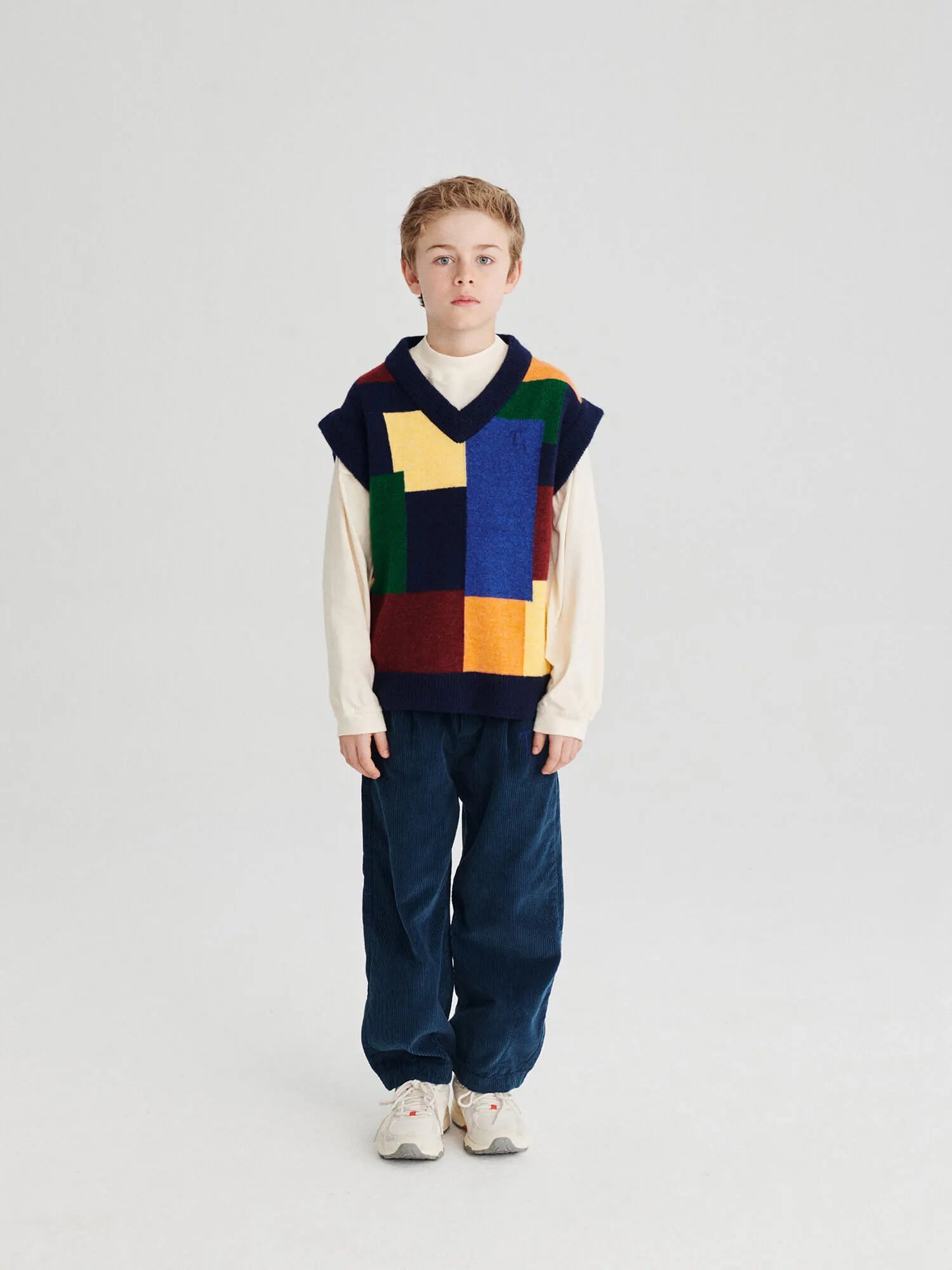 Orphic Vest is made of 48% acrylic 26% polyamide 18% merino wool 6% merino wool and 2% elastane. This knitted vest features our unique orphic color block design and it has a v-neck. It has our TA logo embroidered on the chest. It has a relaxed fit. Made in Spain.