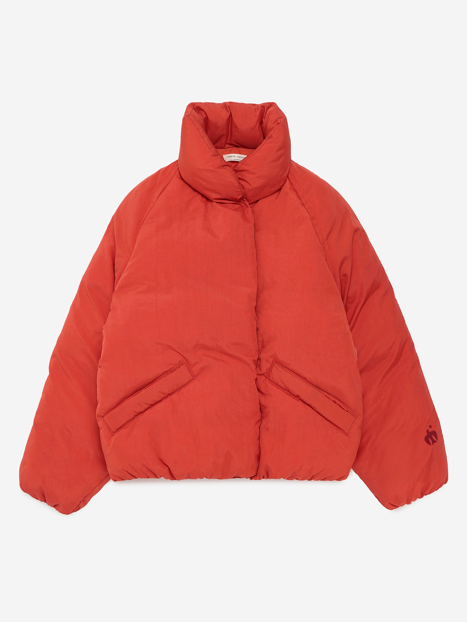 Padded Jacket nº03 in Autumn Fig is made of 100% polyamide on the outside and it is filled with 100% polyester padding. This wrap collar anorak is designed with dropped shoulders, front zipper fastening and welt pockets. It features a True Artist seasonal print at the bottom of the sleeve. Body lining is made of 100% polyamide and sleeve lining is made of 100% polyester. It has a relaxed fit. Made in China.