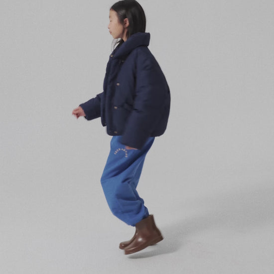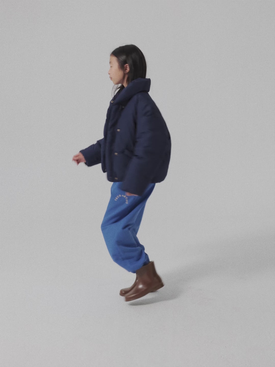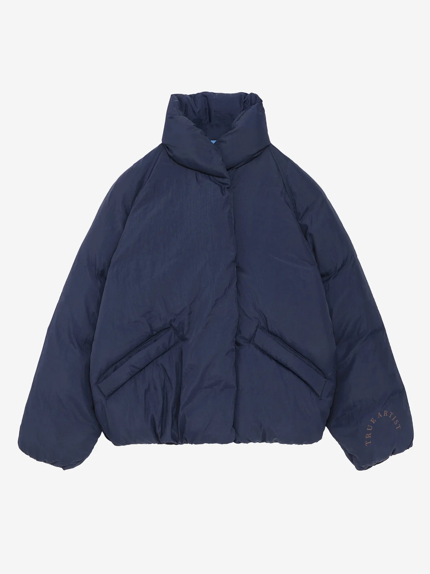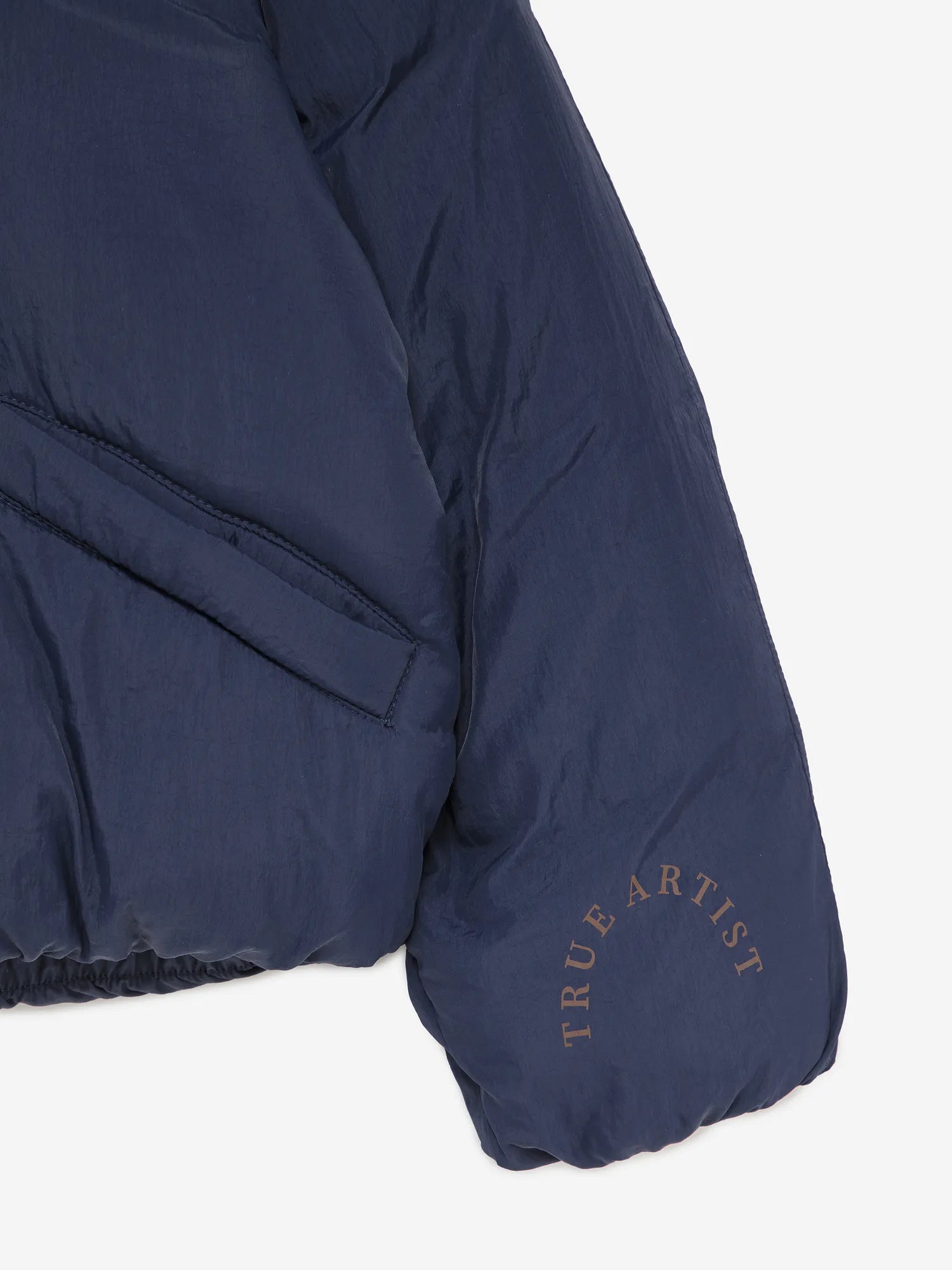 Padded Jacket nº03 in Navy Blue is made of 100% polyamide on the outside and it is filled with 100% polyester padding. This wrap collar anorak is designed with dropped shoulders, front zipper fastening and welt pockets. It features a True Artist seasonal print at the bottom of the sleeve. Body lining is made of 100% polyamide and sleeve lining is made of 100% polyester. It has a relaxed fit. Made in China.