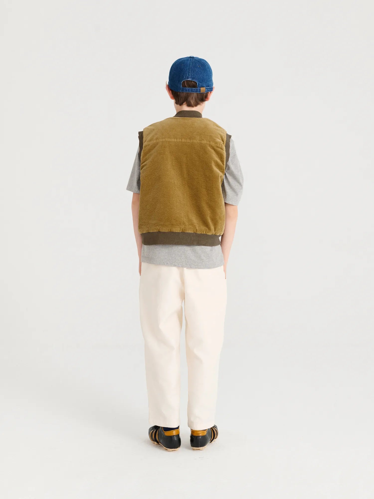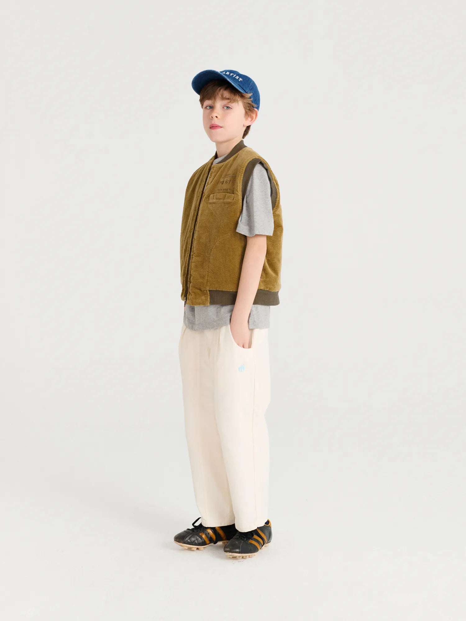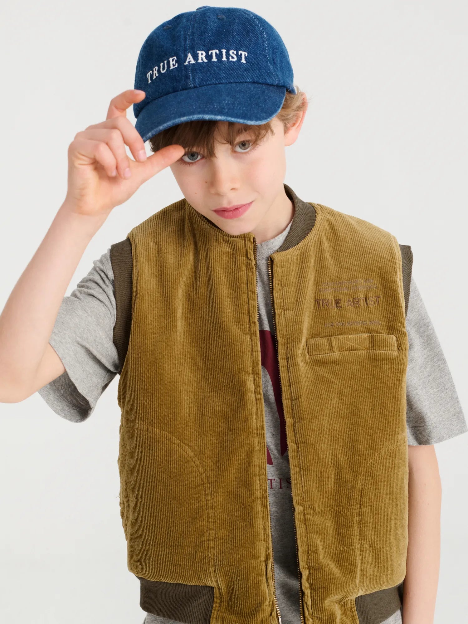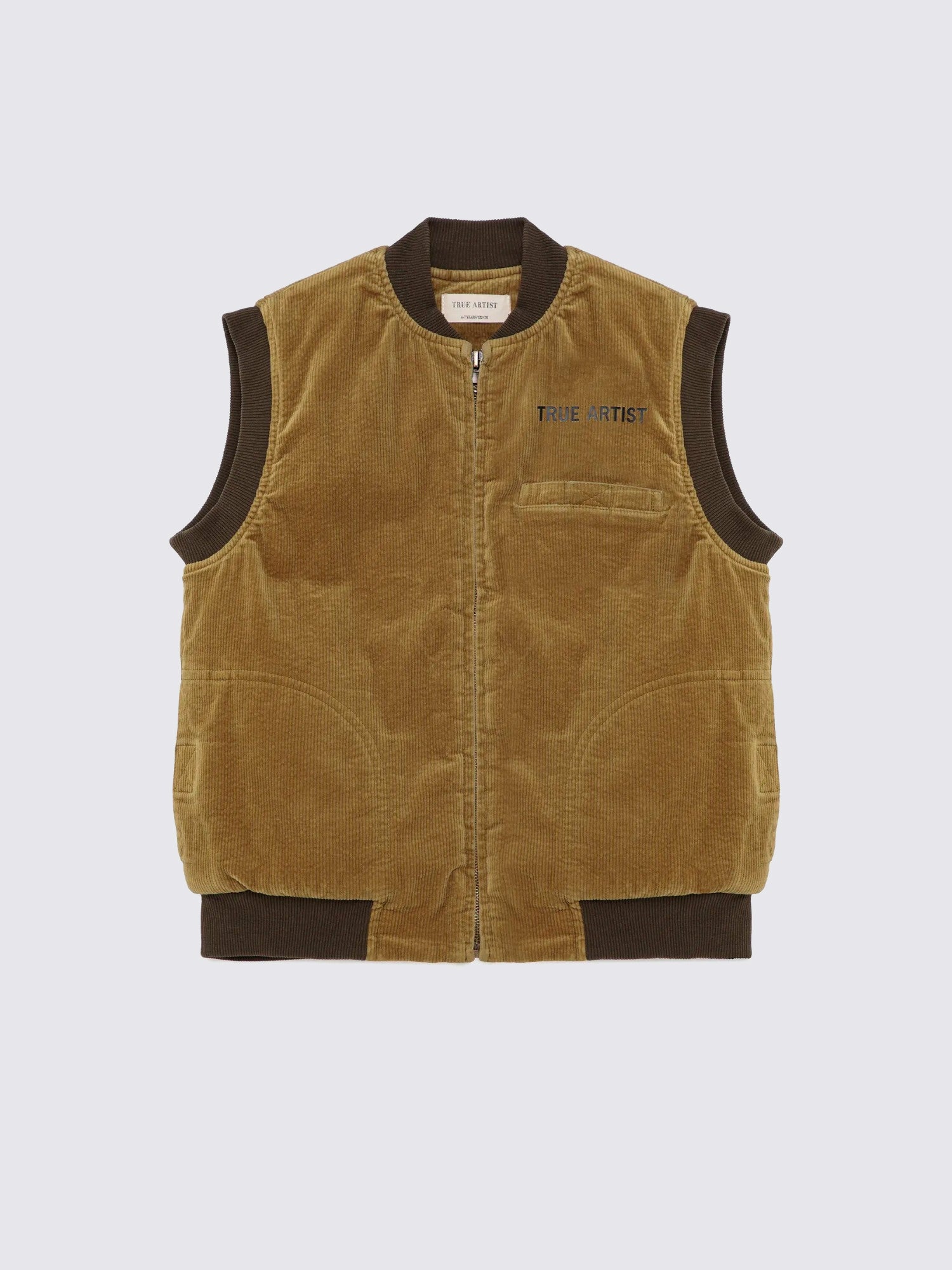 Padded Vest nº06 in Olive Green is made of 97% cotton and 3% elastane corduroy fabric. This light padded vest is designed with round collar, front opening with zipper, pockets at side and chest and rib at collar, bottom and armholes. It features a True Artist print on the chest and has a relaxed fit. Made in China.