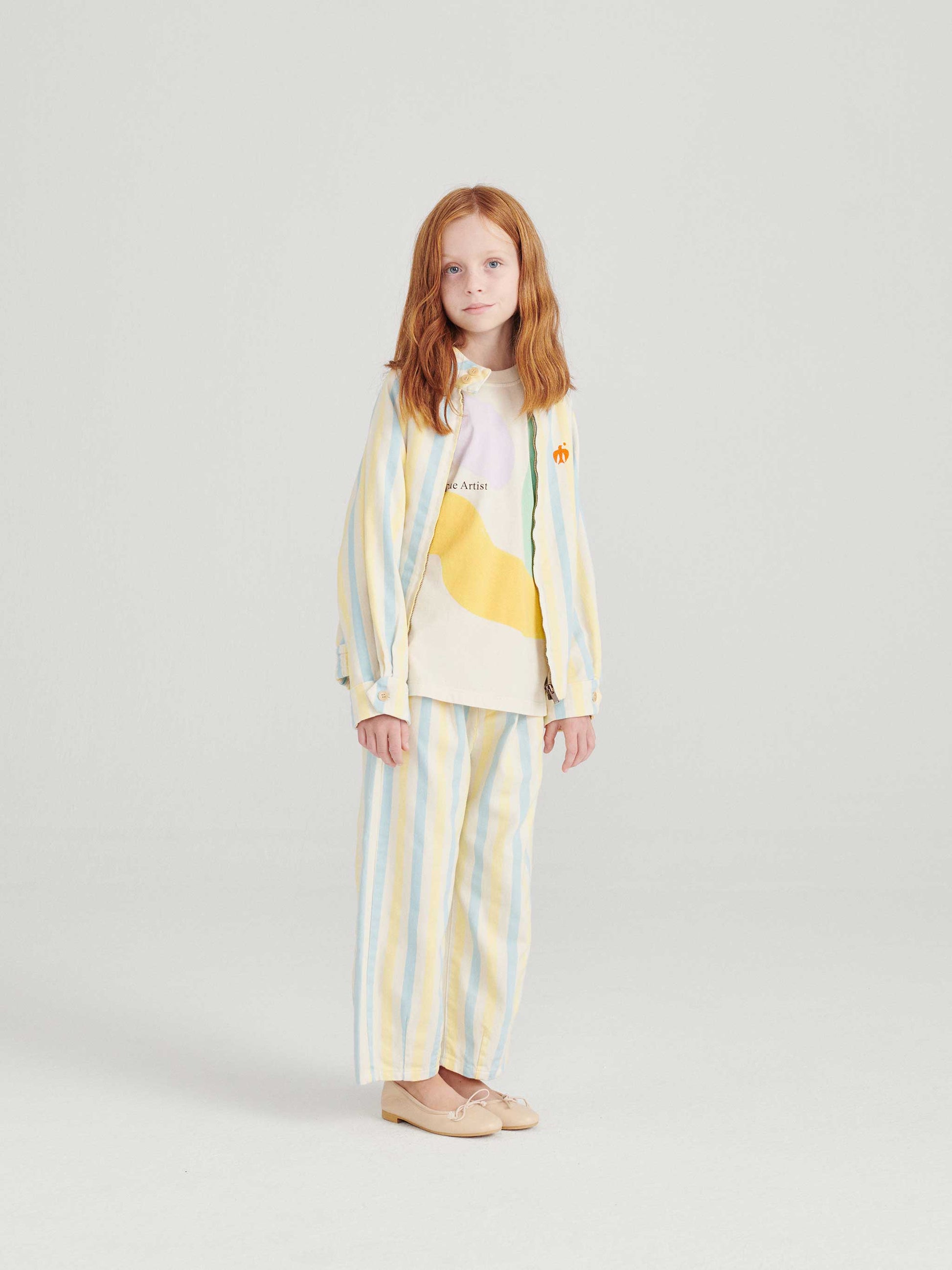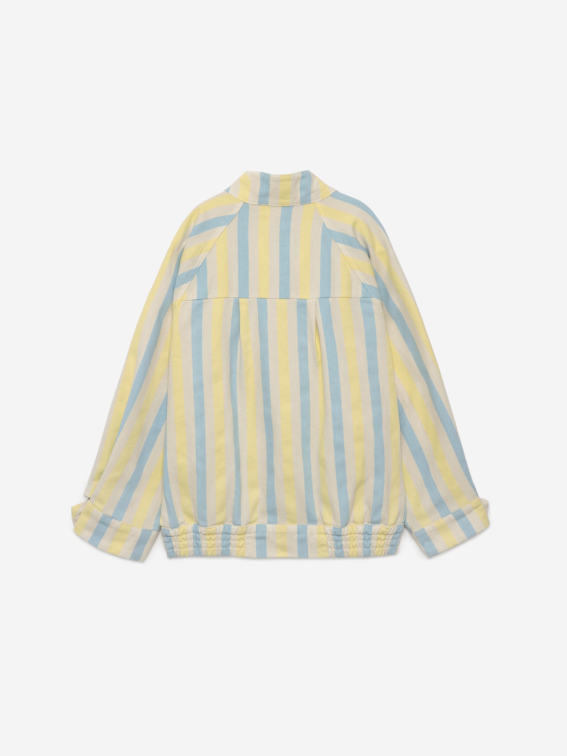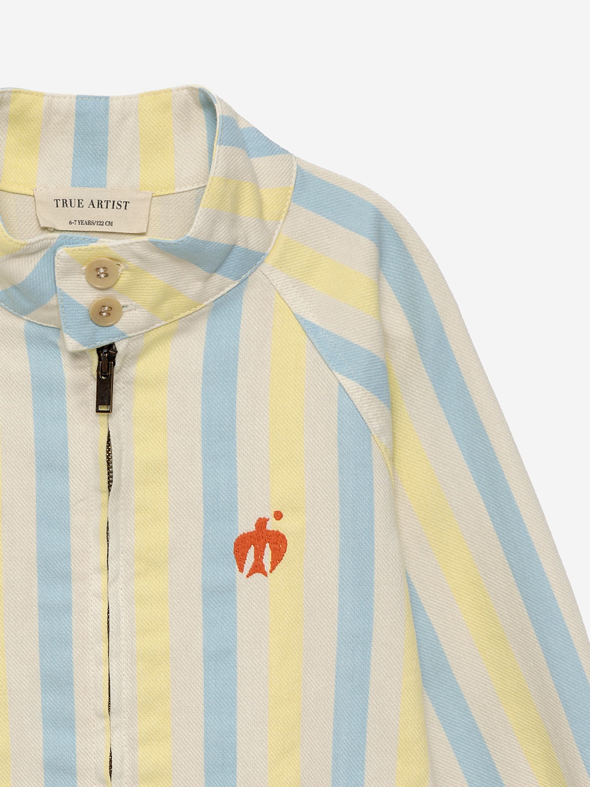 Papier Collé Couleur Jacket is made of 30% recycled cotton and 70% cotton. This cotton jacket features an all over stripe print and has slash pockets, buttons at collar and cuffs and a front zipper fastening. It has our bird logo embroidered on the chest. It has a loose fit. Made in Spain.