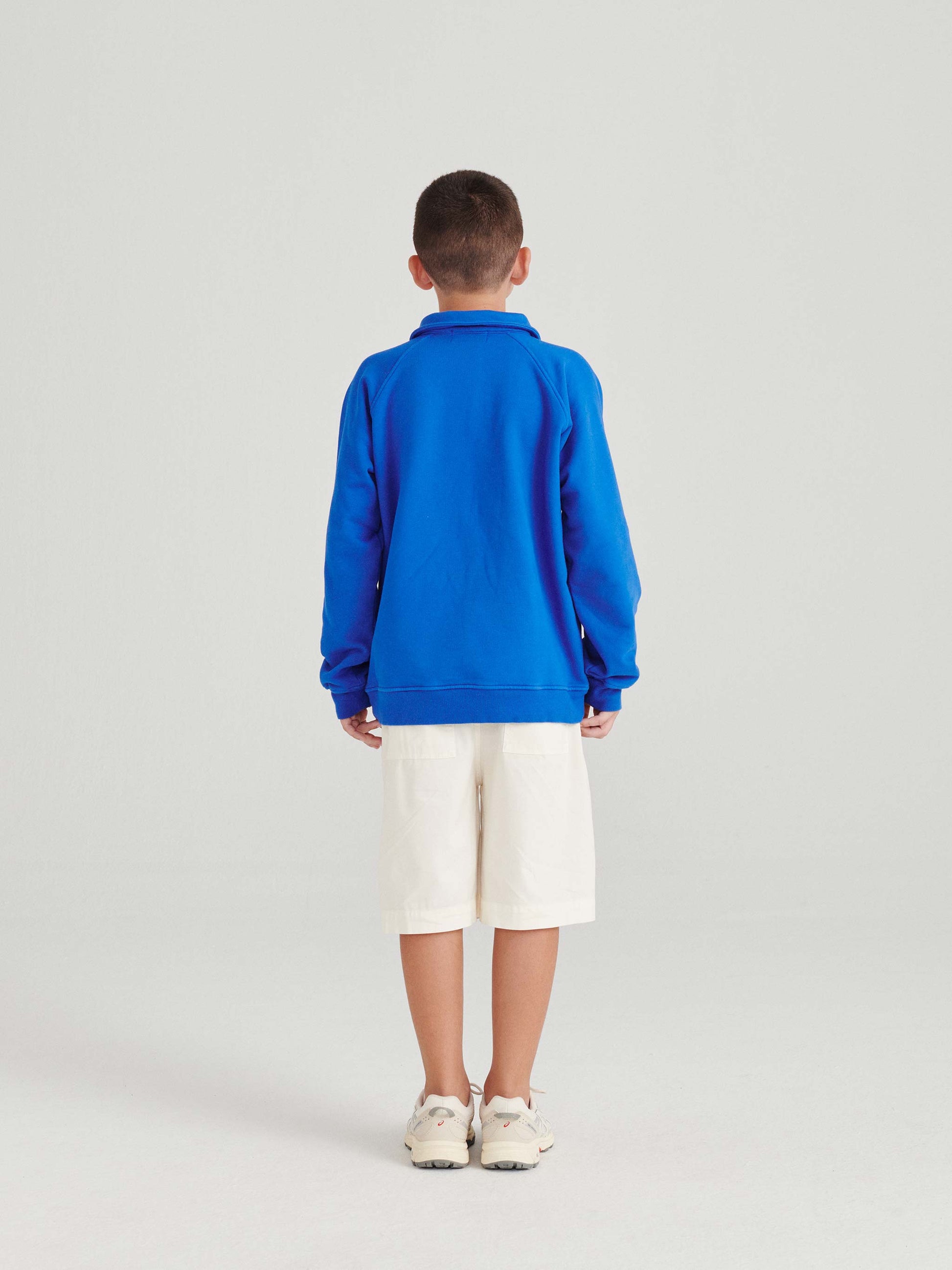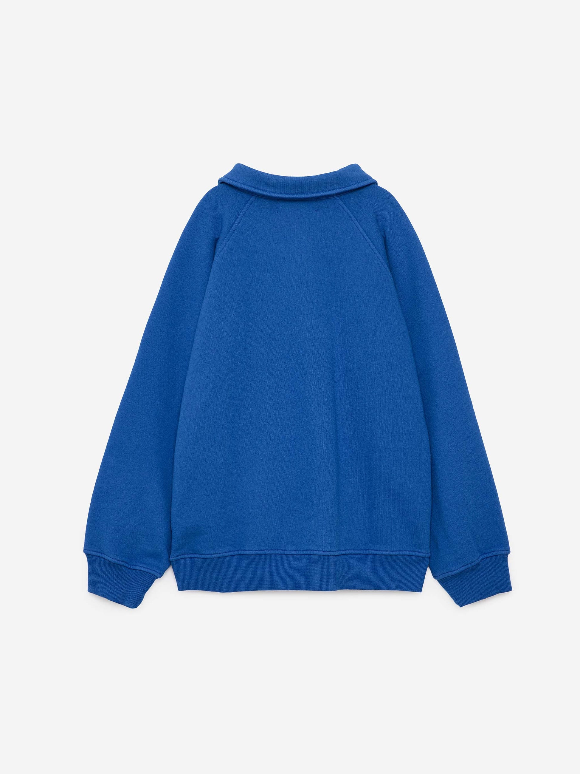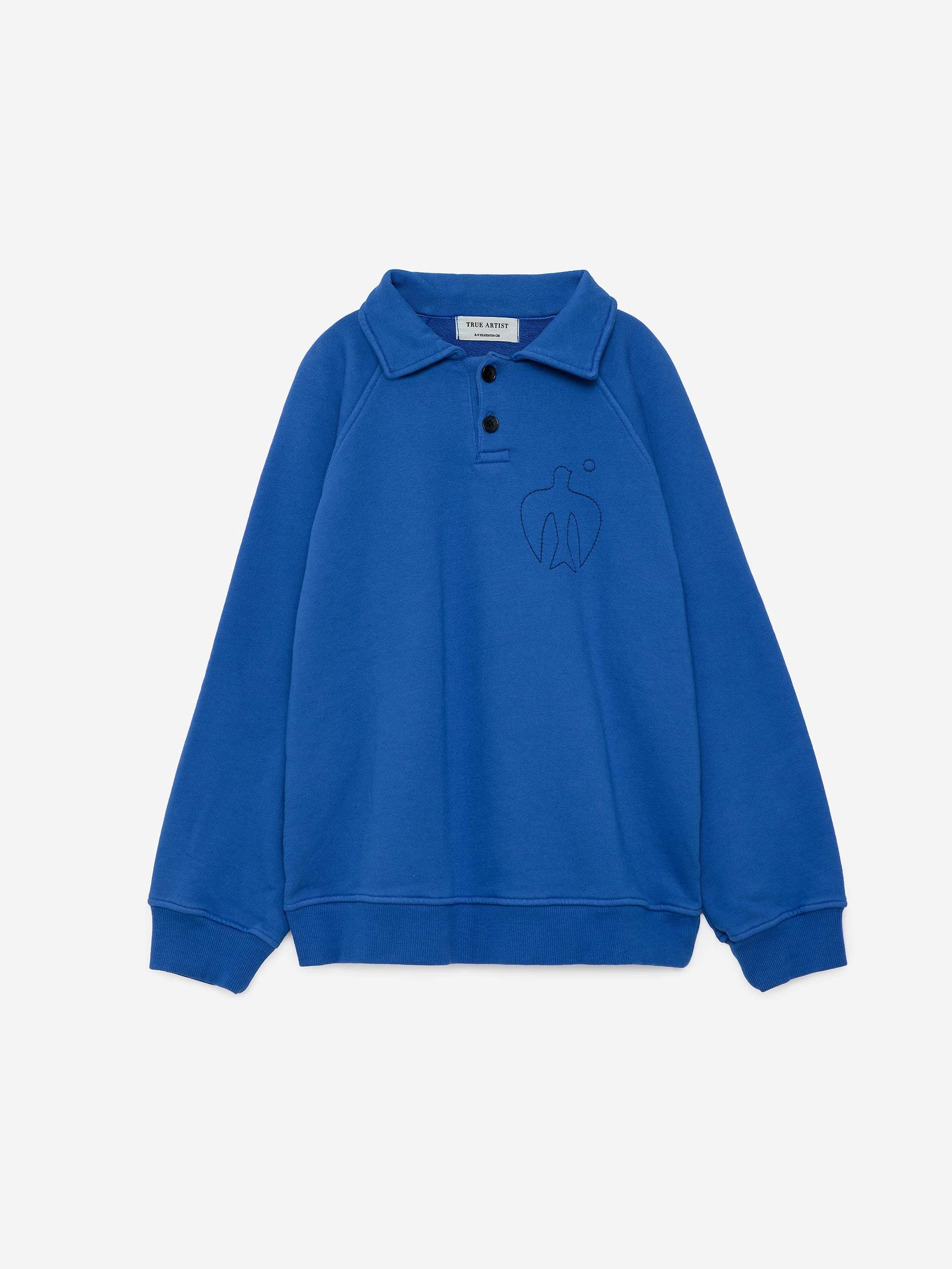 Polo Sweatshirt nº01 in Sapphire Blue is made of 98% bci cotton and 2% elastane fleece. It is designed with a collared neck with button fastening, dropped shoulders and ribbed cuffs and bottom. It features an embroidery of our iconic bird logo silhouette on the chest. It has a relaxed fit. Made in Portugal.