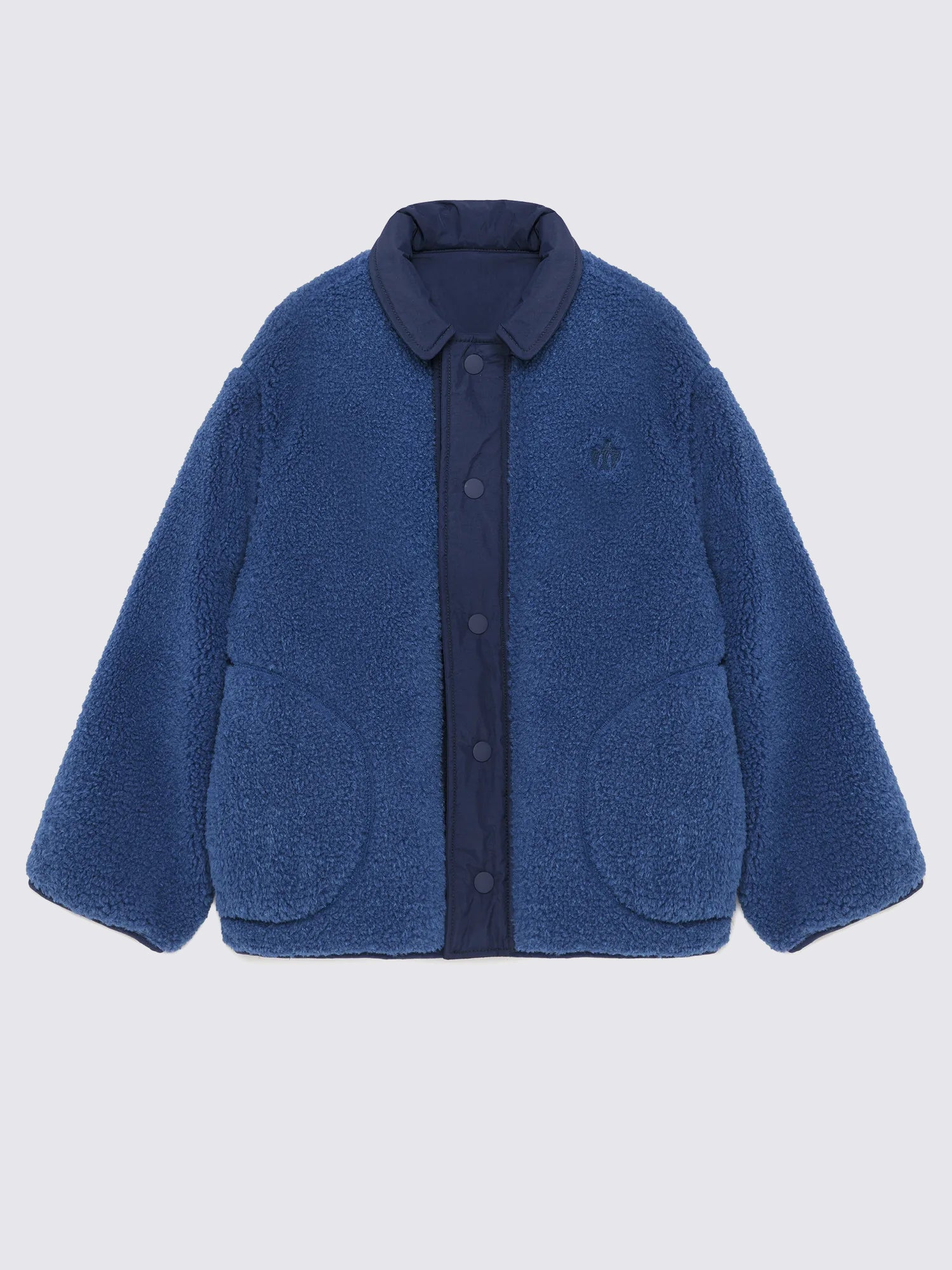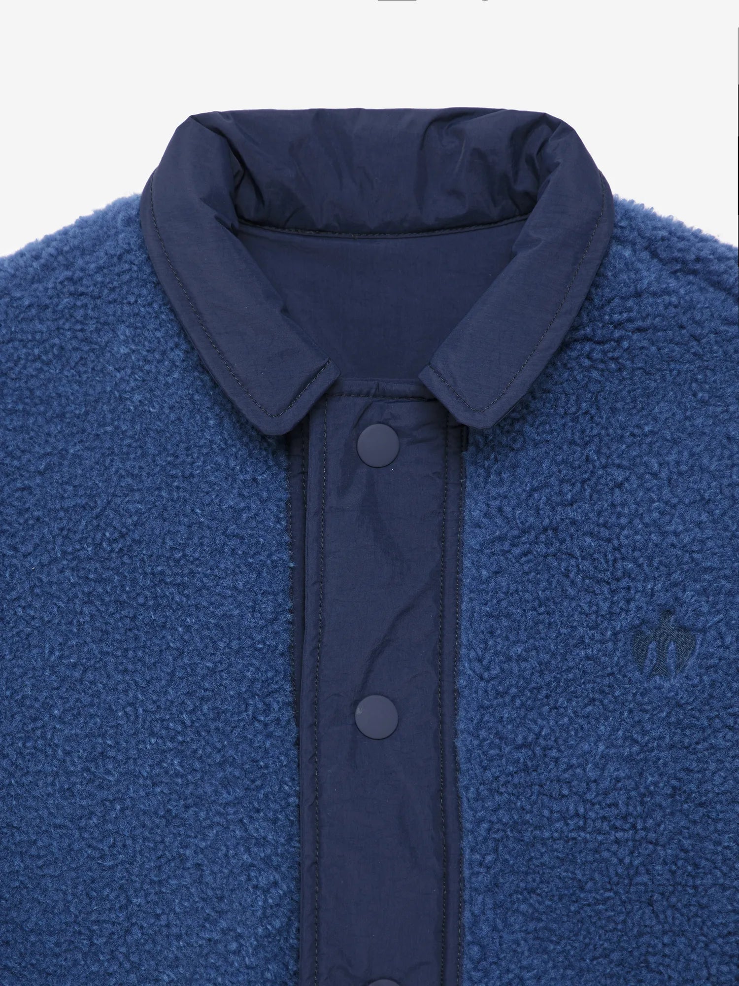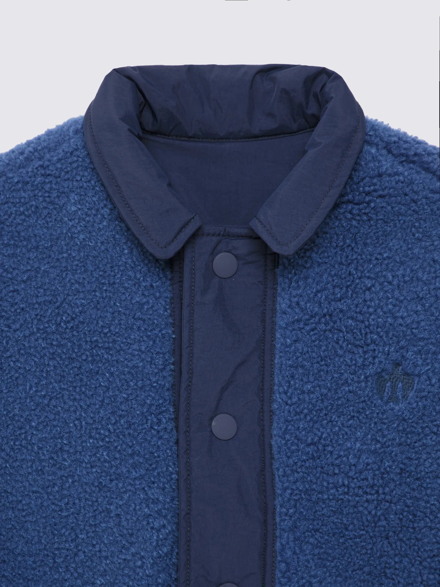 Reversible Jacket nº02 in Blueprint is made of 100% Polyamide in one face and 100% Polyester polar fleece on the other face. This reversible style features different details and colors on both sides: our logo printed at the back on the solid navy side and our bird logo embroidered on the chest on the lighter blue polar fleece side. It is designed with spread collar, front snaps fastening and dropped shoulders. It has a relaxed fit. Made in China.