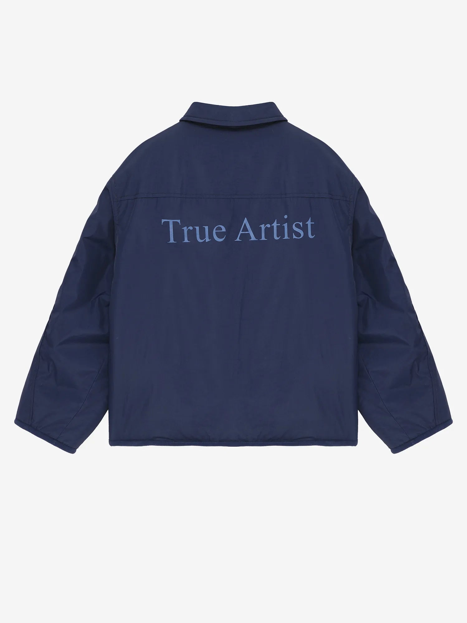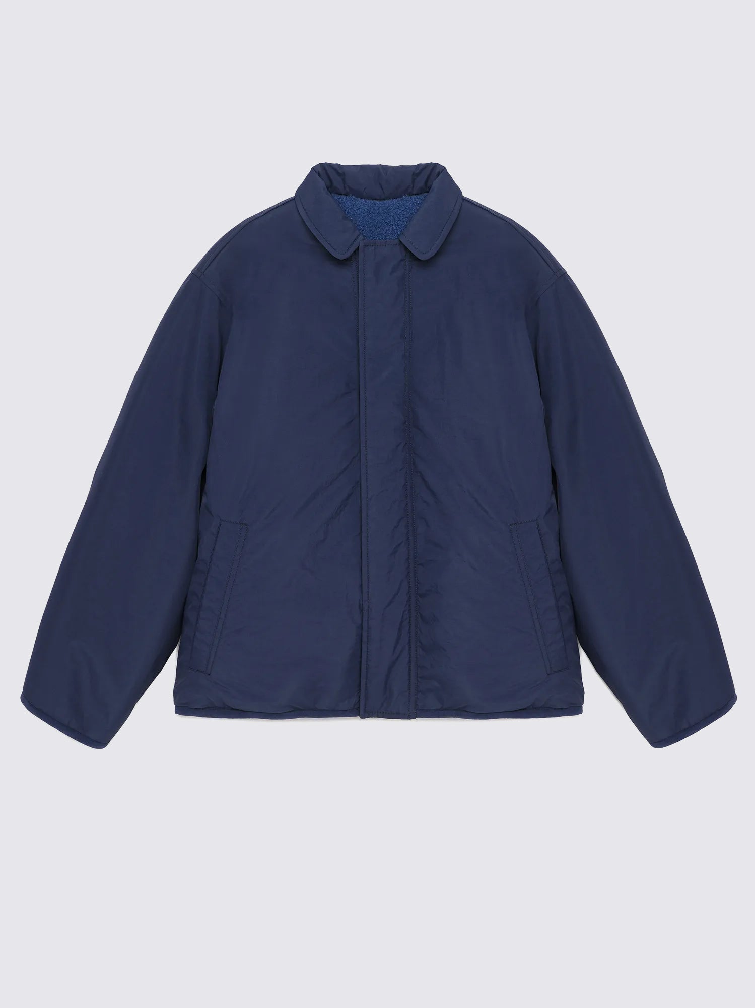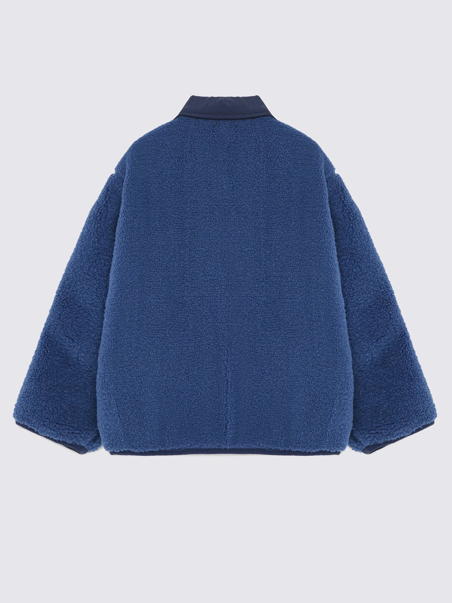 Reversible Jacket nº02 in Blueprint is made of 100% Polyamide in one face and 100% Polyester polar fleece on the other face. This reversible style features different details and colors on both sides: our logo printed at the back on the solid navy side and our bird logo embroidered on the chest on the lighter blue polar fleece side. It is designed with spread collar, front snaps fastening and dropped shoulders. It has a relaxed fit. Made in China.