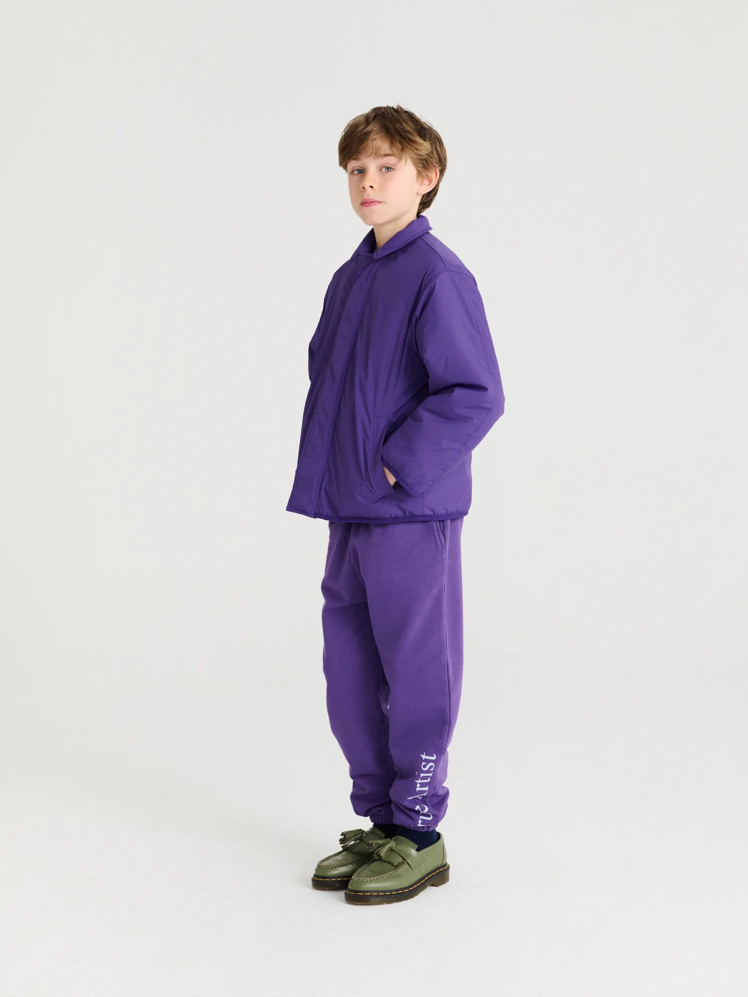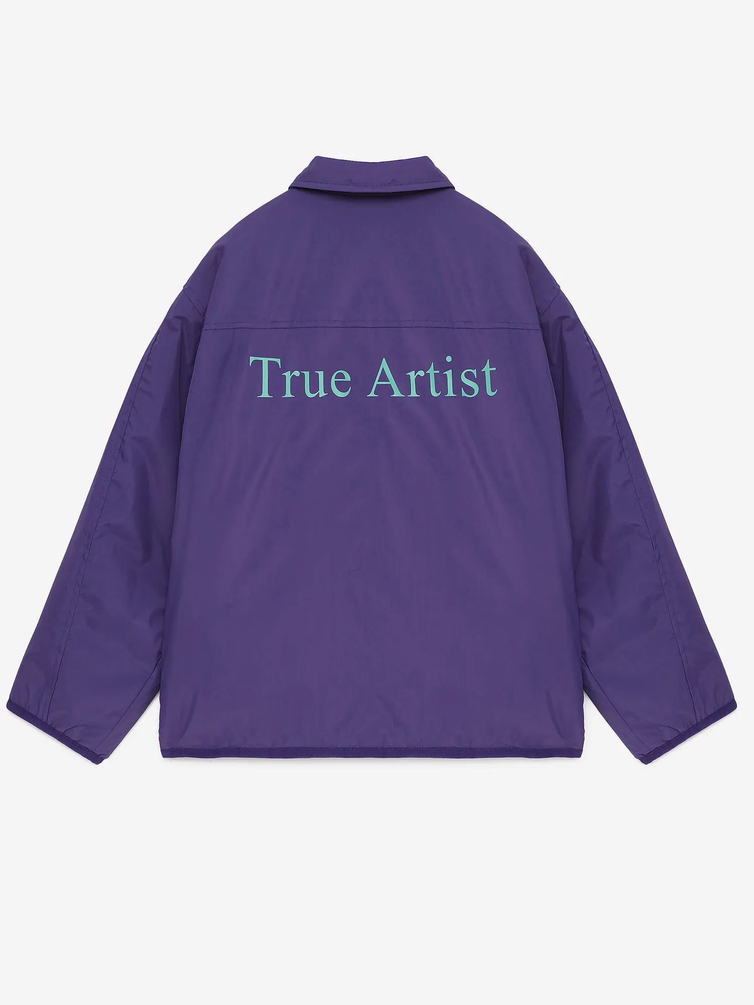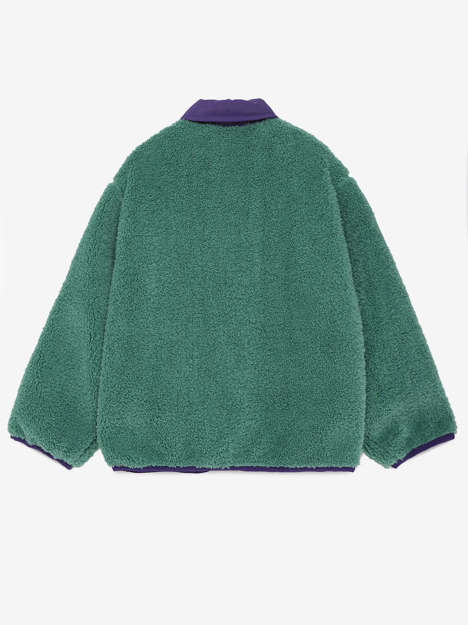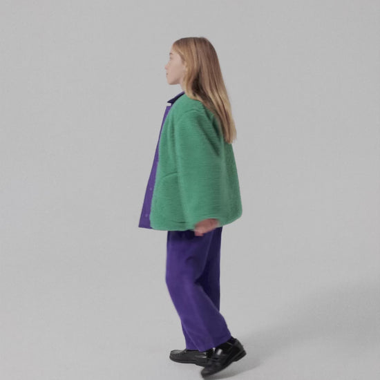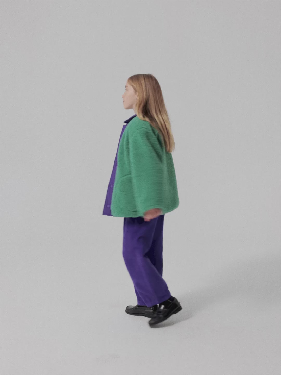 Reversible Jacket nº02 in Violet Indigo is made of 100% Polyamide in one face and 100% Polyester polar fleece on the other face. This reversible style features different details and colors on both sides: our logo printed at the back on the solid woven violet side and our bird logo embroidered on the chest on the green polar fleece side. It is designed with spread collar, front snaps fastening and dropped shoulders. It has a relaxed fit. Made in China.