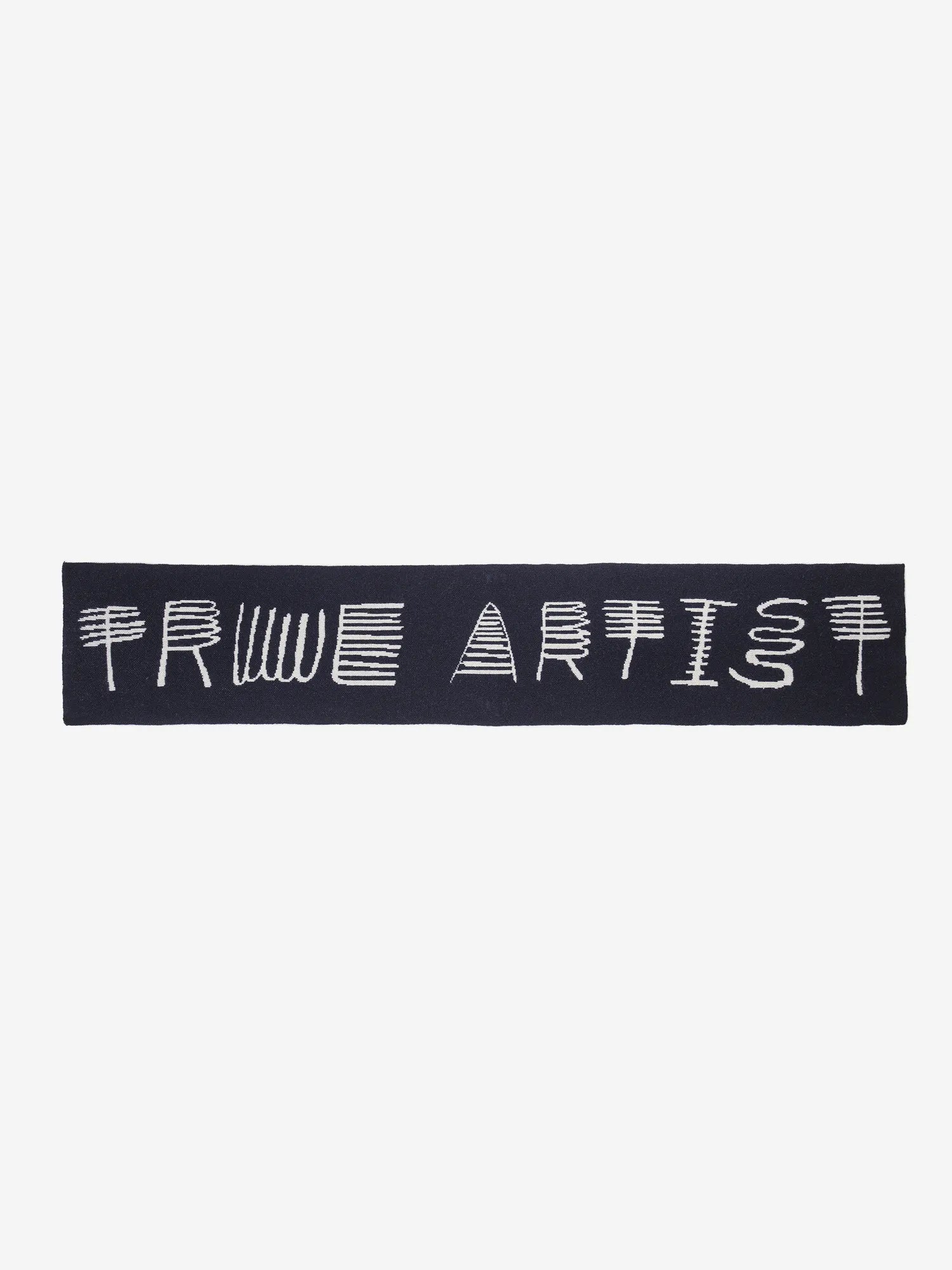 Scarf nº01 in Navy Blue is made of 100% wool. This scarf features a "TRUE ARTIST" knitted in an eye-catching, stylized white font against a solid dark blue background. The letters have a hand-drawn appearance giving the scarf an artistic and personalized touch. Made in China.