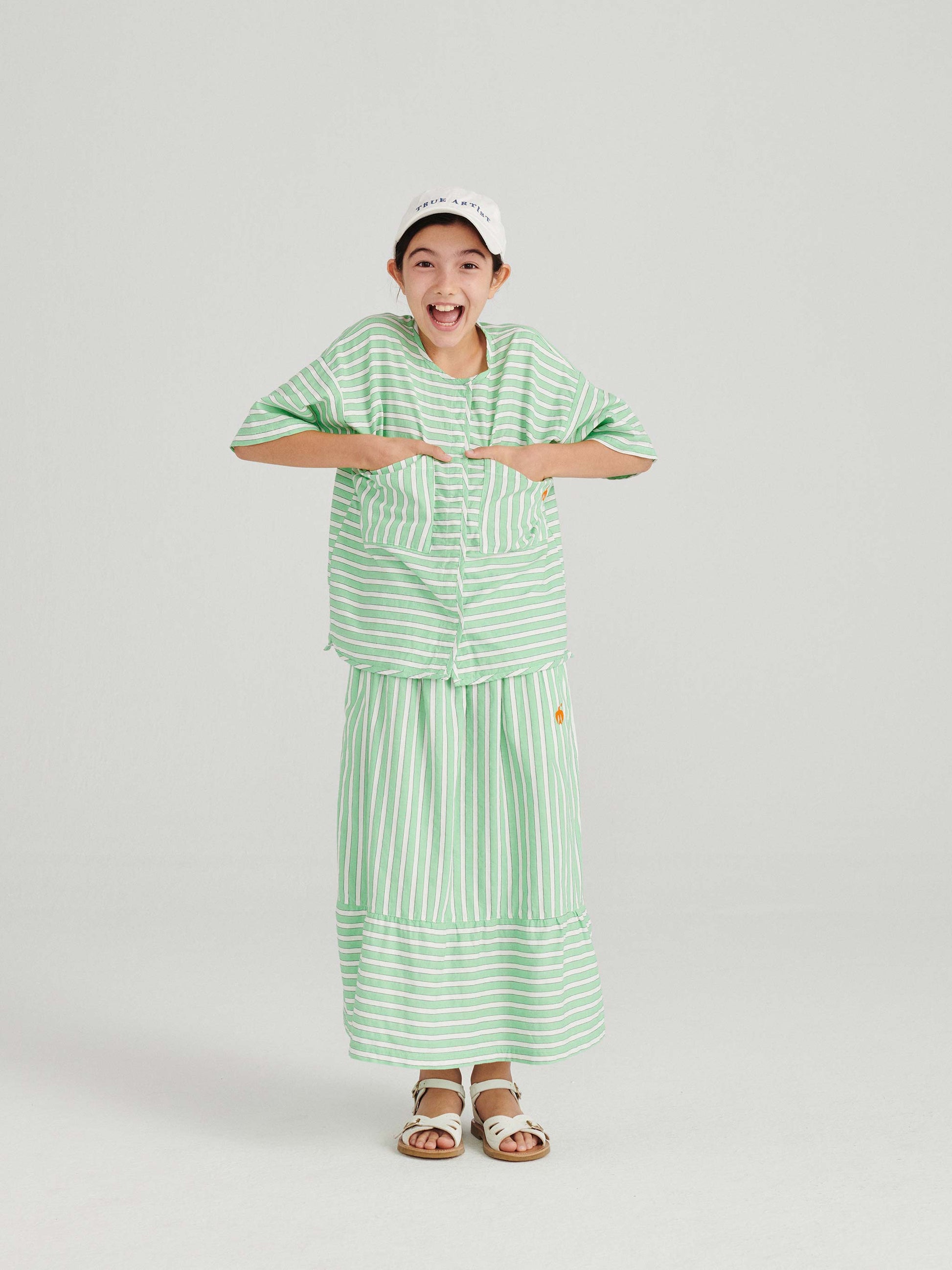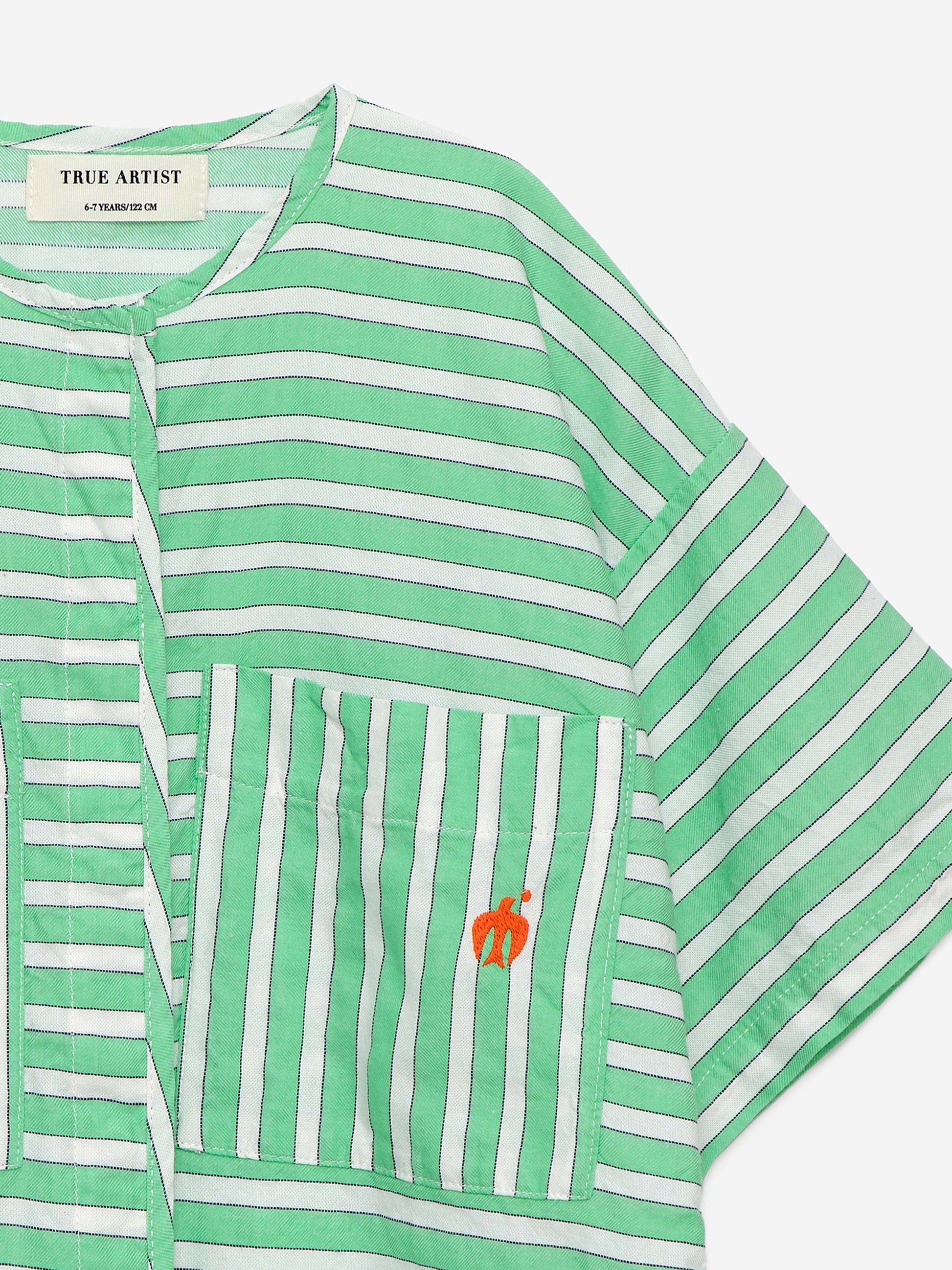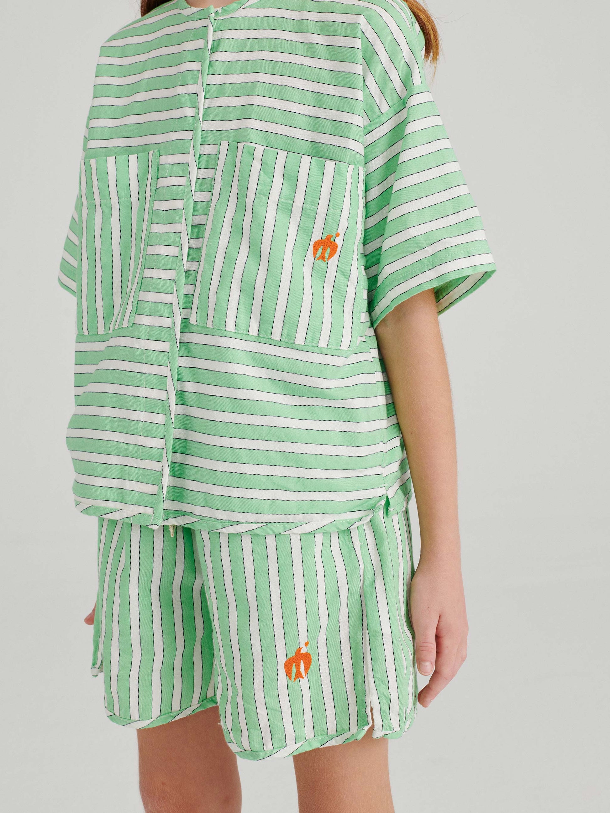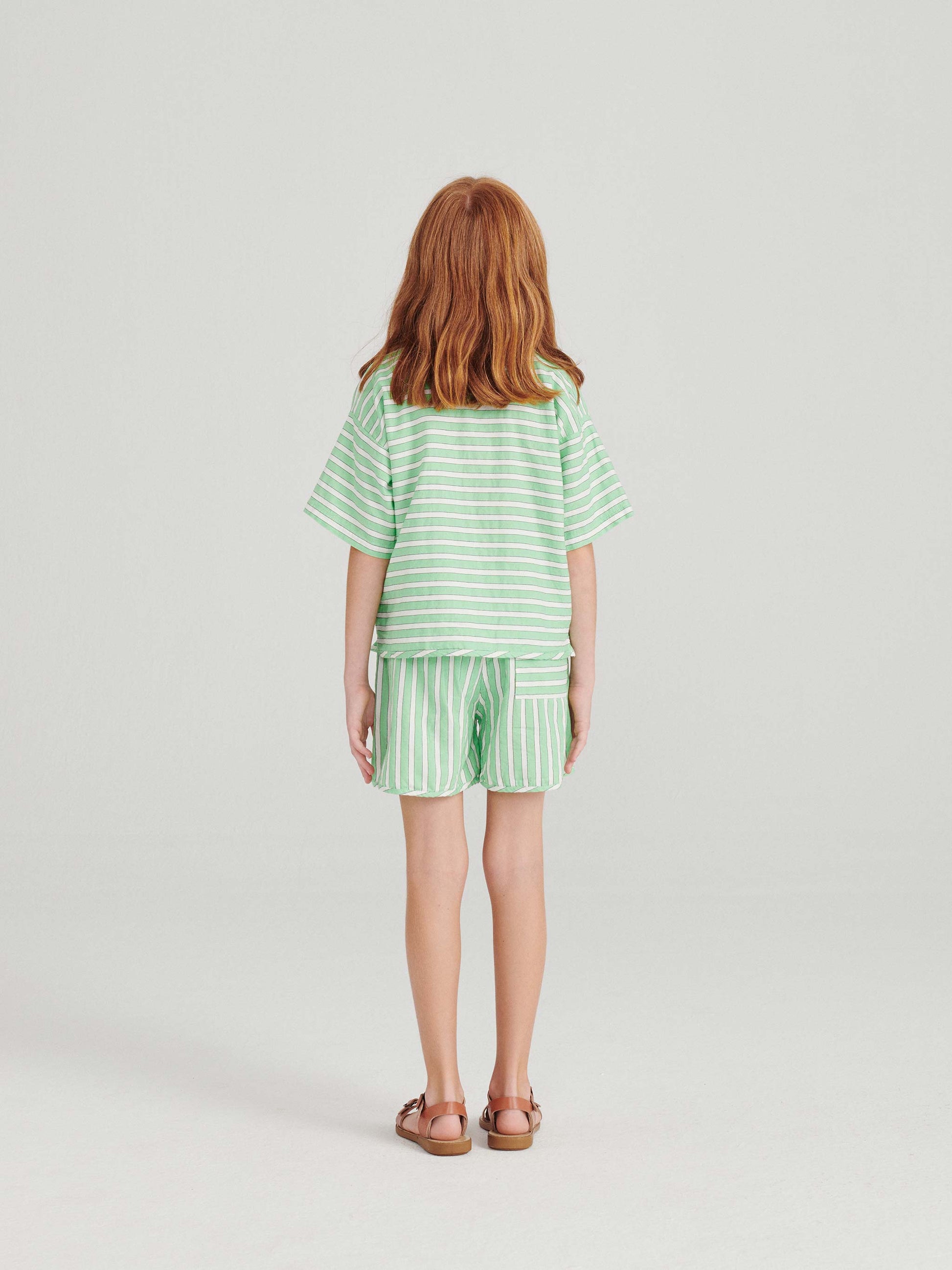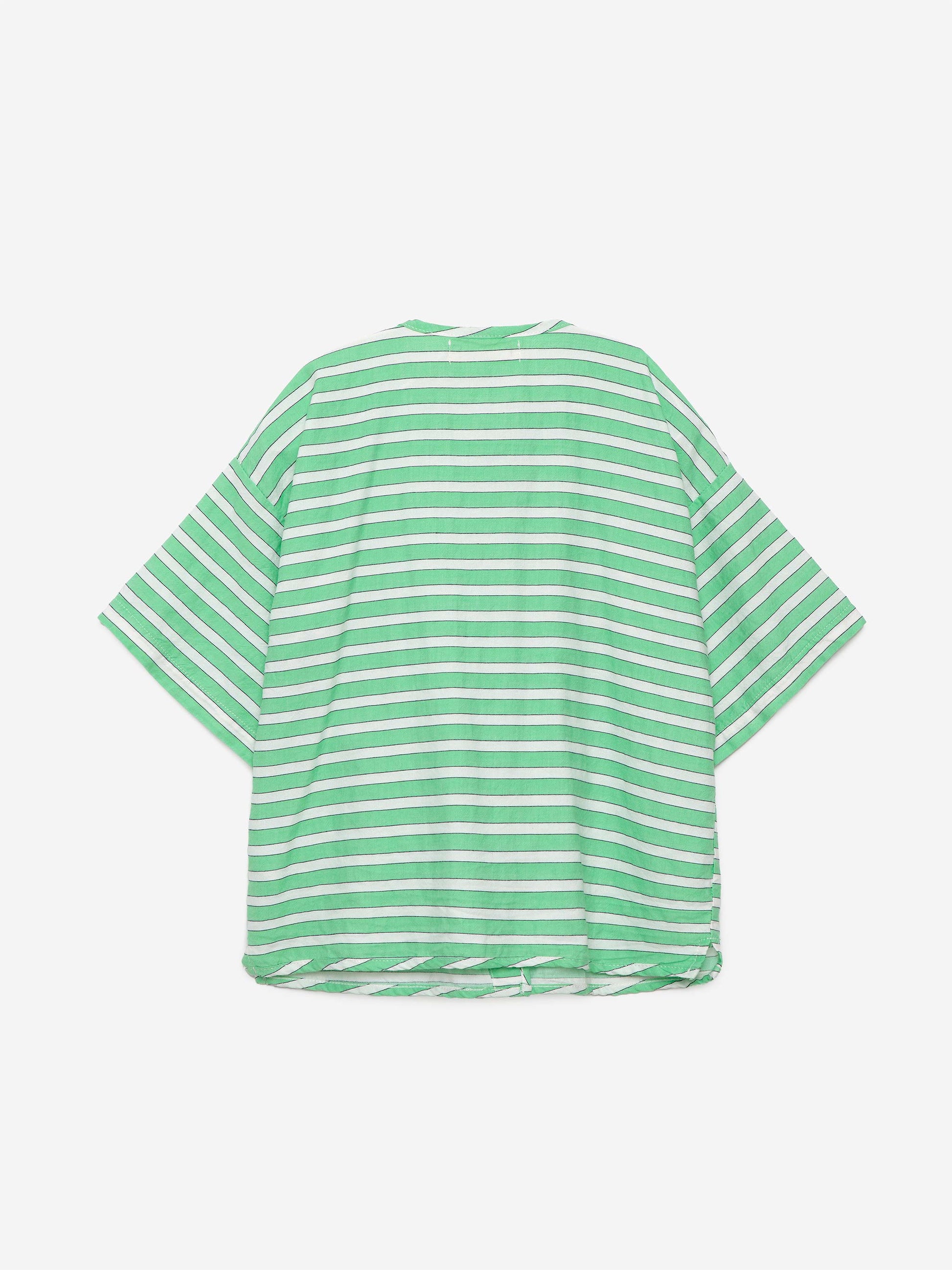 Shirt nº04 in Nile Green is made of 100% cotton yarn dyed woven stripes. This woven blouse is designed with round neck, front hidden snap fastening, short sleeves and patch pockets on the chest. It features our bird logo on one of the pockets. It has a relaxed fit. Made in Spain.
