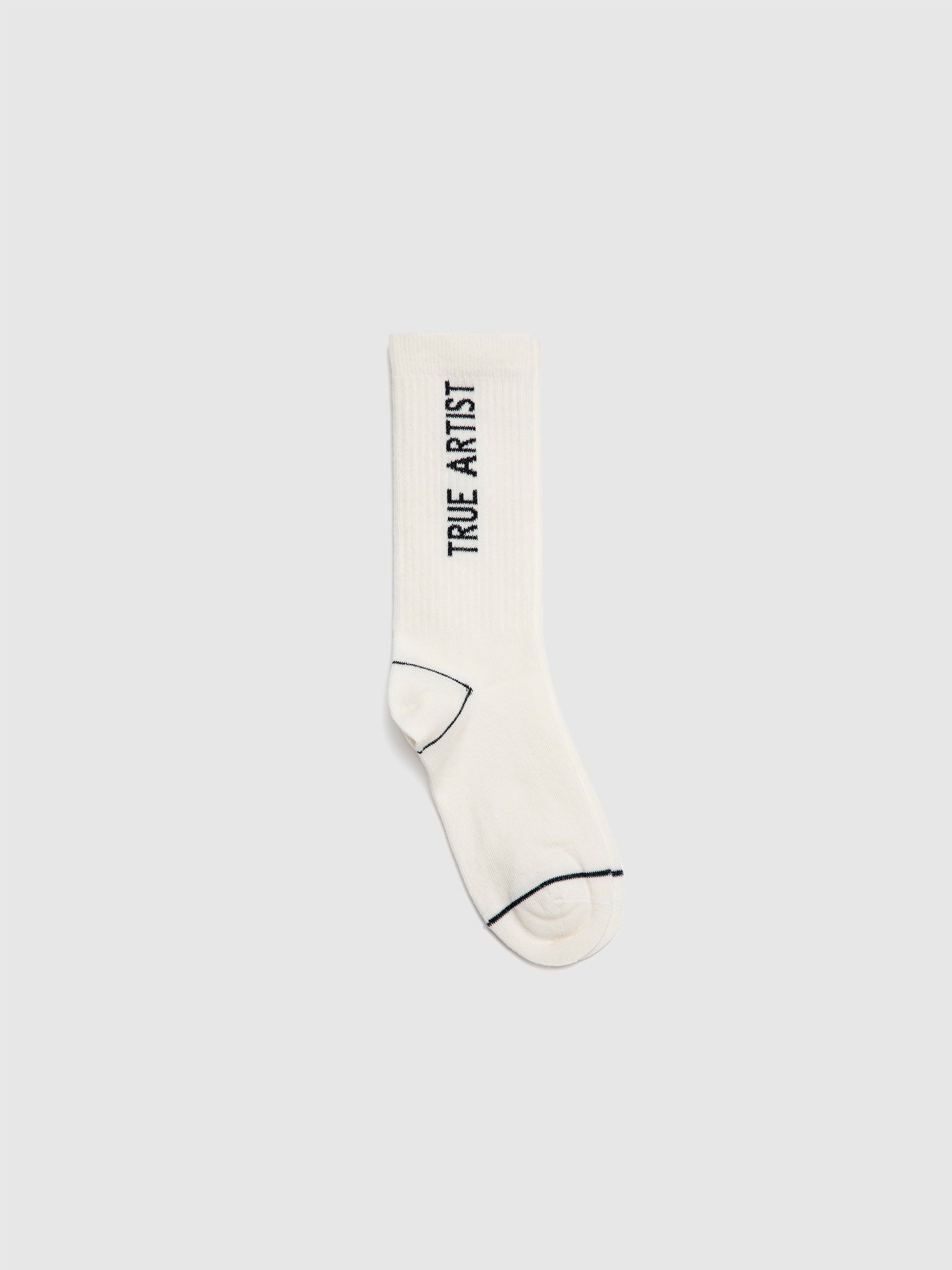 Socks nº03 in Ivory White are made of 76% cotton 20% polyamide and 3% elastane. This socks feature a TRUE ARTIST logo in contrast black color. Made in Spain.