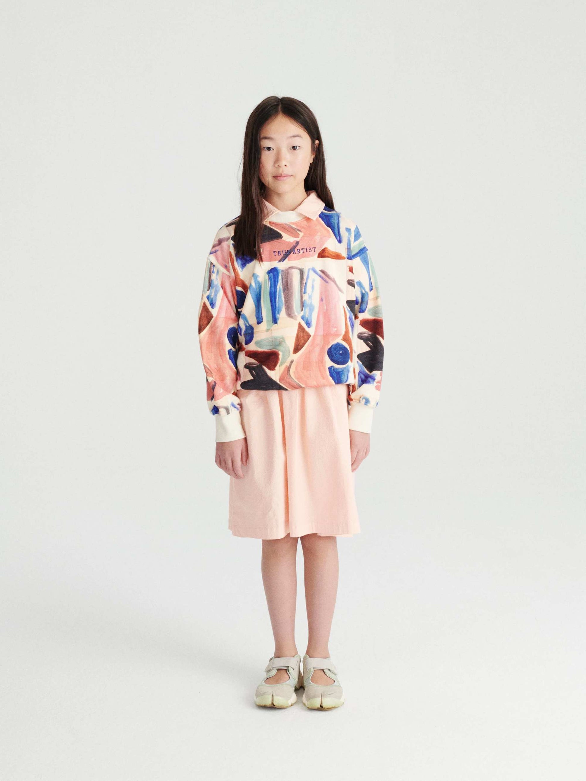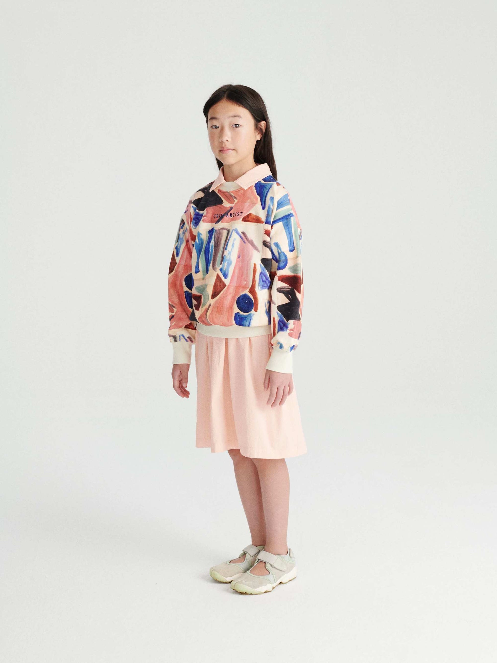 Our Sur un Voilier Sweatshirt showcases a captivating abstract colorful print. This sweatshirt is made of 100% organic cotton . It is designed with puff sleeves, dropped shoulder, ribbed cuffs, bottom and neck in contrast ecru color. It has a relaxed fit. Made in Spain.