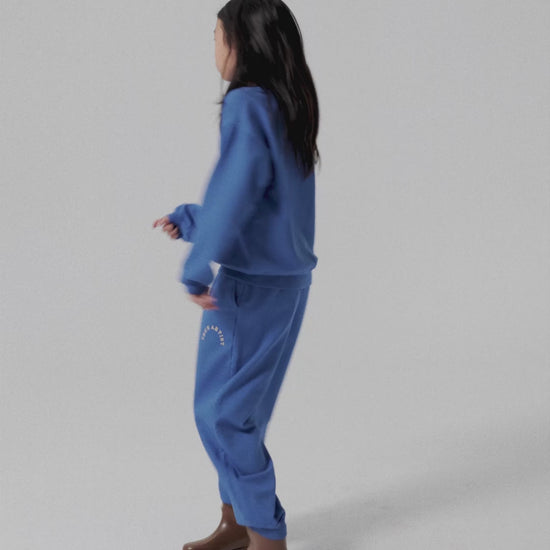 Sweatpants nº07 in Beaucoup Blue are made of 98% cotton and 2% elastane fleece. They are designed with side pockets and an elasticated waistband and elasticated cuffs at the ankles, creating a classic jogger silhouette. They feature our seasonal True Artist logo embroidered on the front. They have a relaxed fit. Made in Spain.