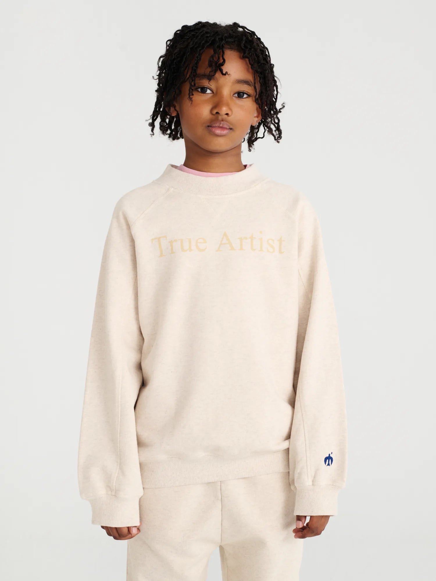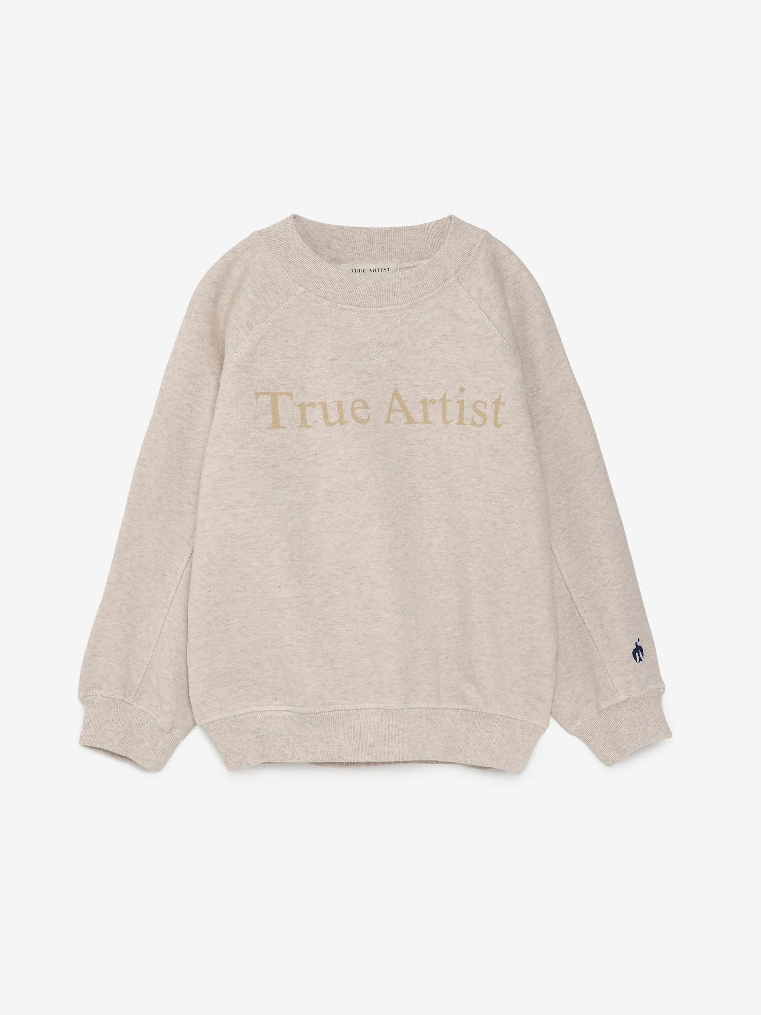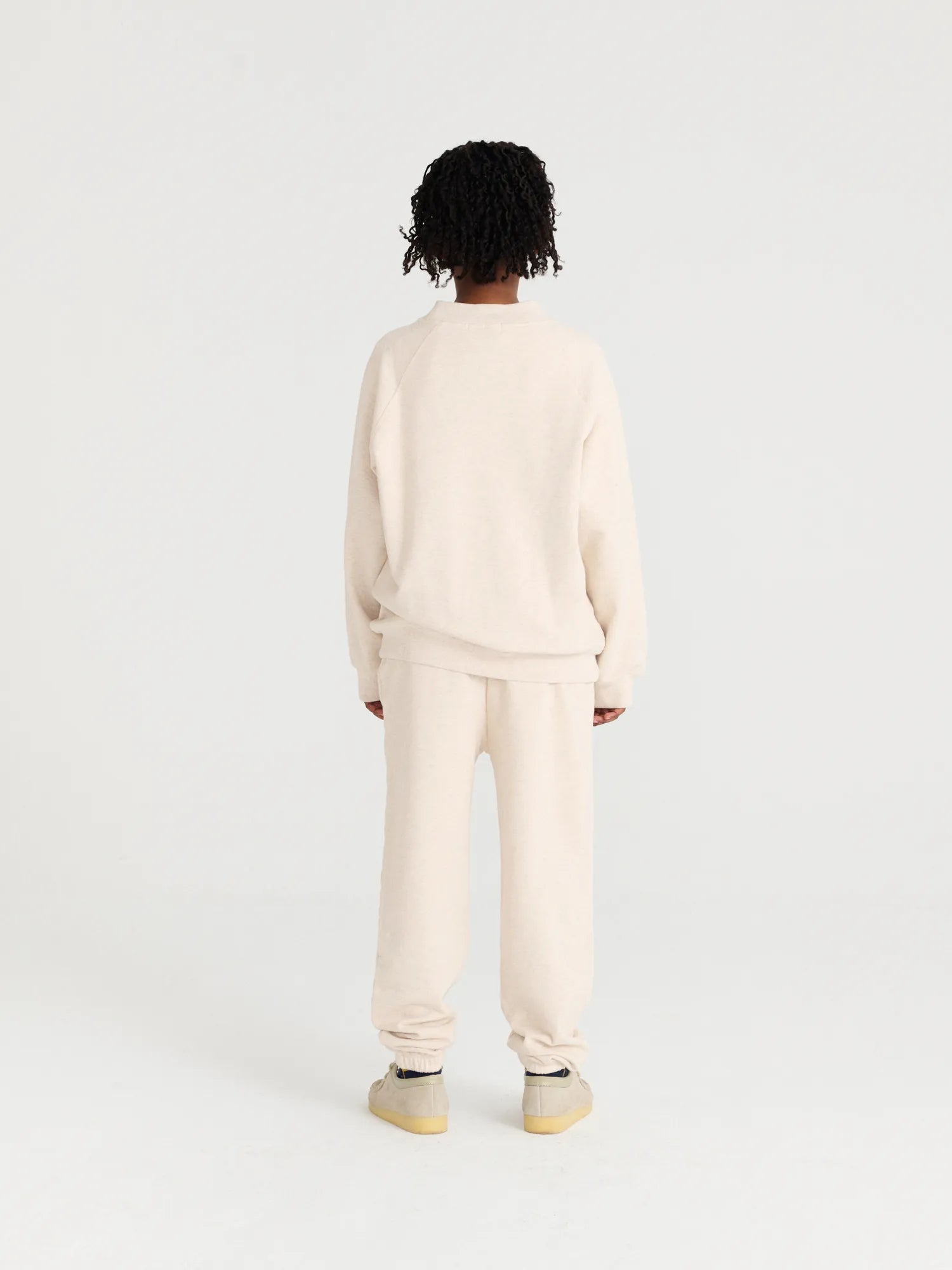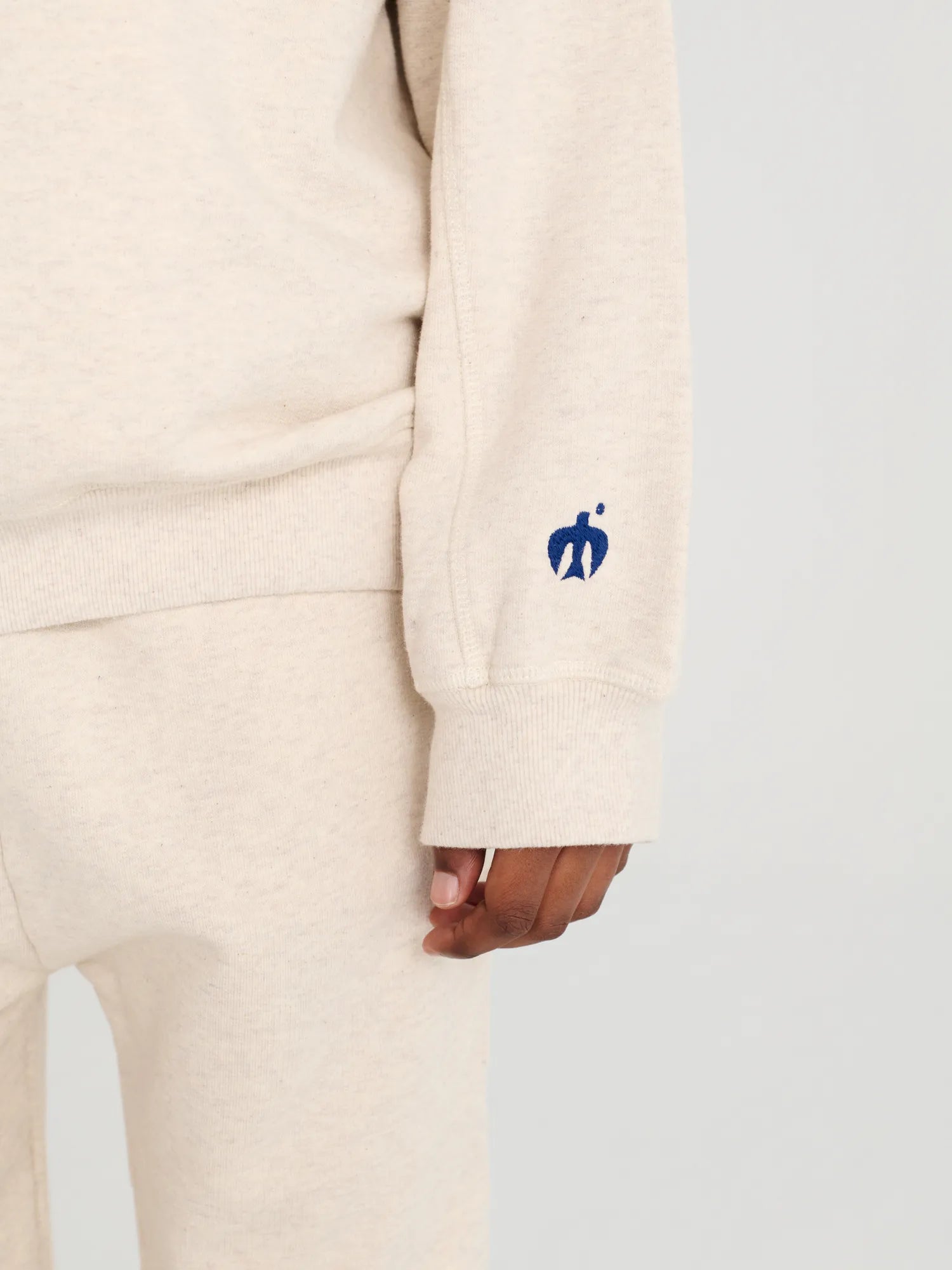 Sweatshirt nº01 in Melange Cream is made of 100% cotton fleece and has our logo printed on the front. It is designed with ranglan sleeves, ribbed at cuffs and bottom, and has our bird logo embroidered on the sleeve. It has a loose fit. Made in Portugal.