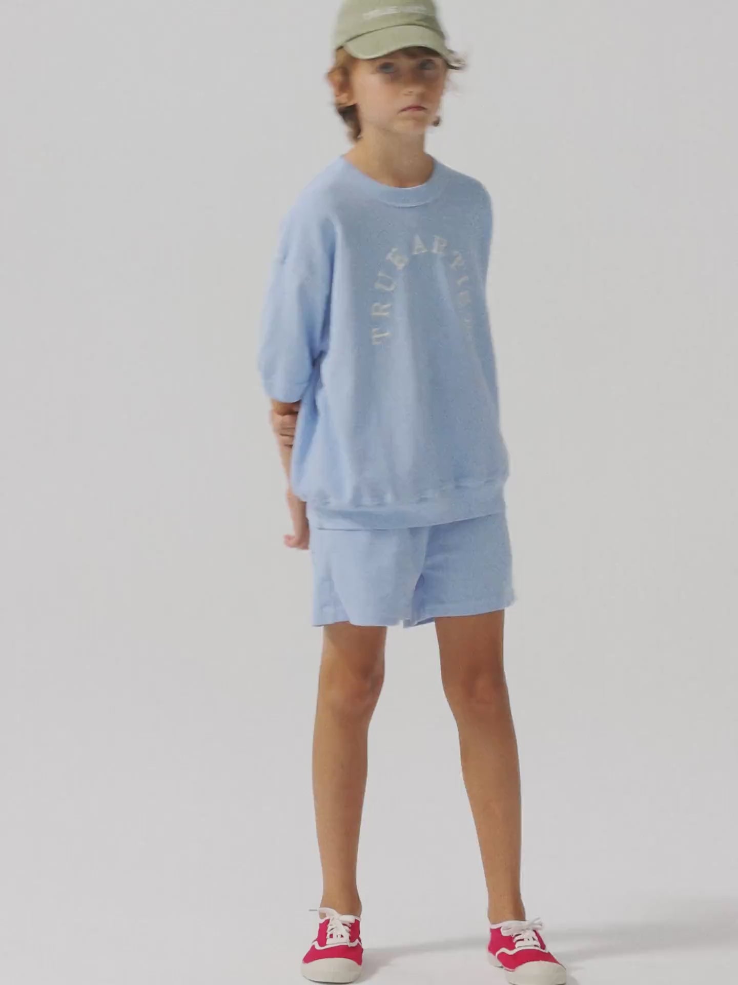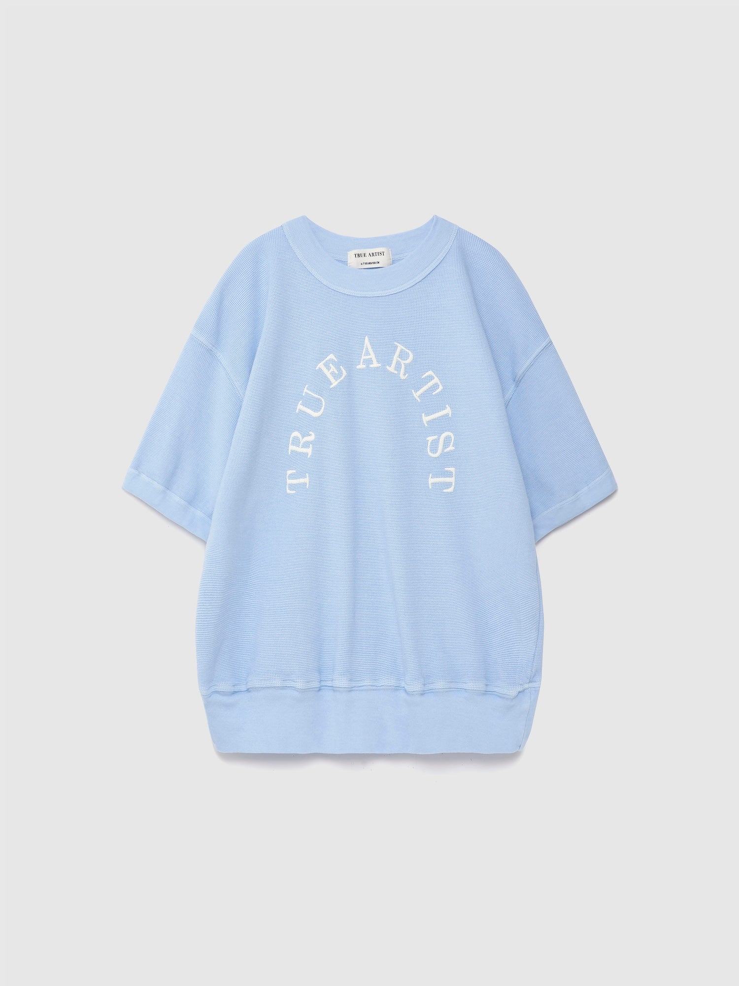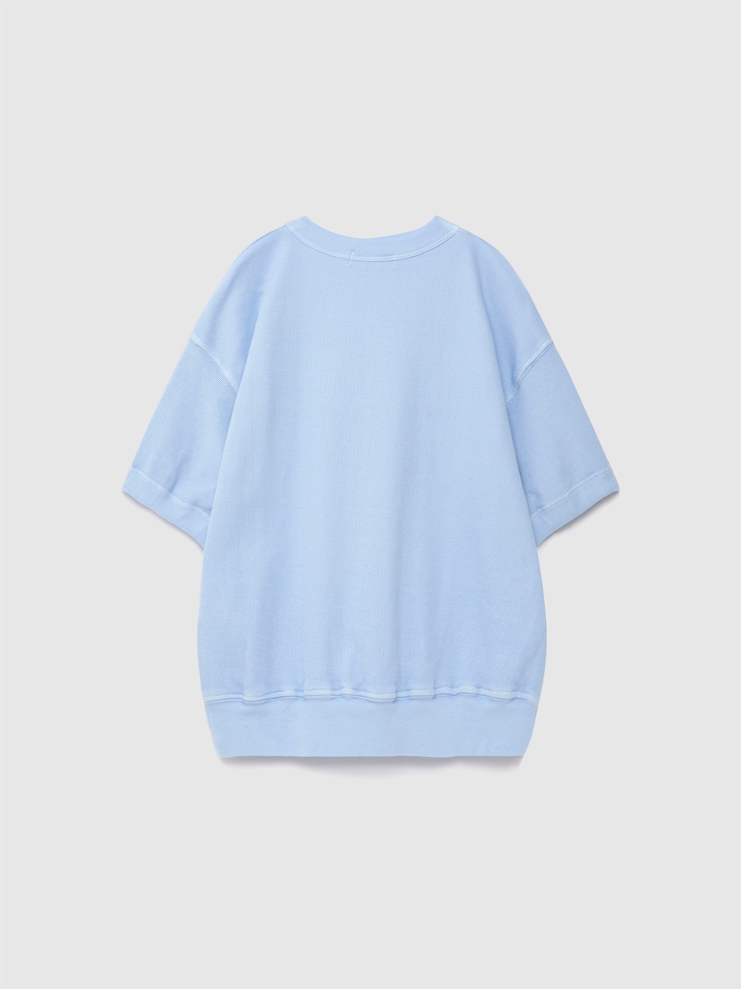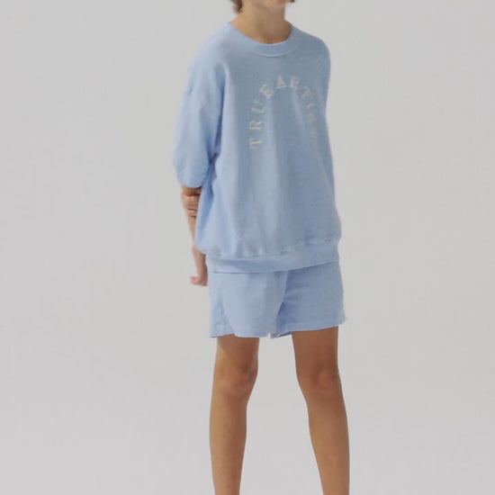 Sweatshirt nº12 in Skyride Blue is made of 100% organic cotton textured knit. This short sleeve light sweatshirt features an embroidery with our circled logo at the chest. It is designed with round neck, dropped shoulders and rib at collar, cuffs and bottom. It has a loose fit. Made in Spain.