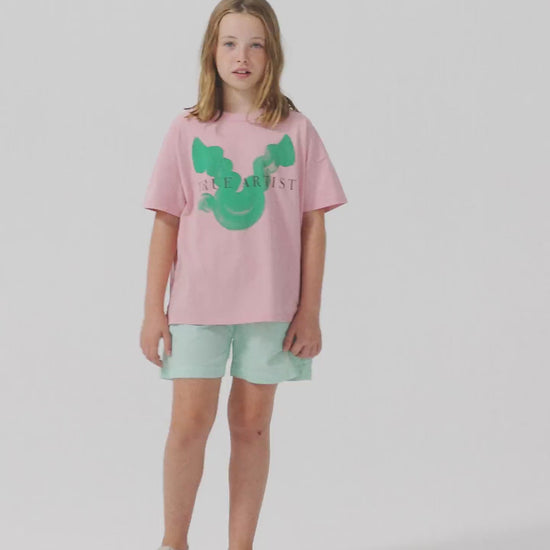 T-shirt nº01 in Cameo Pink is made of 100% organic cotton and it features a seasonal bird motif printed on the front. It is designed with dropped shoulders, round neck and short sleeves. It has a boxy fit. Made in Portugal.