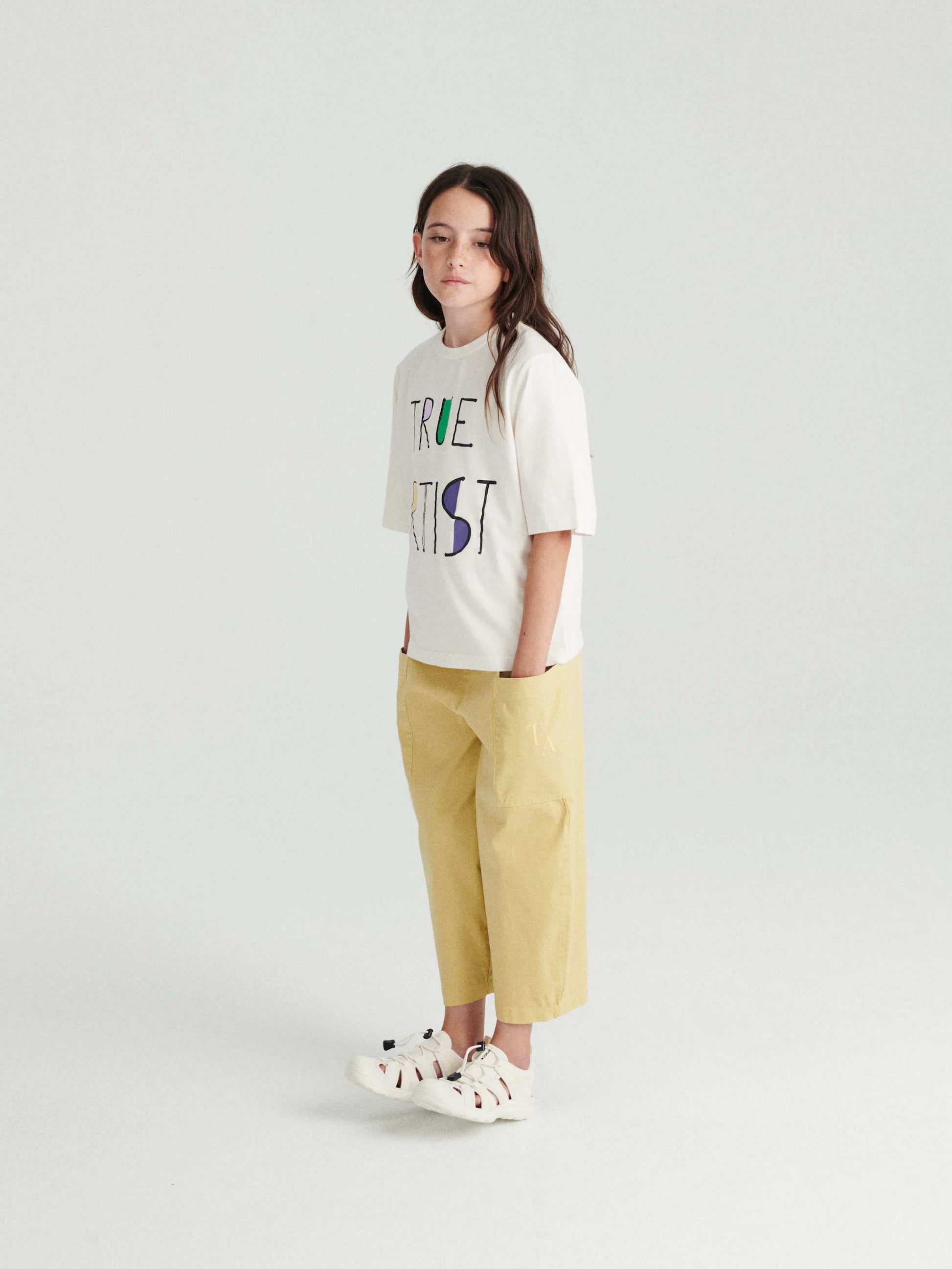T-shirt nº05 in True Ivory White is made of 100% organic cotton and features a colorful True Artist lettered design on the front. This short sleeve t-shirt is designed with round neck and dropped shoulders. It has a relaxed fit. Made in Portugal.