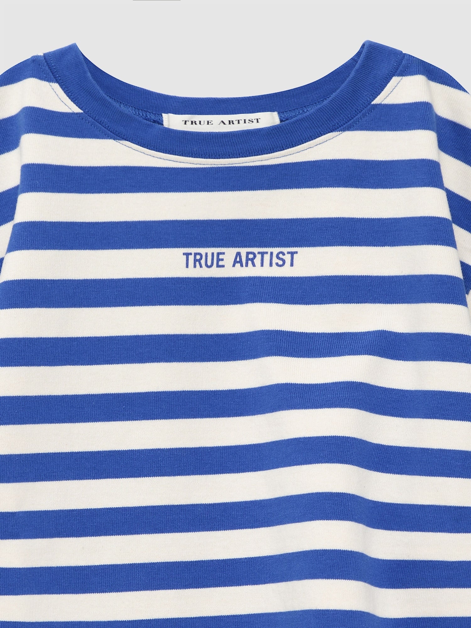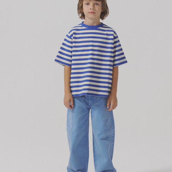 T-shirt nº11 in Lapis Blue is made of 100% cotton and it features a front positional small brand logo. This short sleeve t-shirt is designed with yarn dyed stripes, round neck and dropped shoulders. It has a relaxed fit. Made in Portugal.