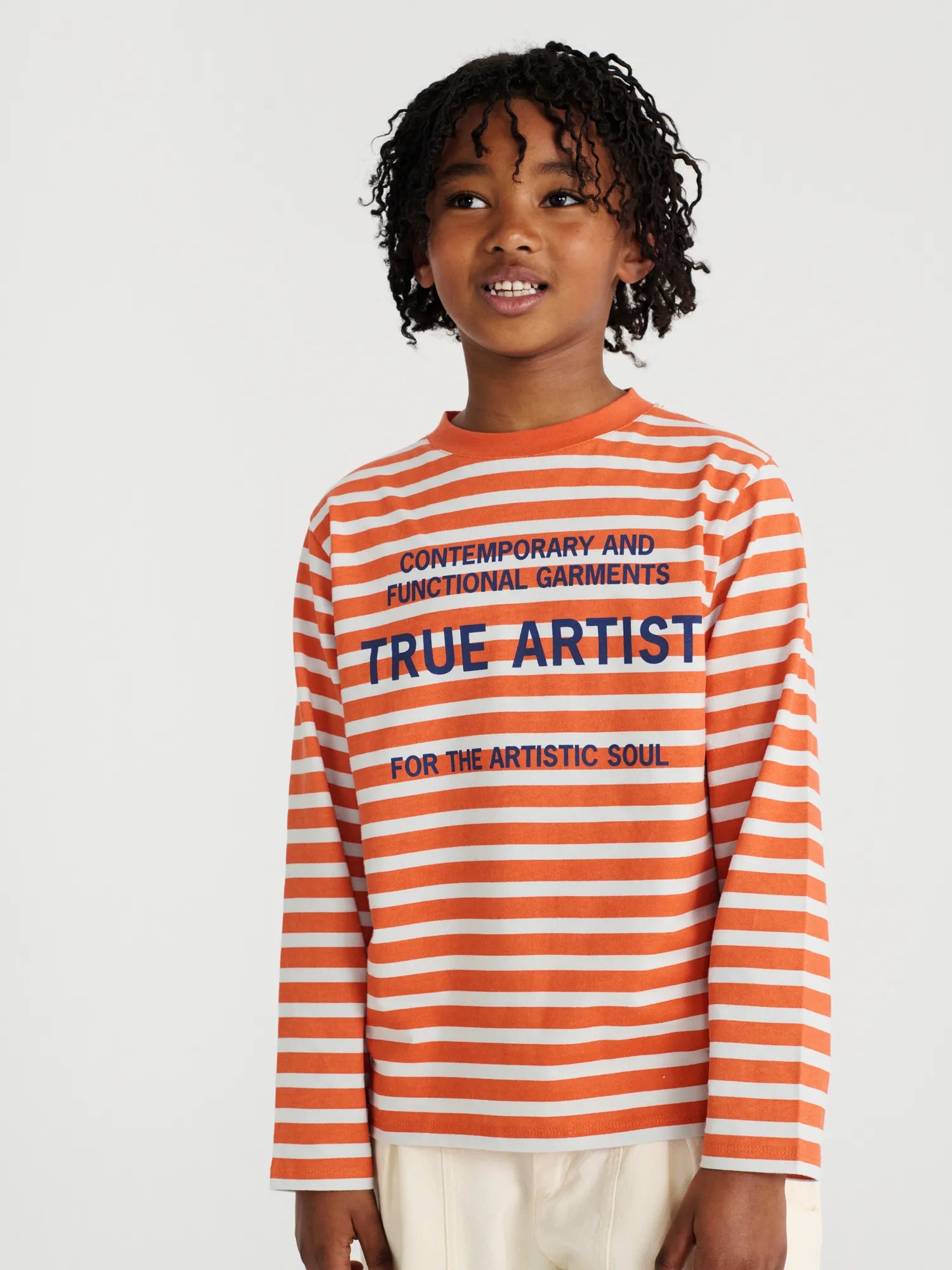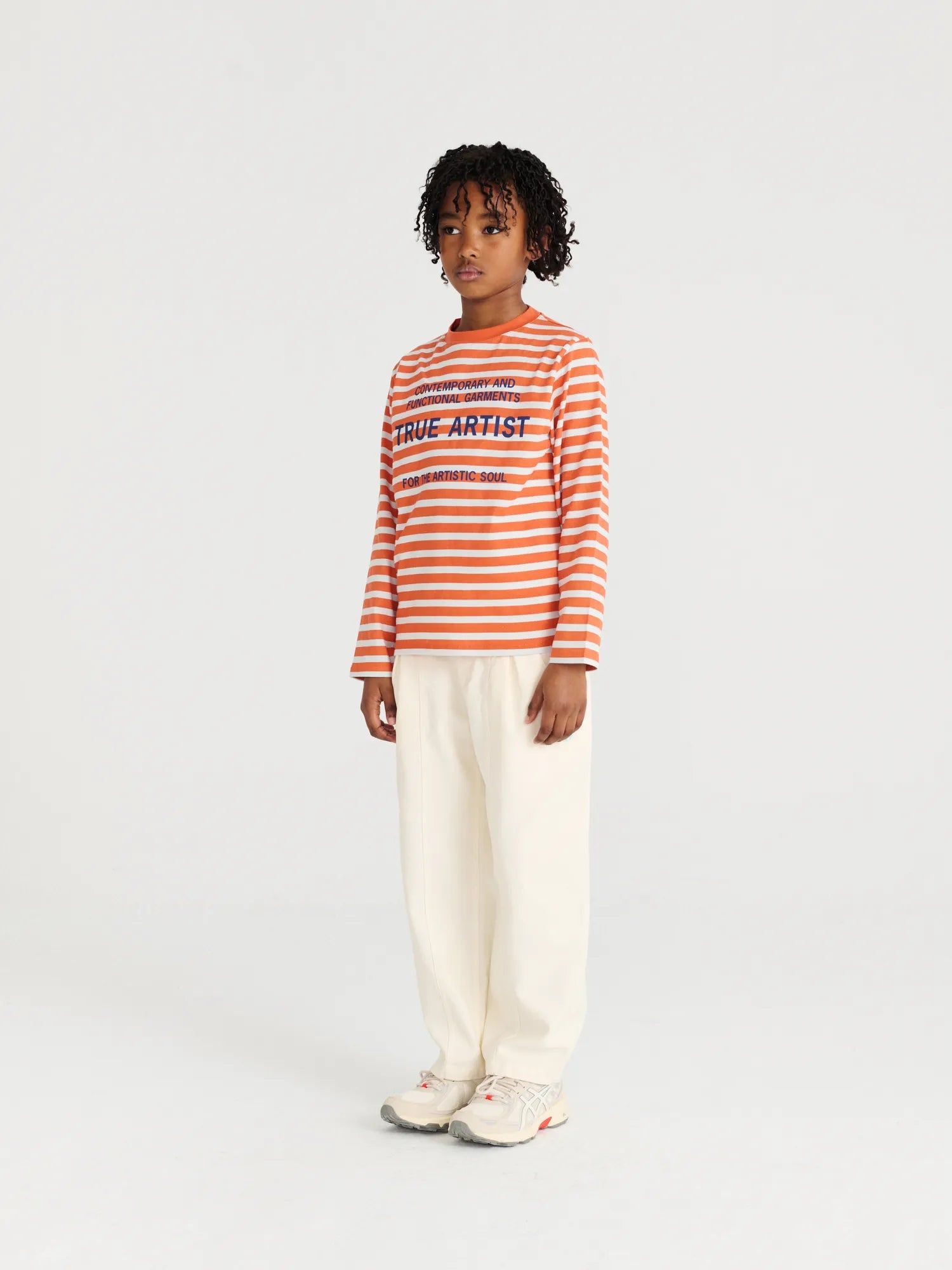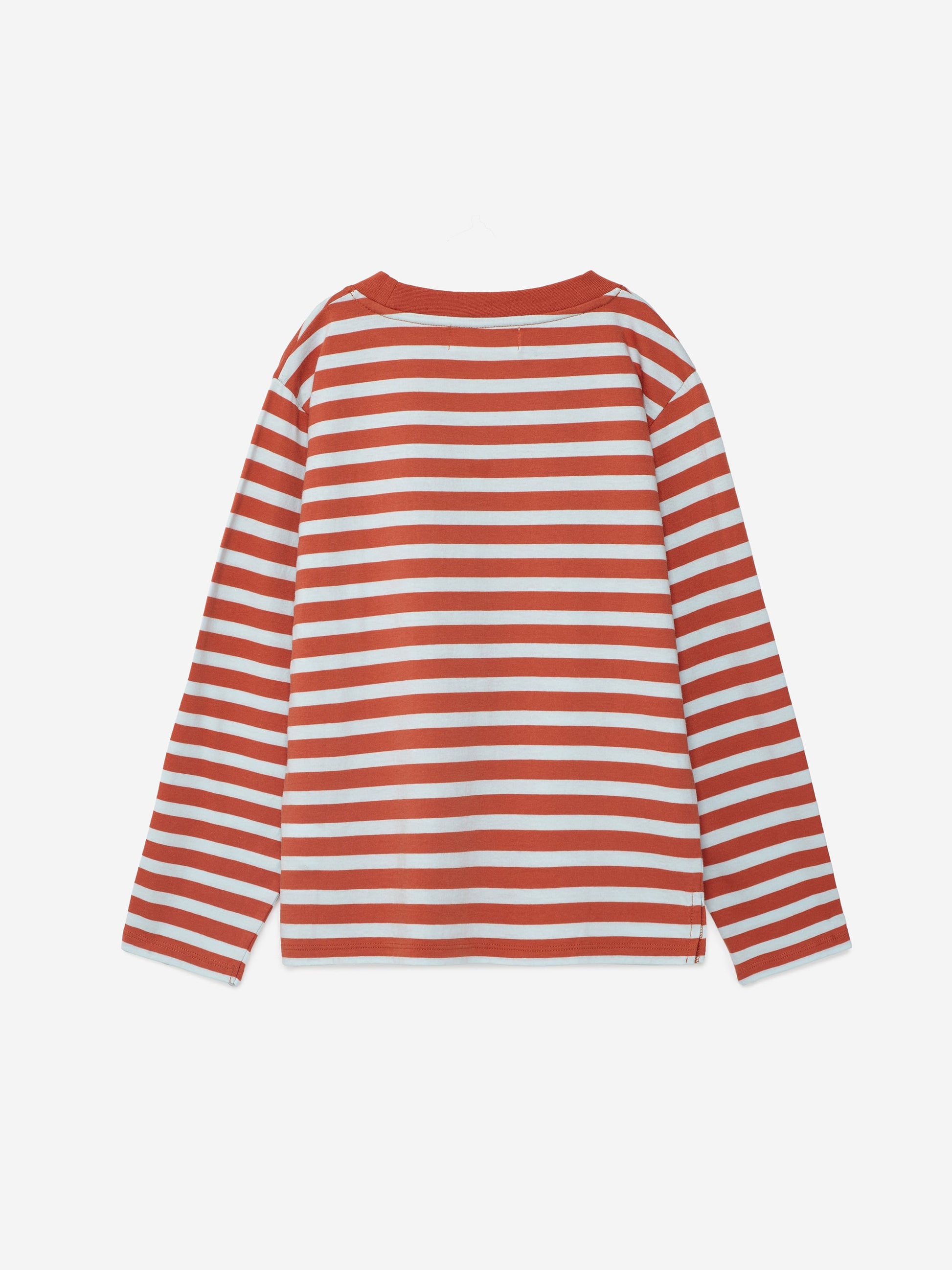 T-shirt nº16 in Blue Glow is made of 100% cotton. This yarn dyed striped t-shirt features our brand slogan printed on the front. It is designed with round neck, long sleeves and dropped shoulders; it has a relaxed fit. Made in Portugal.