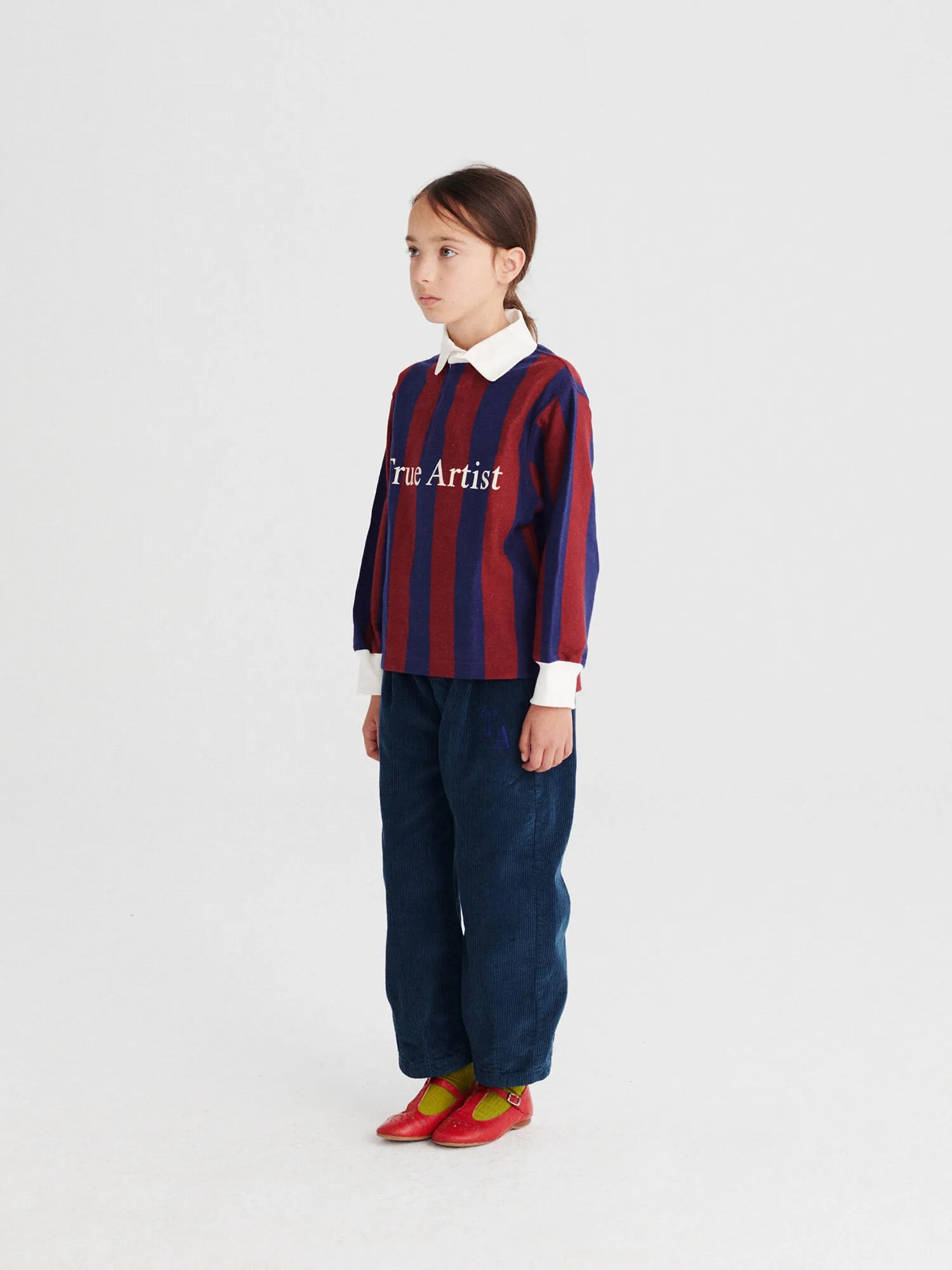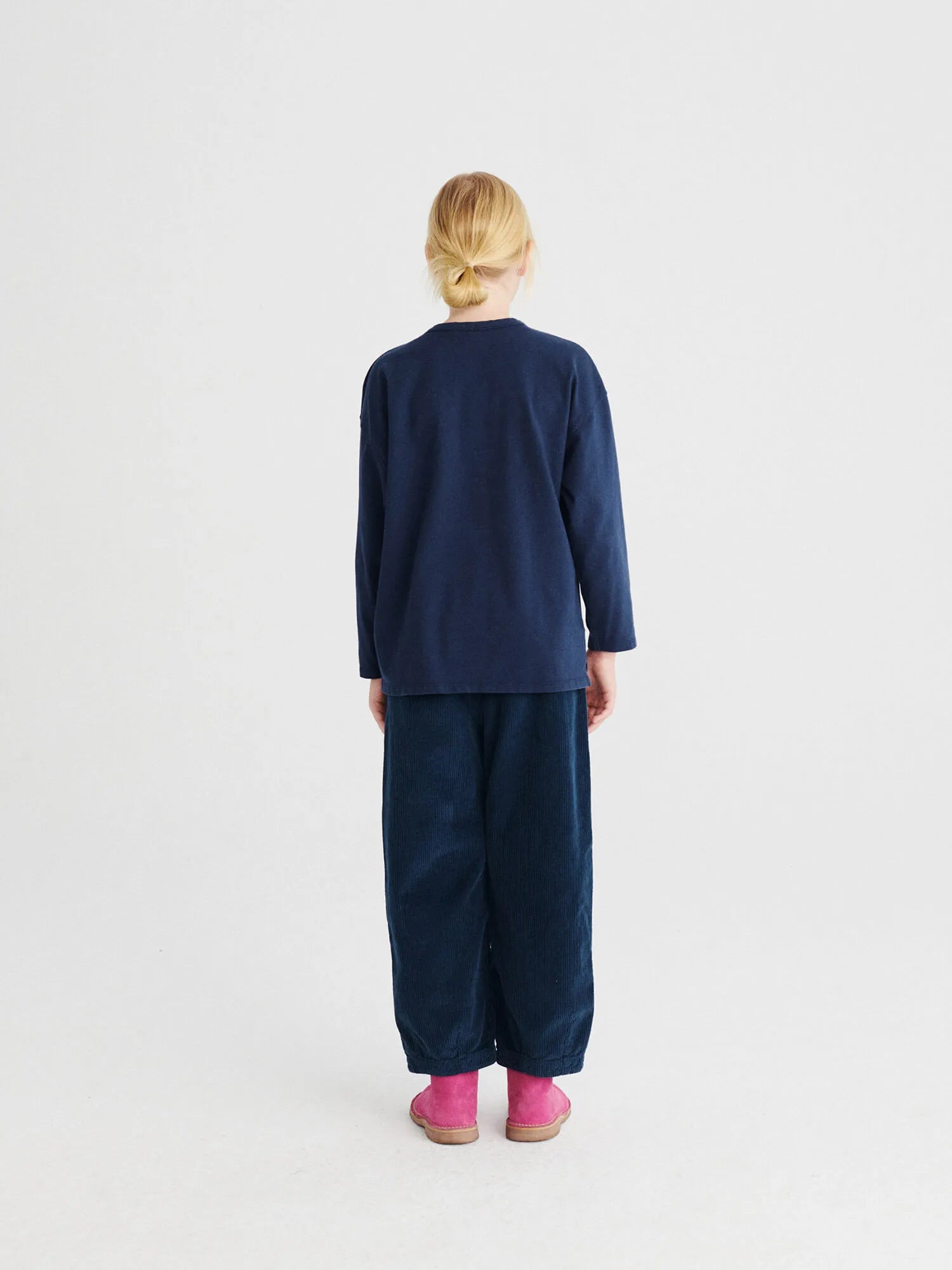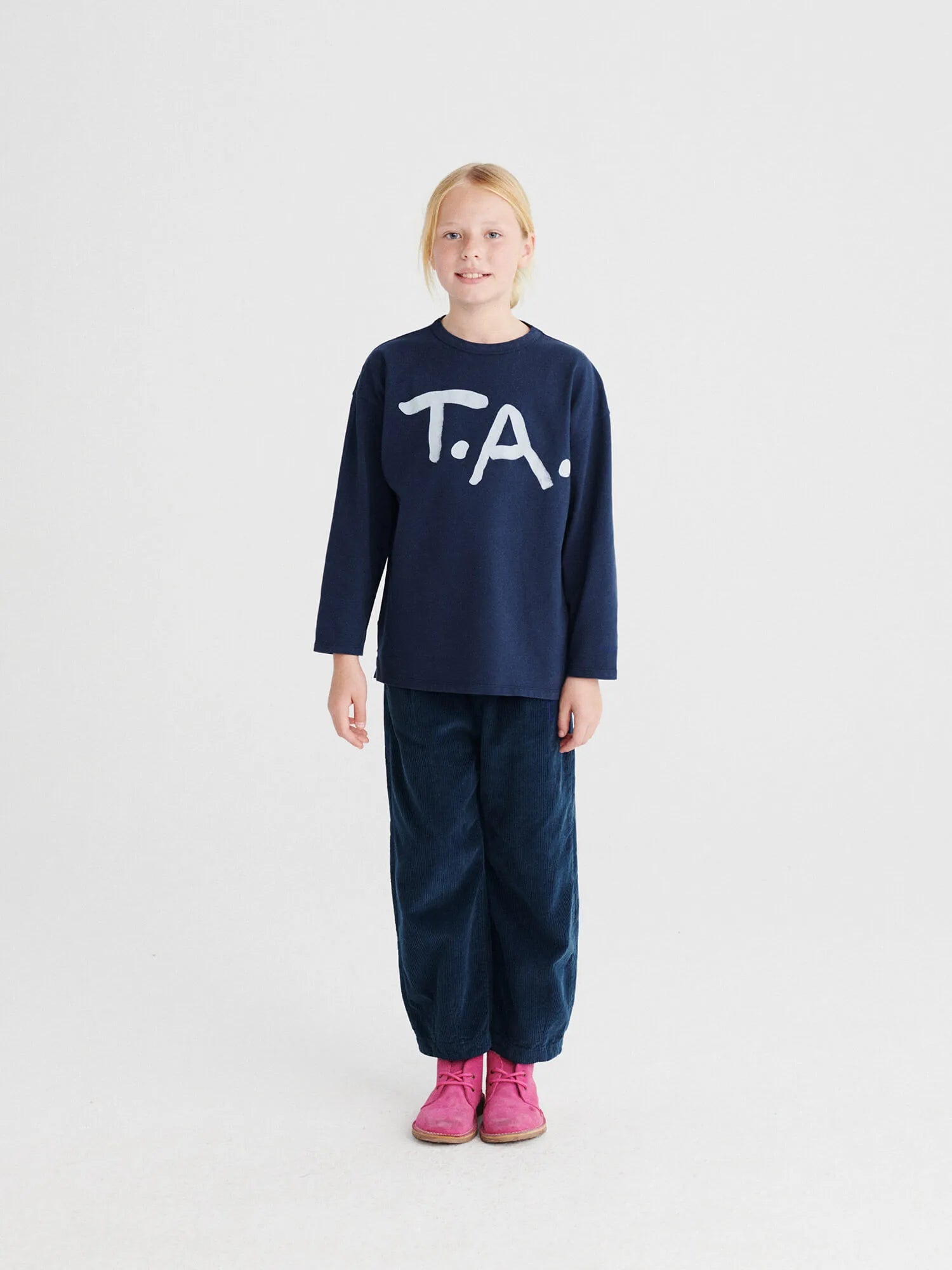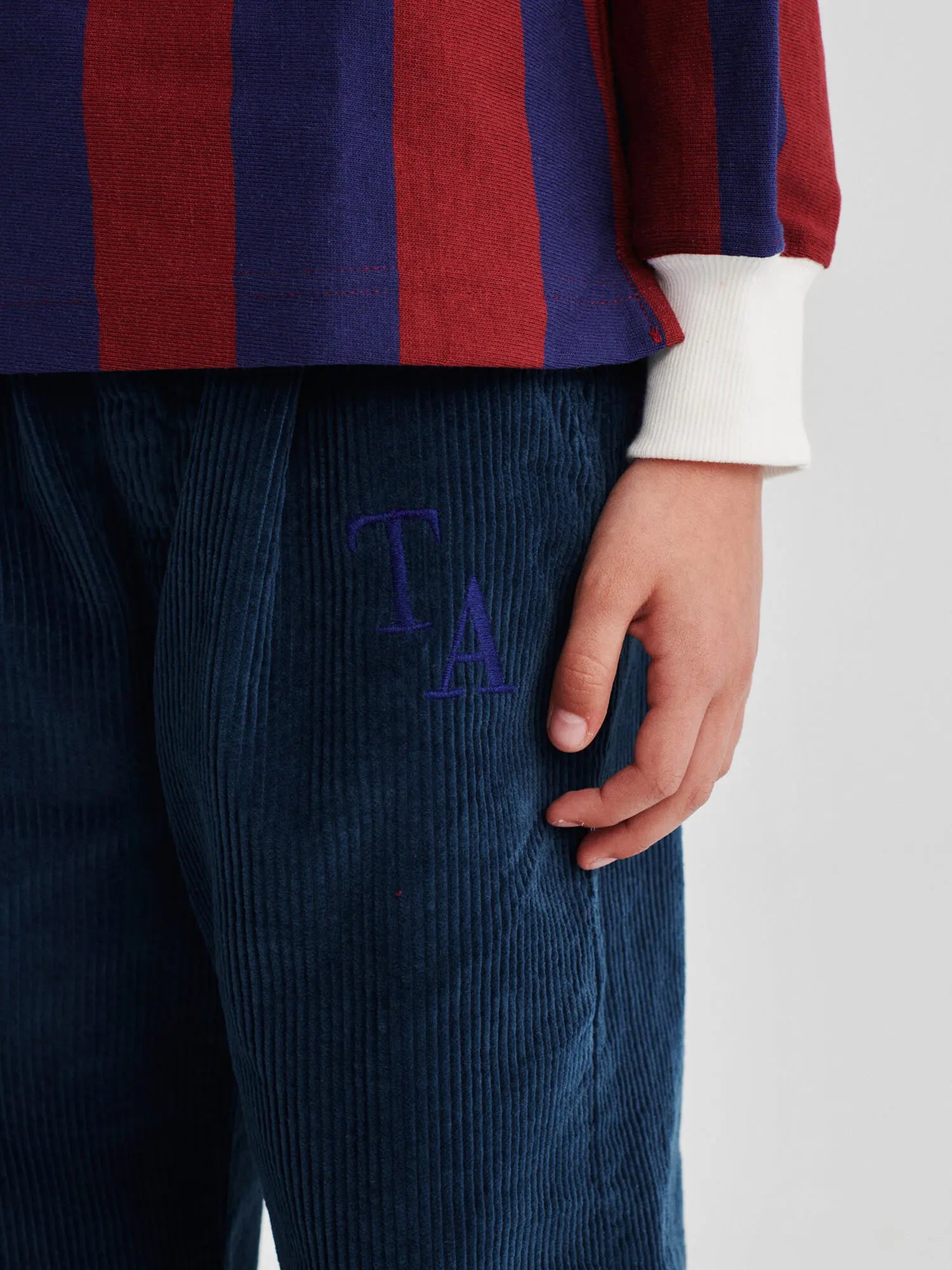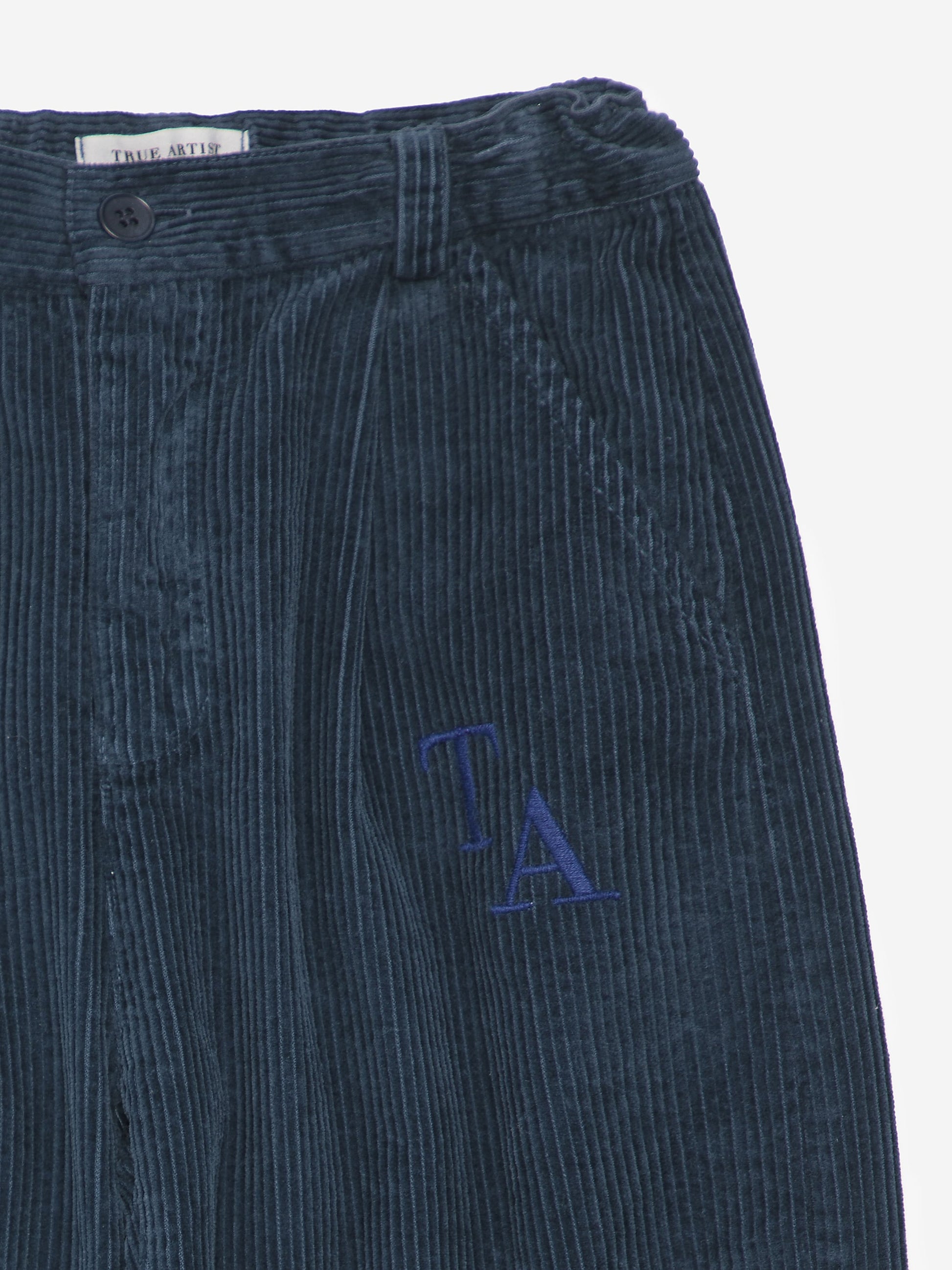 Trousers nº01 in Navy Blue are made of 100% cotton corduroy and have our TA logo embroidered on the front. These slouchy chino pants are designed with adjustable waistband, slash pipped pockets and front zip and button fastening. They have a cocoon fit. Made in Spain.