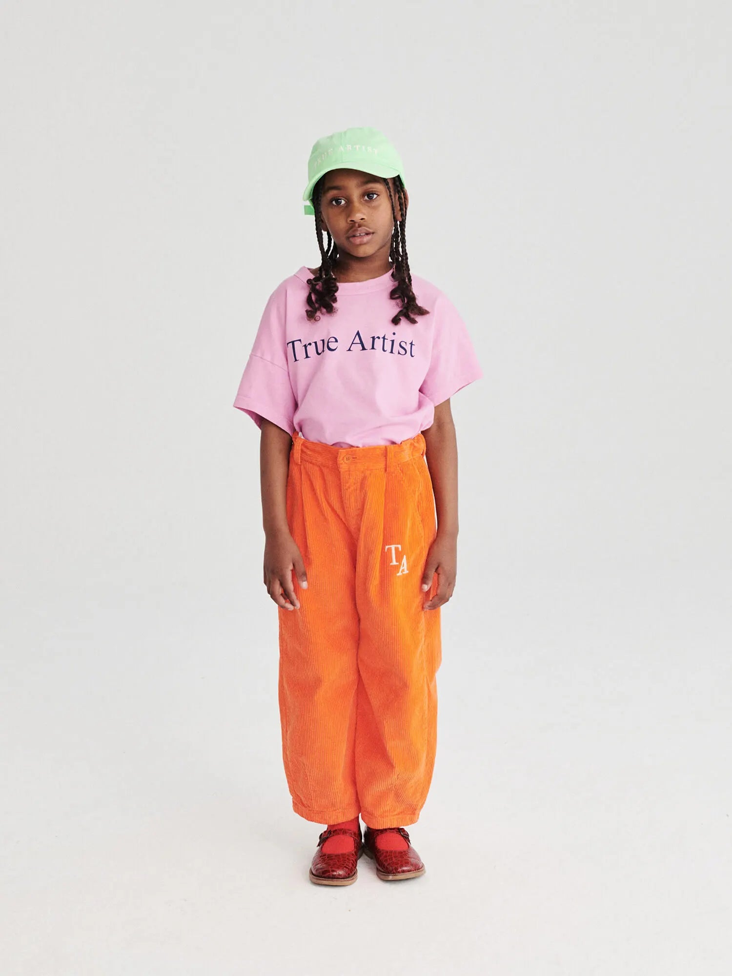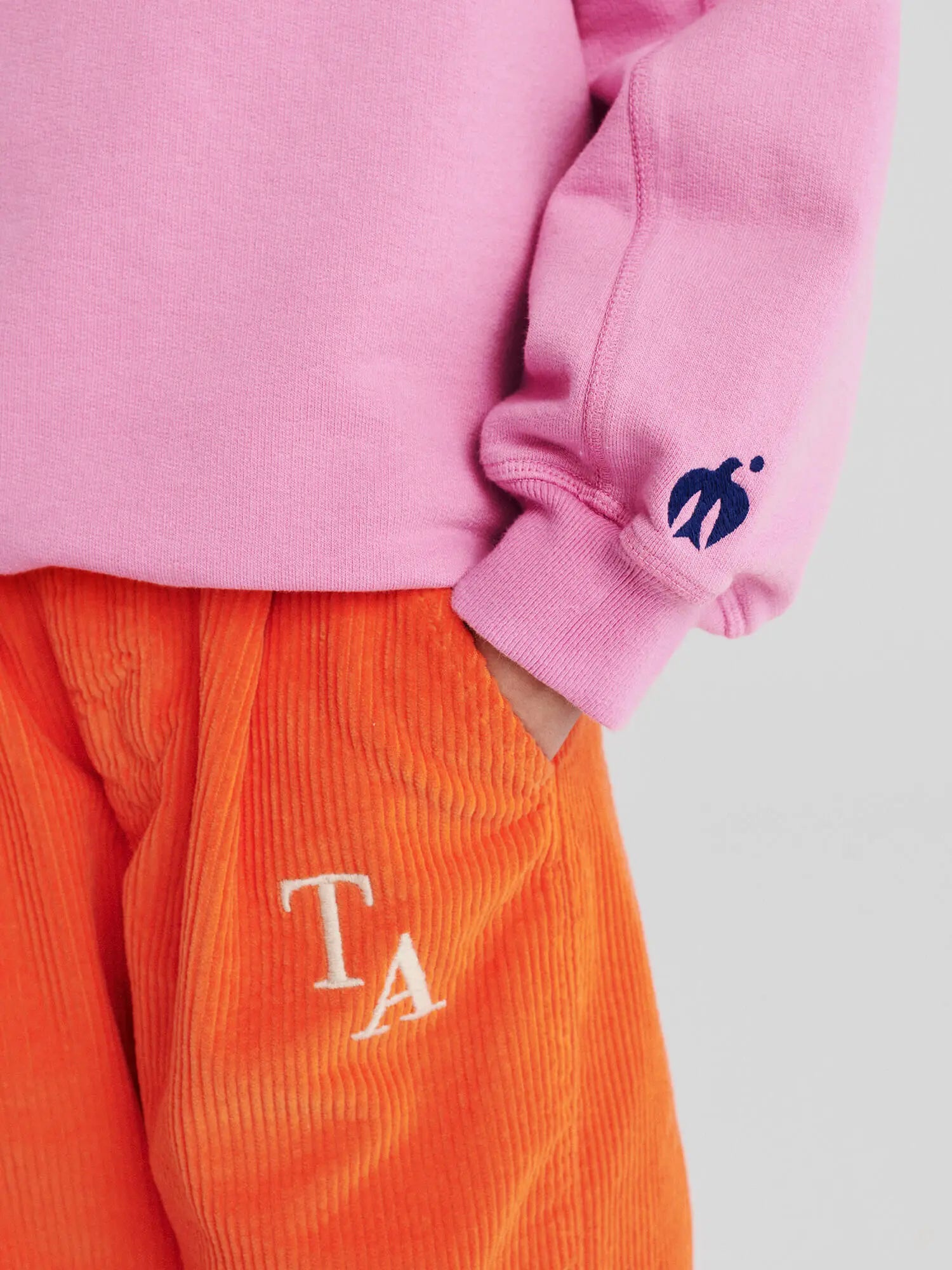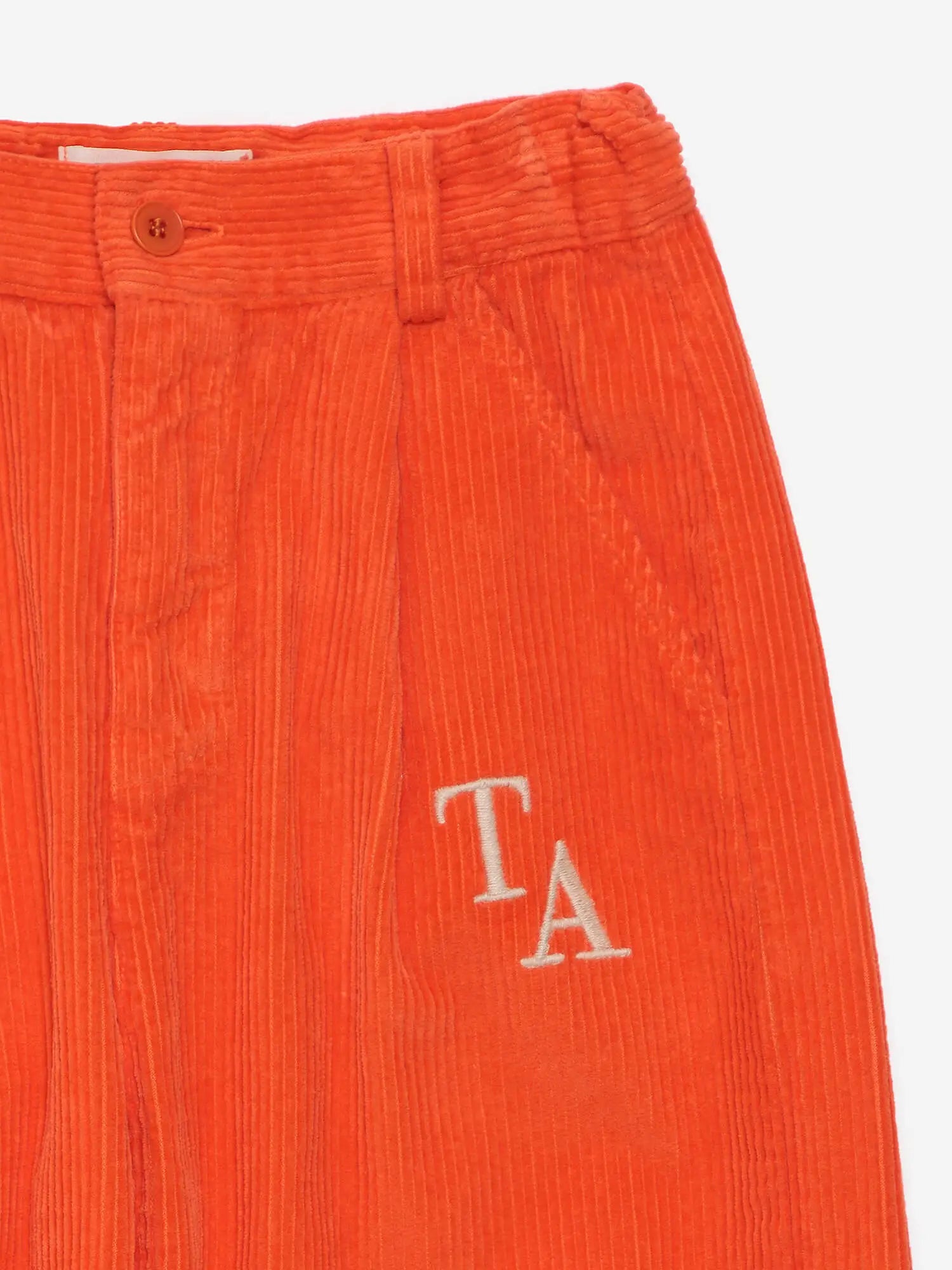 Trousers nº01 in Persimmon Orange are made of 100% cotton corduroy and have our TA logo embroidered on the front. These slouchy chino pants are designed with adjustable waistband, slash pipped pockets and front zip and button fastening. They have a cocoon fit. Made in Spain.