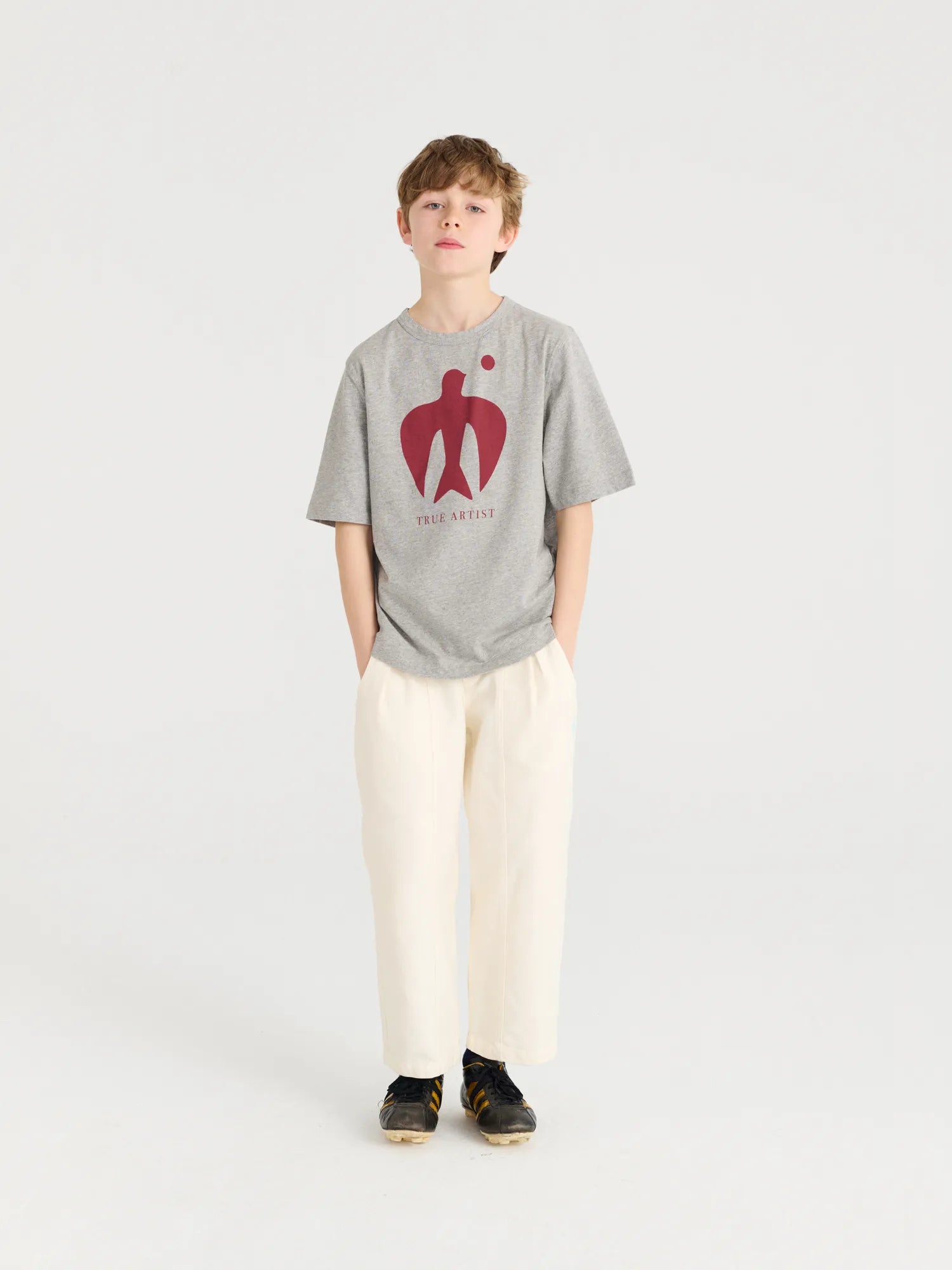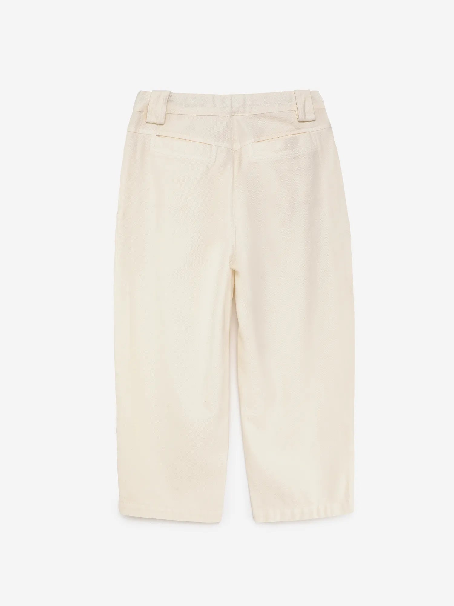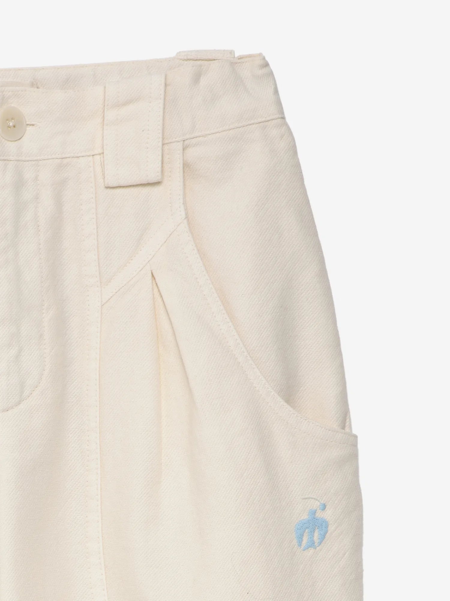 Trousers nº11 in Ivory White are made of 70% cotton and 30% recycled cotton and have a small embroidery of our bird logo on the front. These pants are designed with front zip fastening, slash pockets and relaxed crotch. They have a straight fit. Made in Spain.