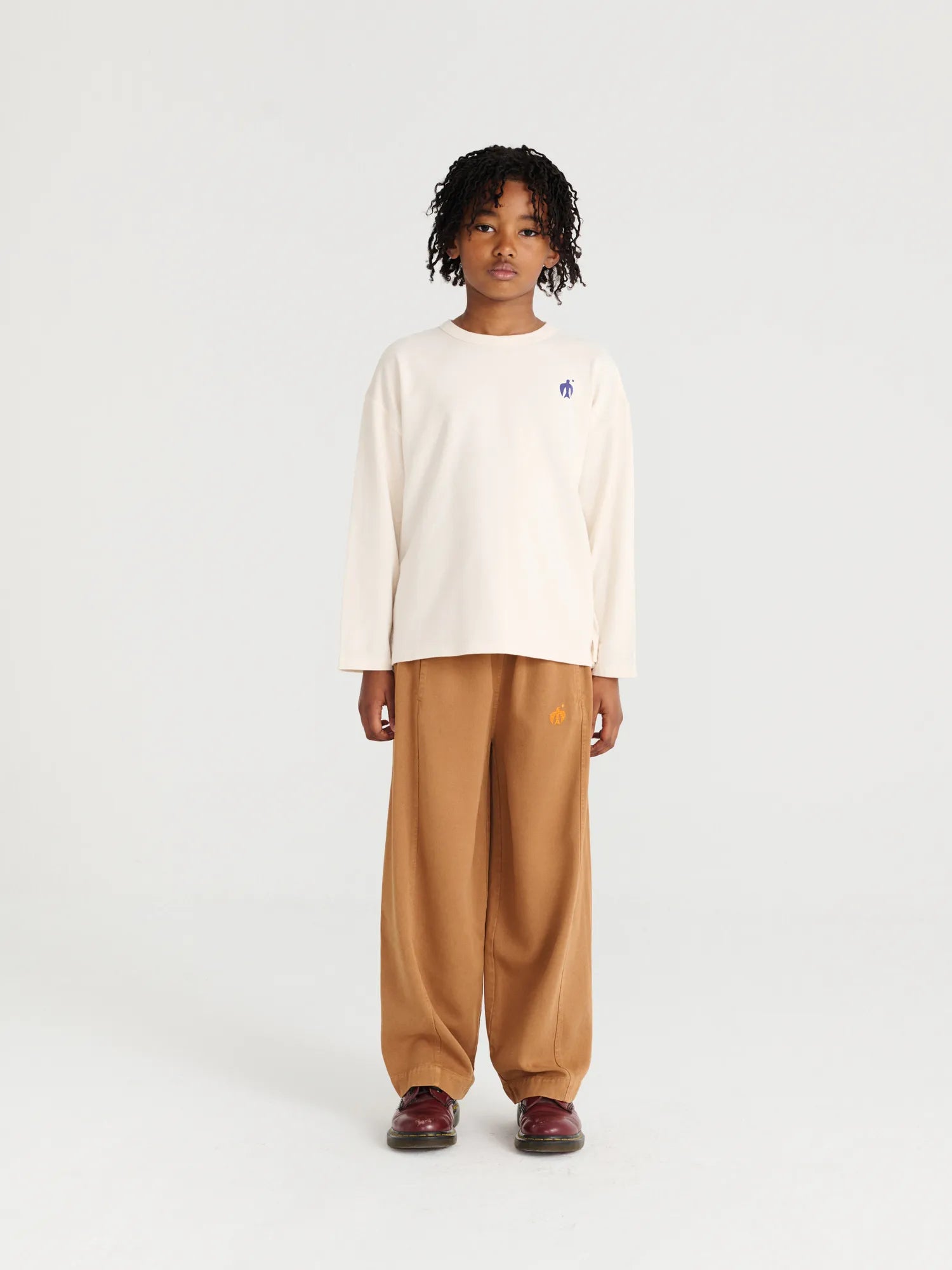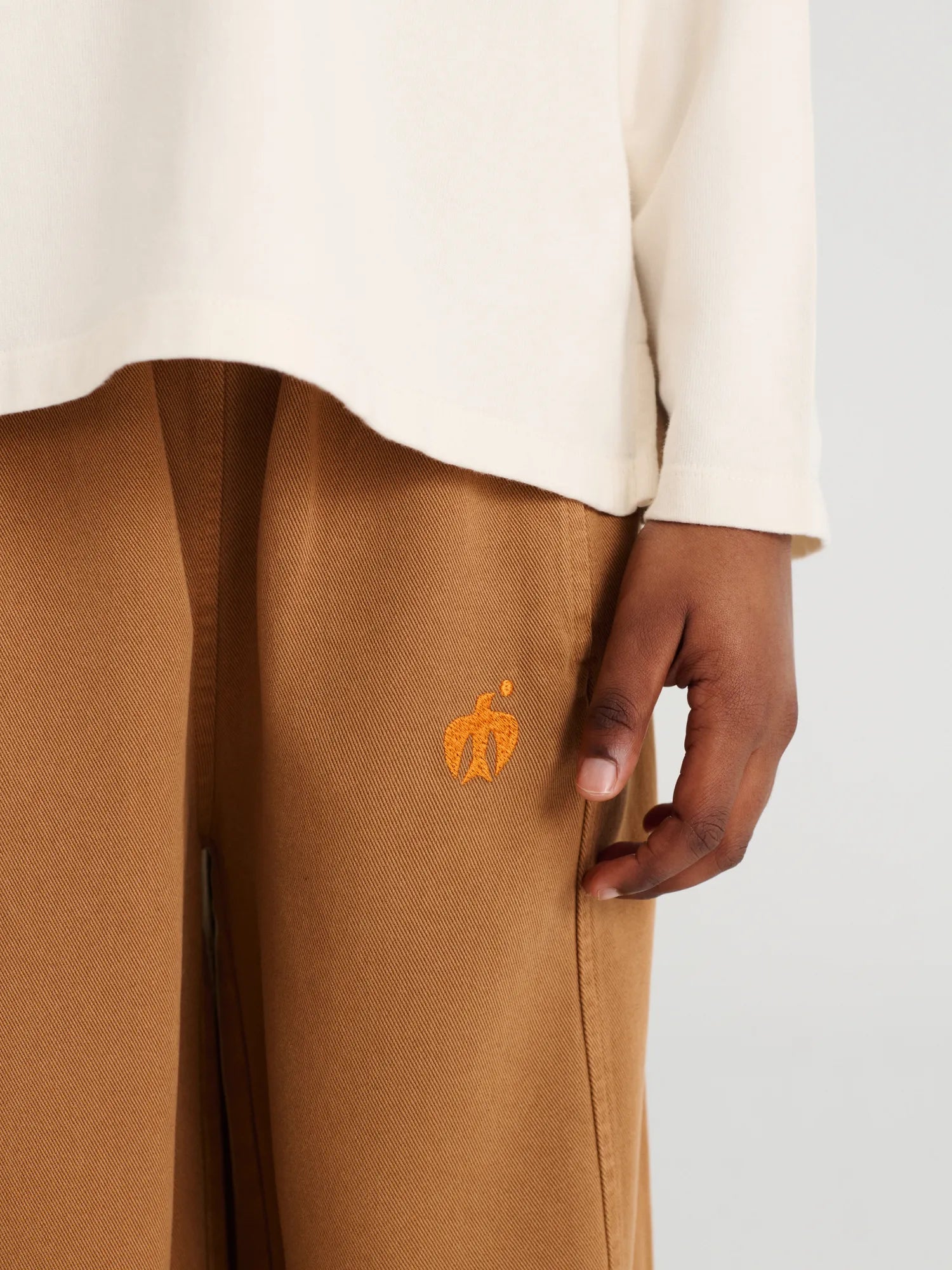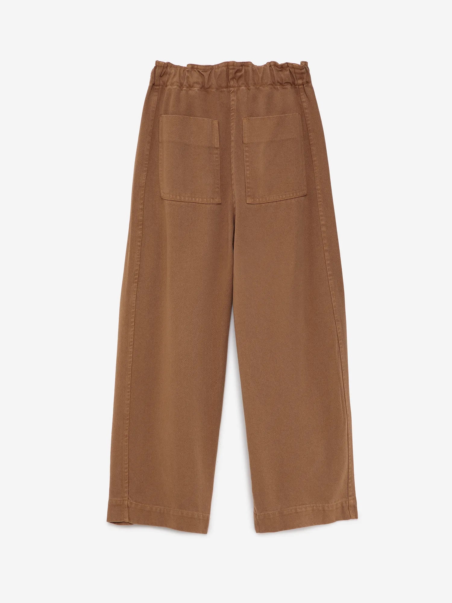 Trousers nº13 in Mocha Brown are made of 70% cotton and 30% recycled cotton. They are designed with an elasticated, ruffled paperbag waist for a comfortable and adjustable fit. They have side pockets and they feature an embroidery of our bird logo in contrast color on the upper right thigh. They have a straight fit. Made in Spain.
