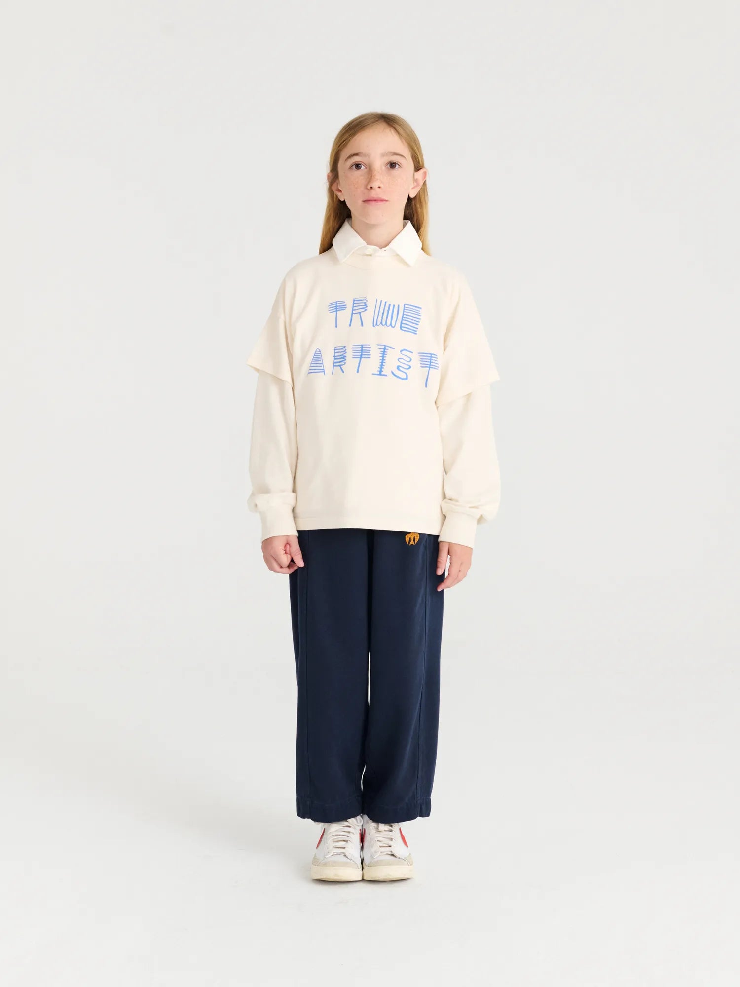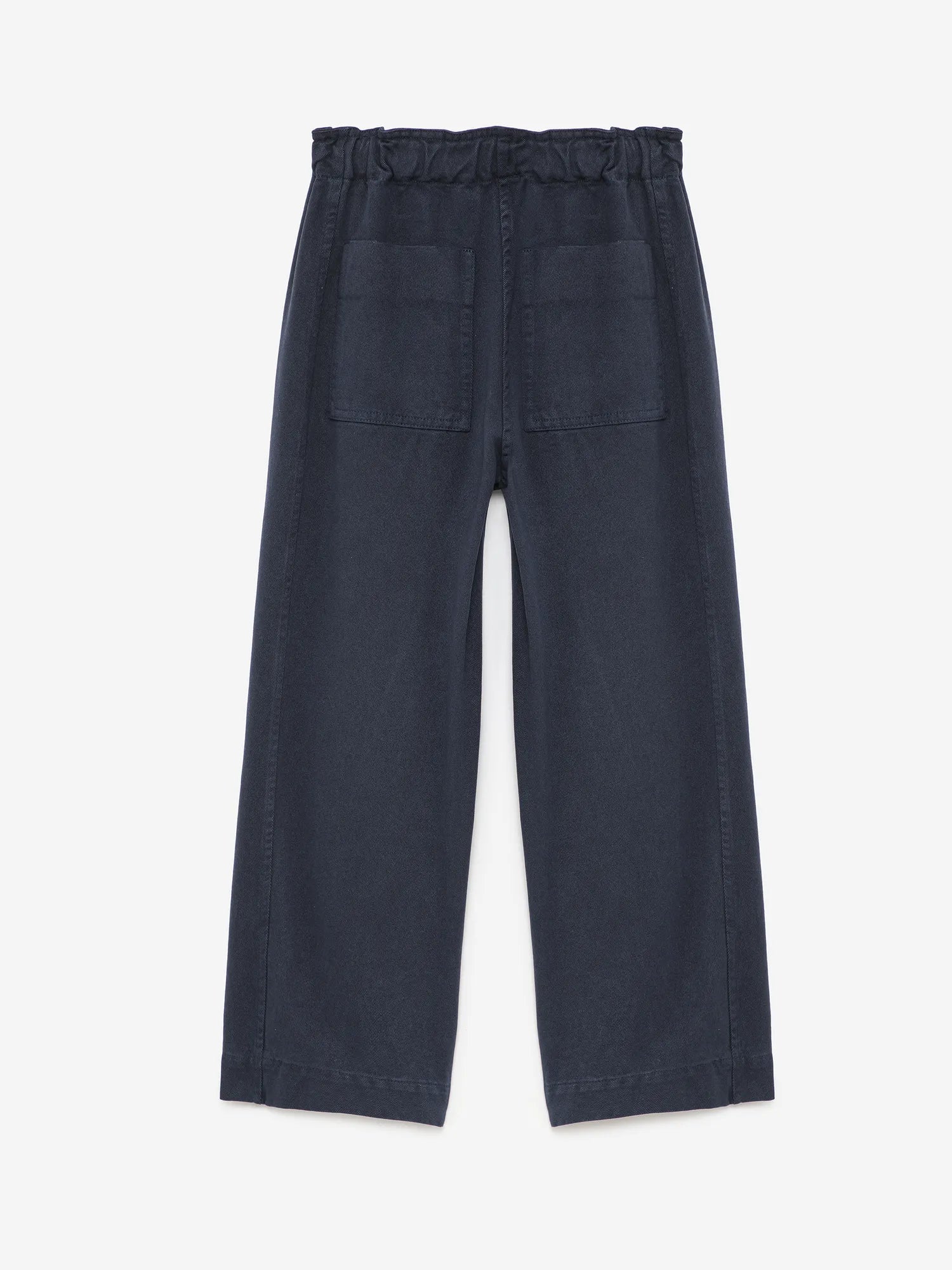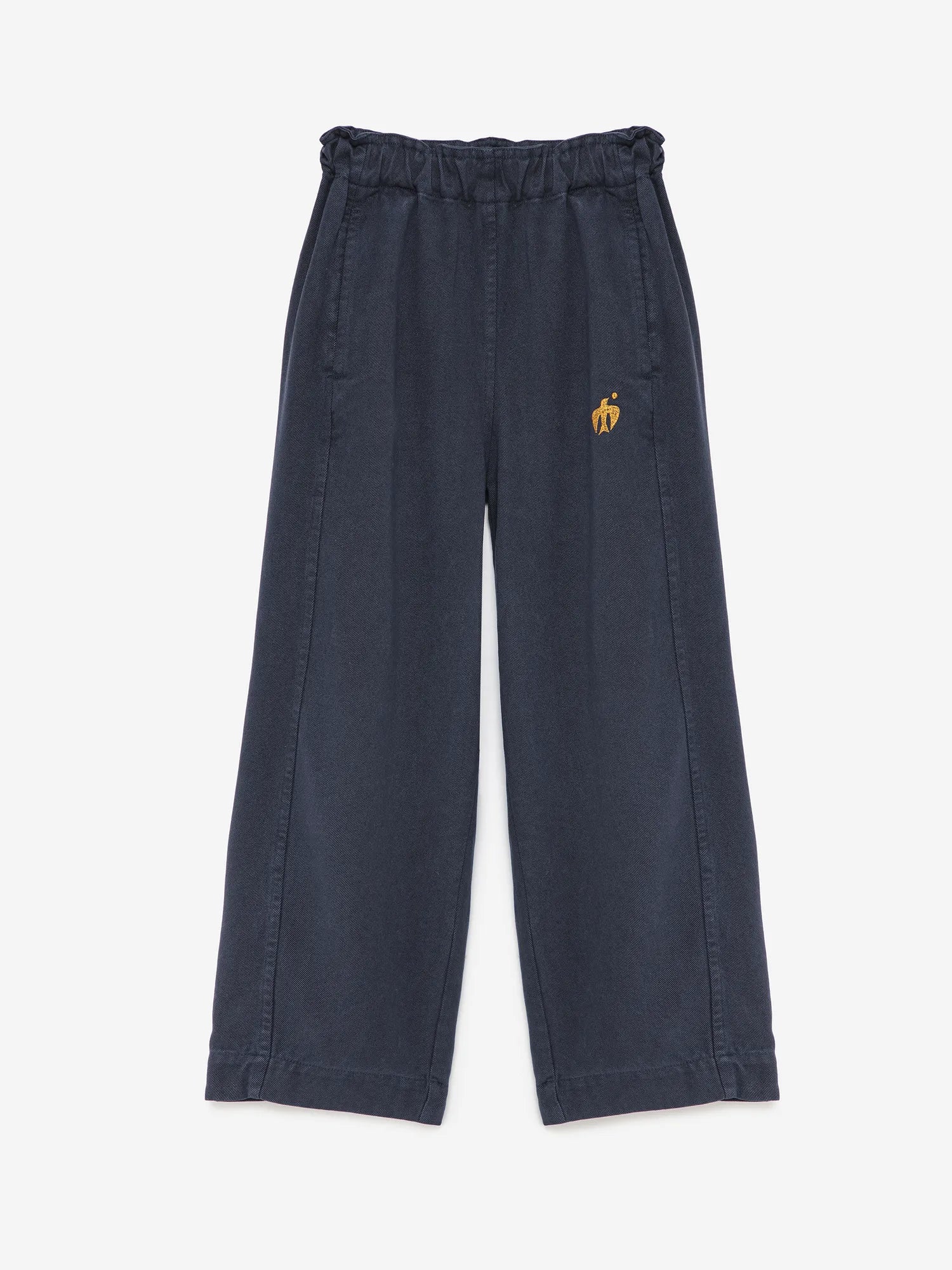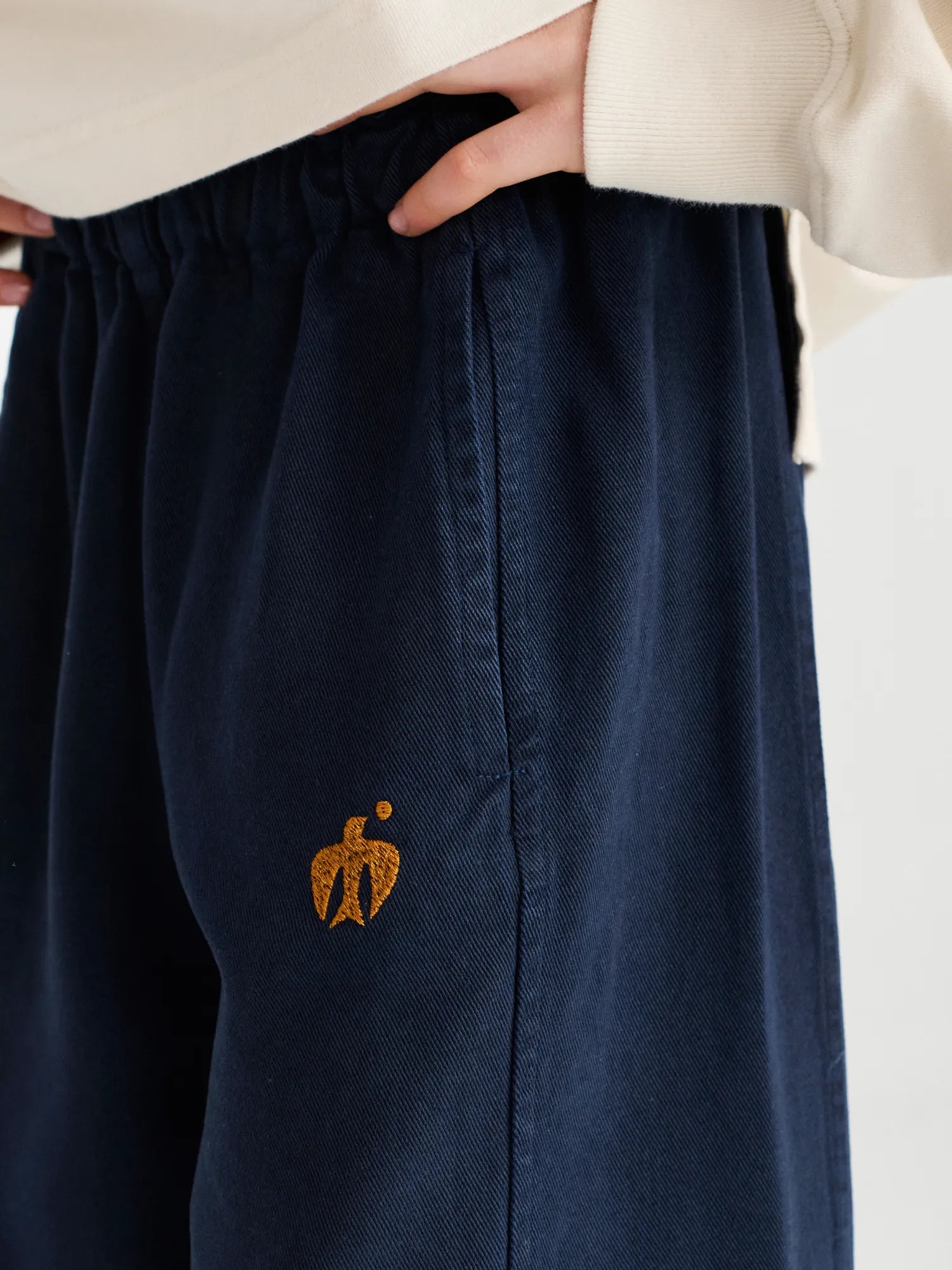 Trousers nº13 in Navy Blue are made of 70% cotton and 30% recycled cotton. They are designed with an elasticated, ruffled paperbag waist for a comfortable and adjustable fit. They have side pockets and they feature an embroidery of our bird logo in contrast color on the upper right thigh. They have a straight fit. Made in Spain.