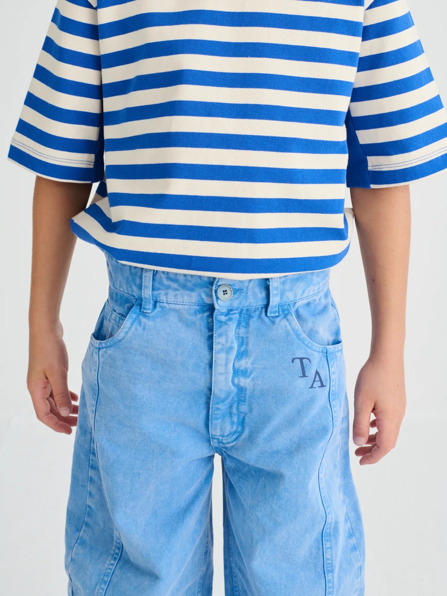 Trousers nº14 in Lichen Blue are made of 100% BCI cotton. These highly detailed pants feature our TA logo embroidered on the front and they are designed with front slash pockets - including a coin pocket - and back patch pockets. They have front zip and button fastening and have a straight fit. Made in Spain.