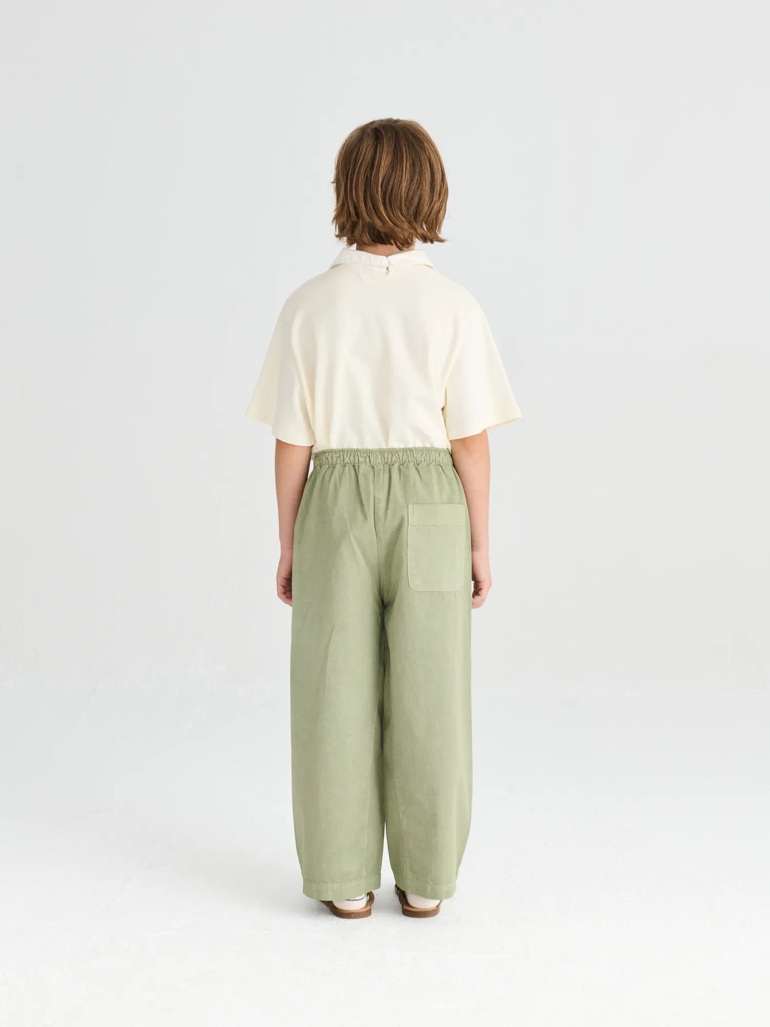 Trousers nº15 in Sage are made 100% organic cotton. These woven pants are designed with elastic waistband and they feature our seasonal T.A. print on the front. They have a fake button and fly on the front and a buttoned coin pocket. They have a loose fit. Made in Spain.