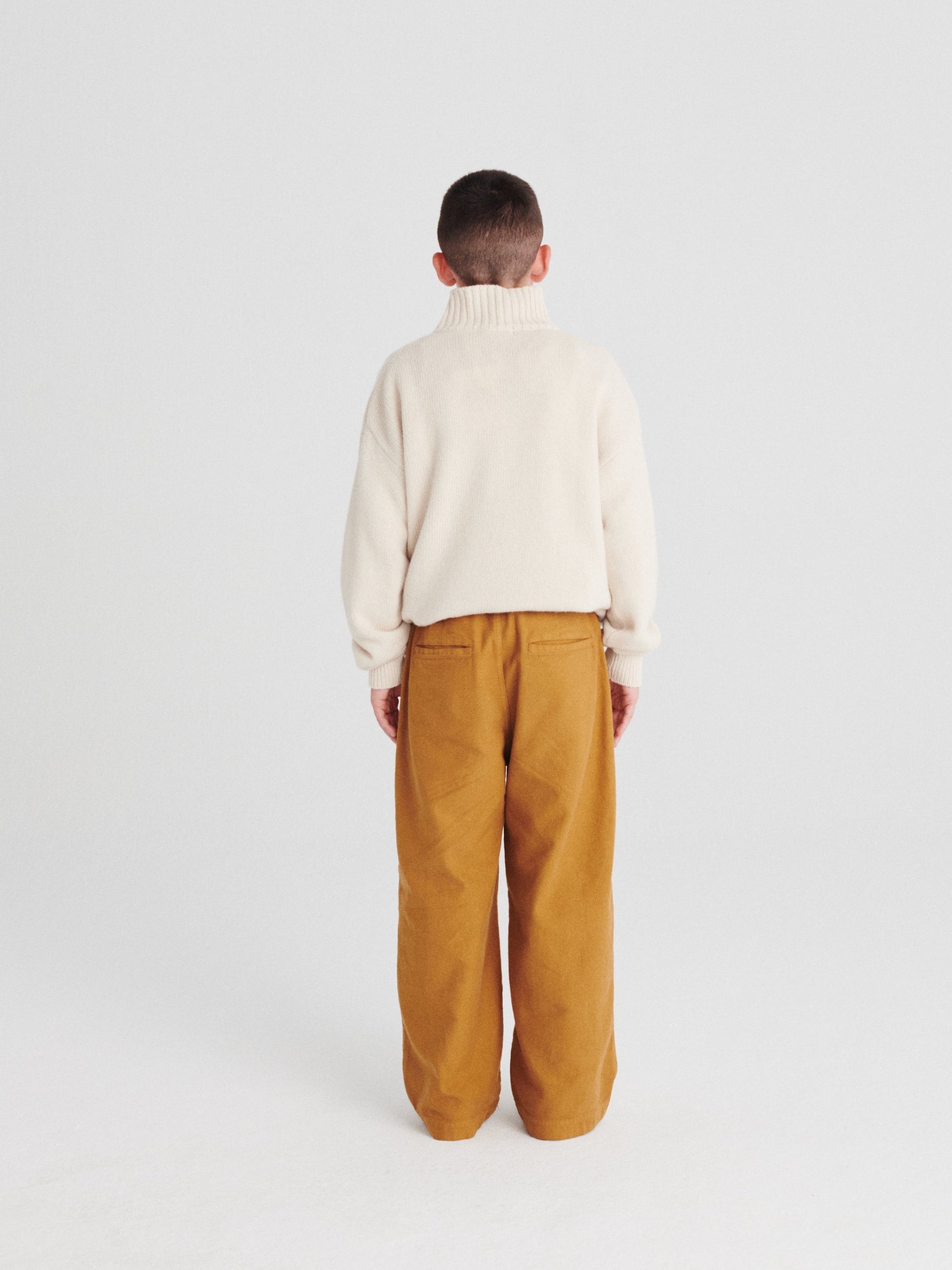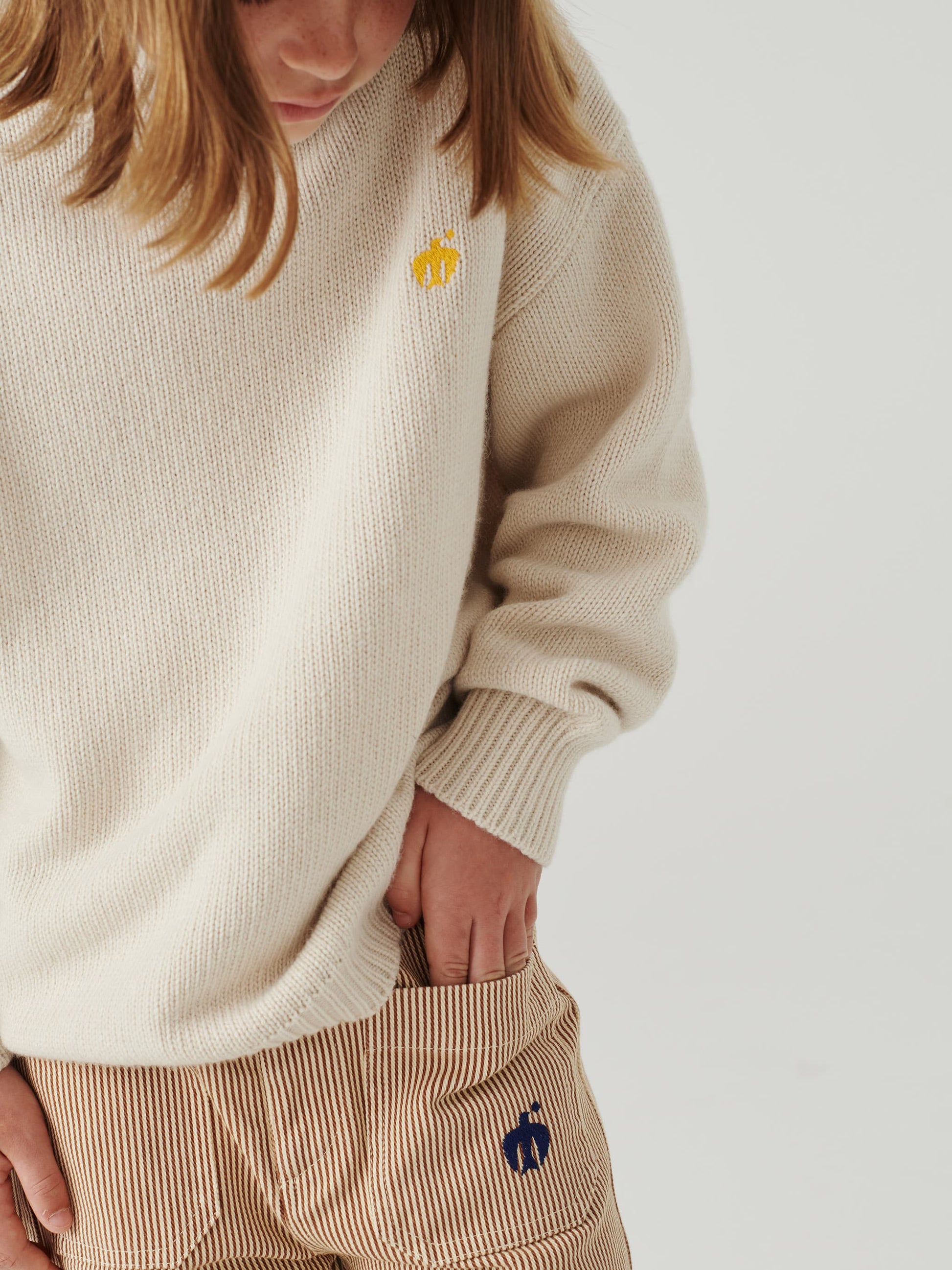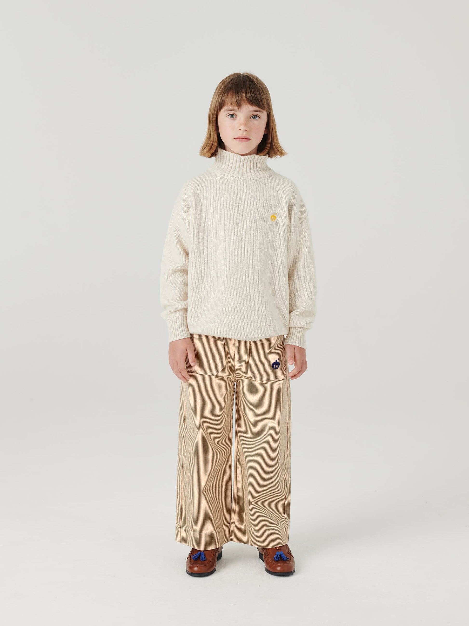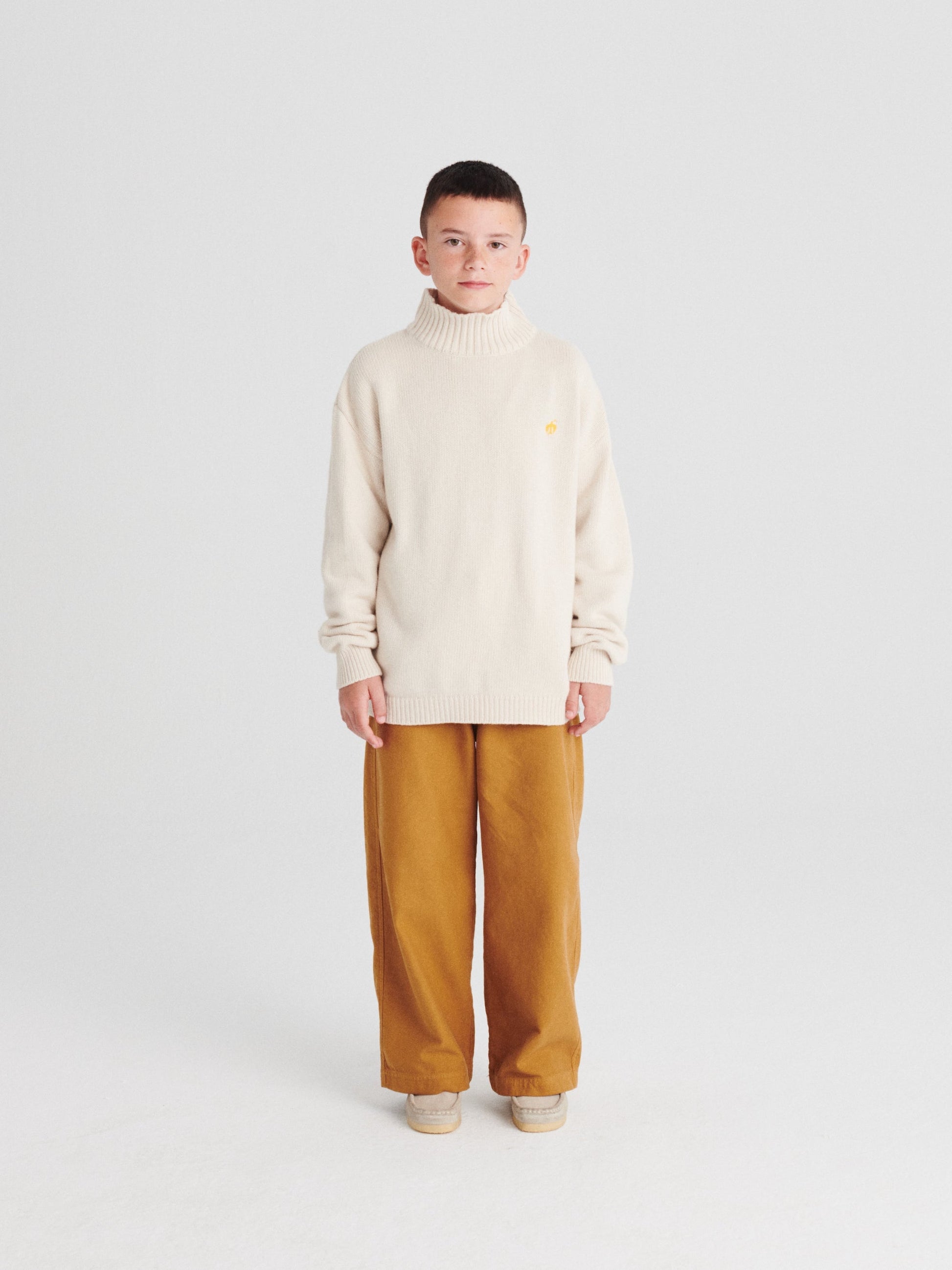 Jumper nº01 in Marble White is made of 35% polyamide, 30% wool, 30% viscose and 5% cashemire. This turtle neck jumper is designed with dropped shoulders, ribbed cuffs and bottom and has our bird logo in yellow embroidered on the chest. It has a loose fit. Made in Spain.